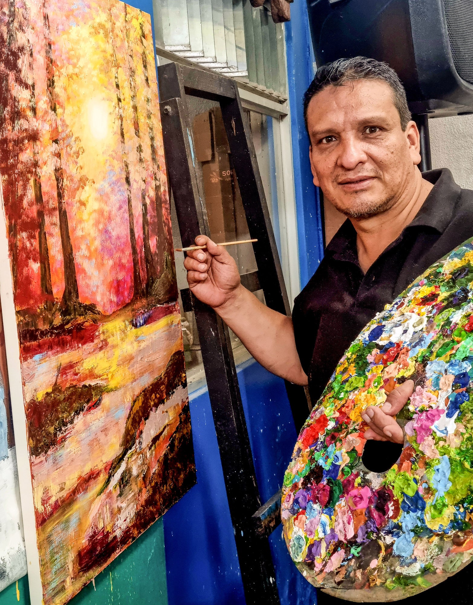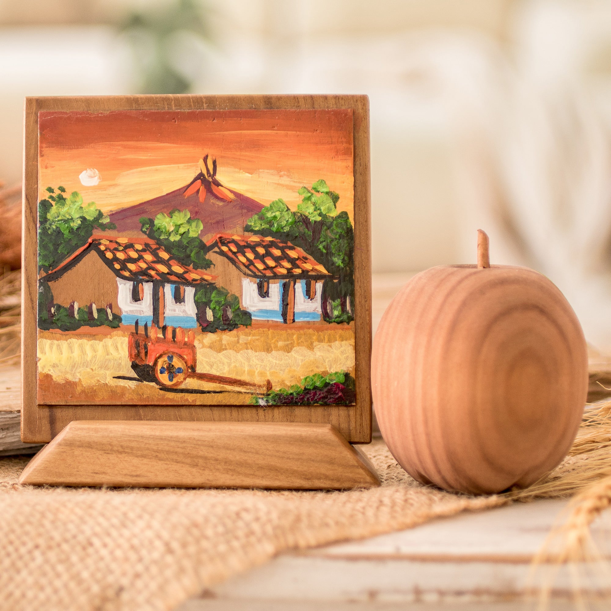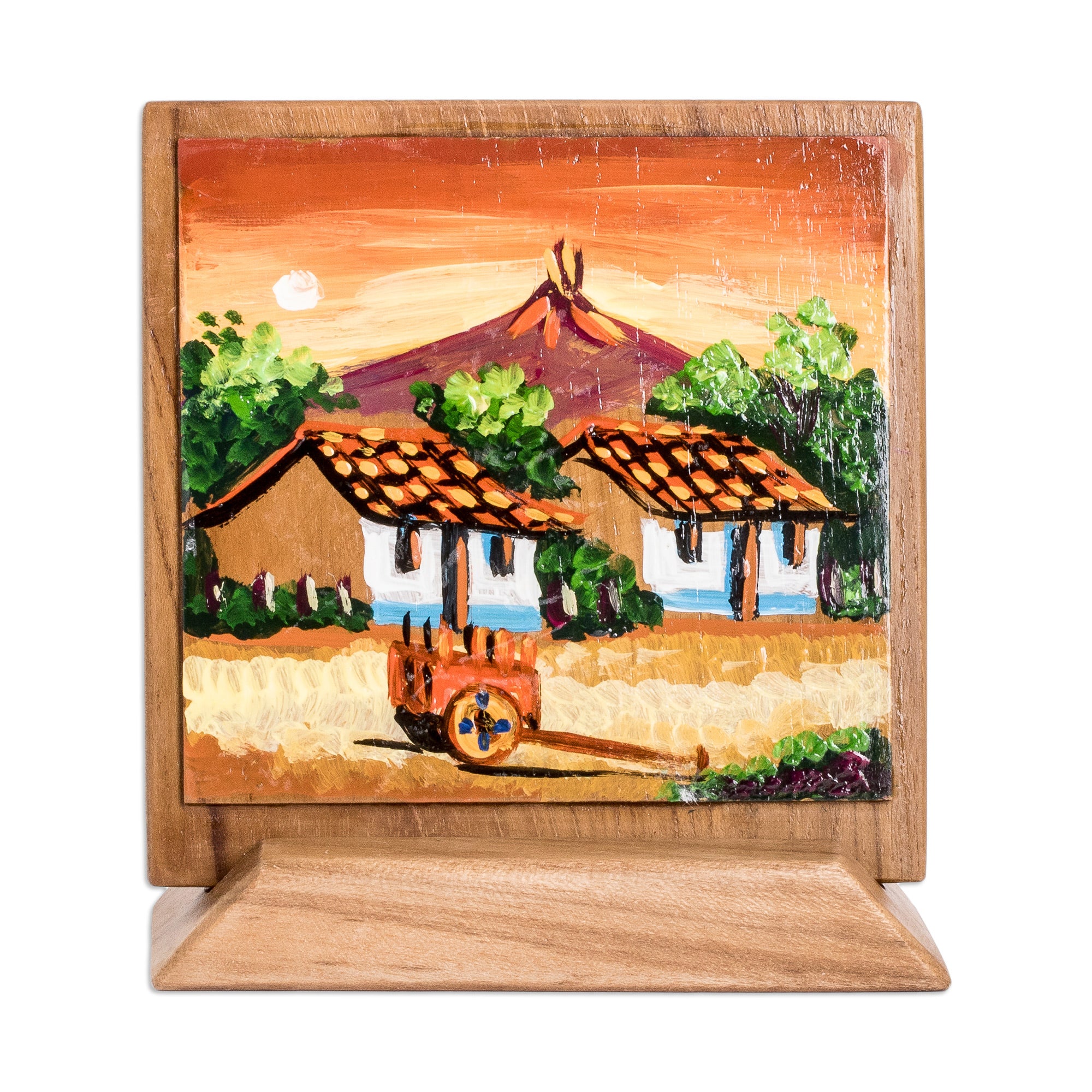 This delightful decorative accent from Costa Rican artisan Jorge Leiton will infuse your home with color and warmth. Meticulously handcrafted from pinewood and painted by hand, it depicts a country landscape of two farmhouses by sundown with a majestic volcano in the background, evoking the lively culture and abundant nature of Leiton's homeland. Compact in size yet big in visual impact, this lovely accessory comes with a stand and brass hanger so you can display it anywhere you like. It is coated for a durable finish, ensuring long-lasting vibrancy and charm.