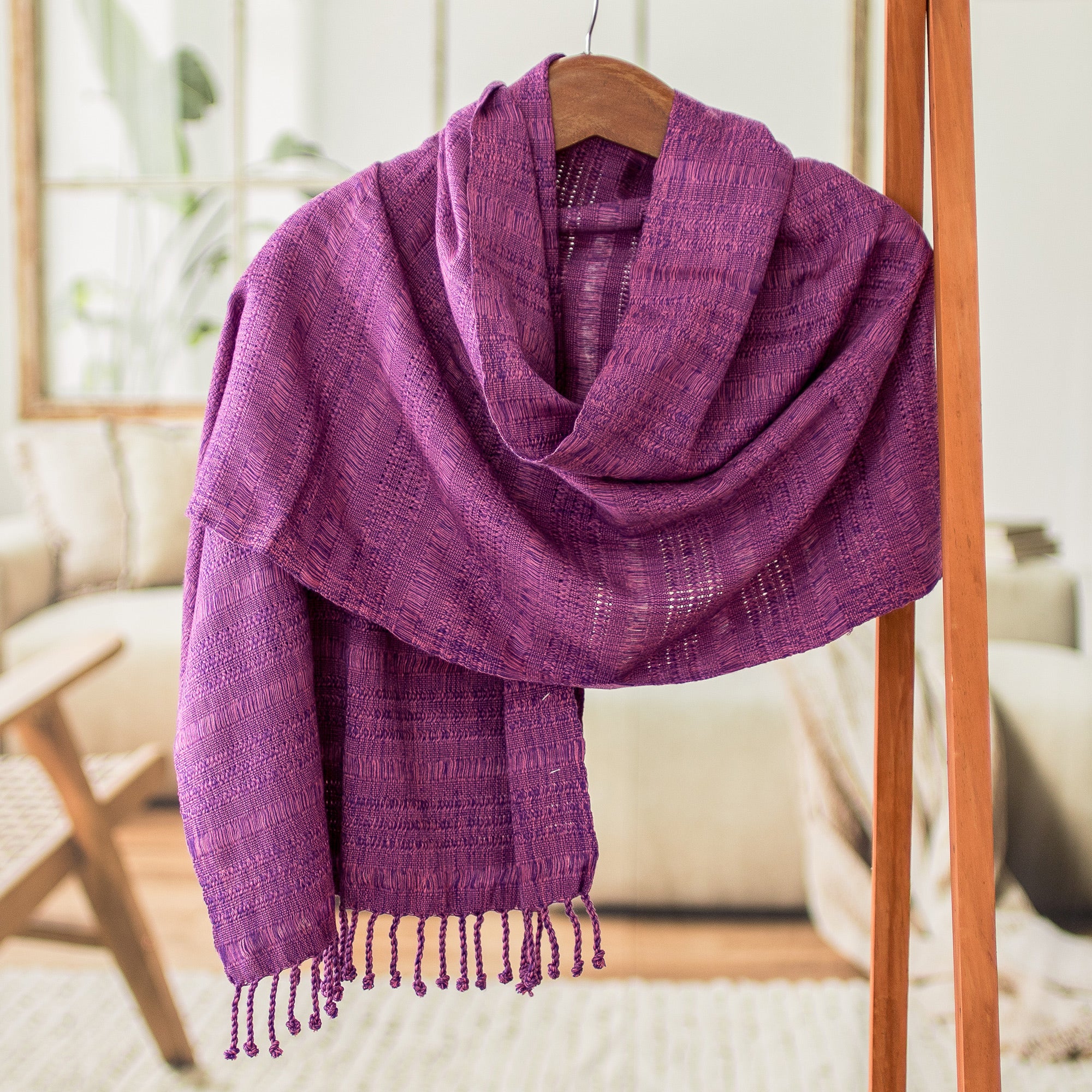 Surrender to the enchantment of this alluring scarf showcasing opulent textures, delicate fringes and a vivid array of pink and purple shades. Meticulously designed by Guatemala's Elena Ixtamer, this striking accessory is skillfully hand-woven from cotton, offering a fabulous way to incorporate a splash of color into your fashion repertoire.