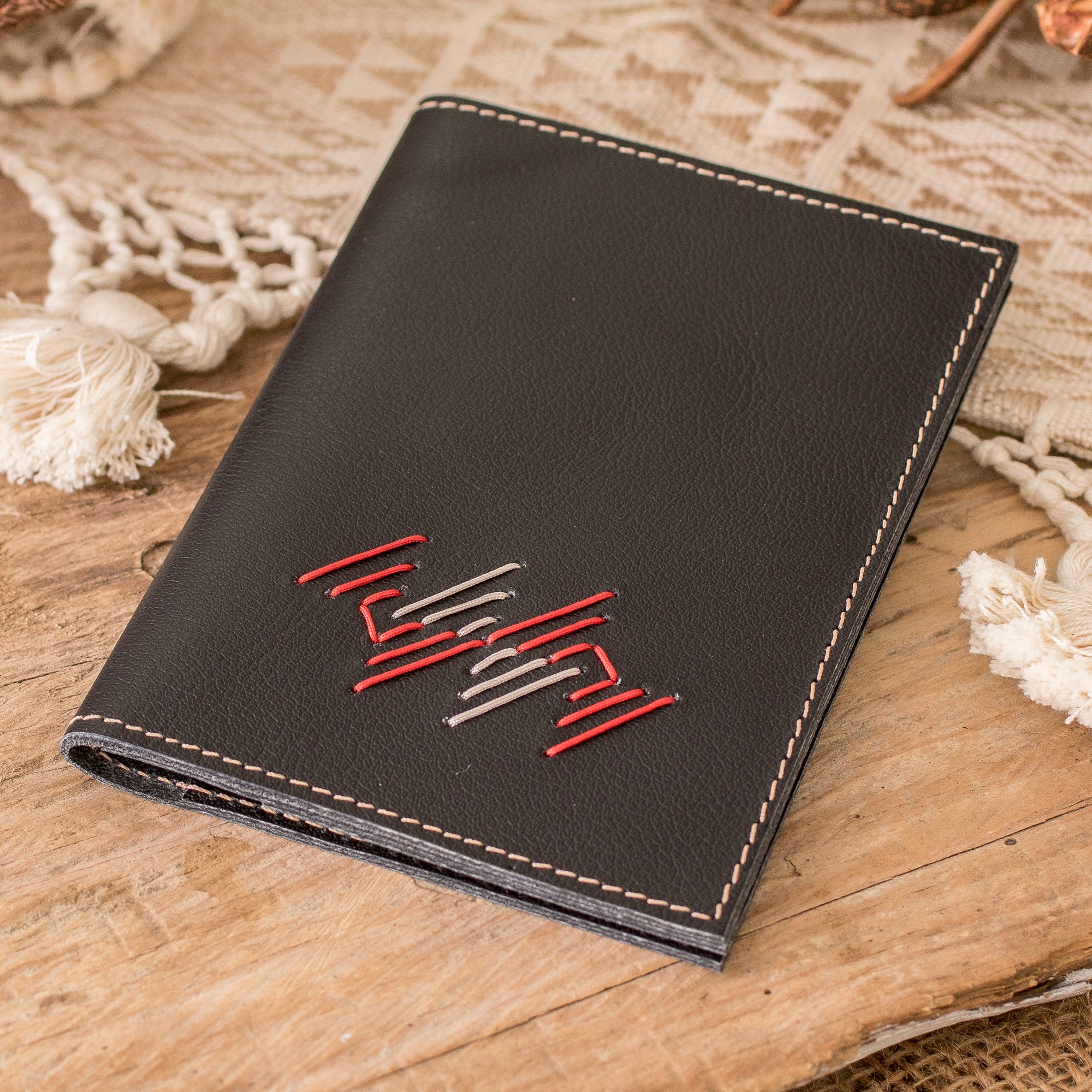 Make a statement on your travels with this stunning passport holder meticulously handcrafted from luxurious black leather and adorned with captivating geometric motifs in vibrant red and grey shades. Guatemalan artisans Erick and Ivania’s practical yet chic design boasts ample space with one large compartment and two smaller ones, ensuring your documents and cards stay secure and organized in style.