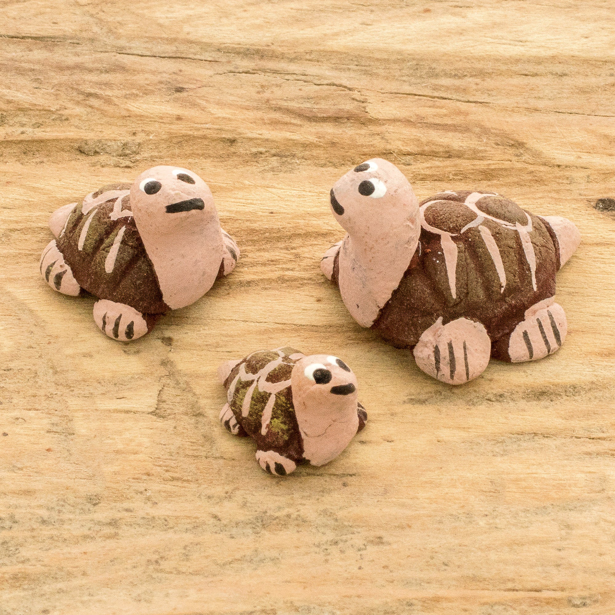 A tortoise mother, father and son compose this set of three figurines designed by Guatemalan artisan Jose Arriola following ancestral Mayan techniques to work ceramics. The figurines are given a coat of acrylic paint and feature a rustic finish that makes them really unique.