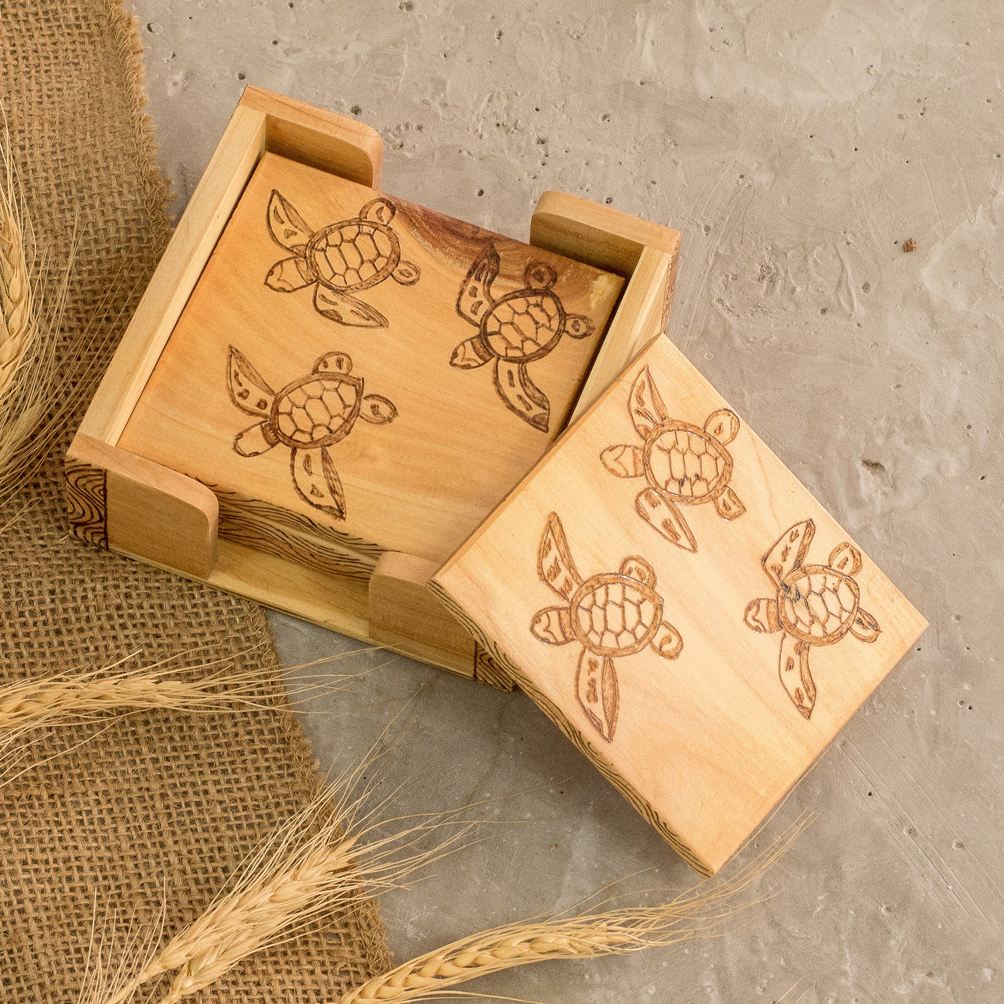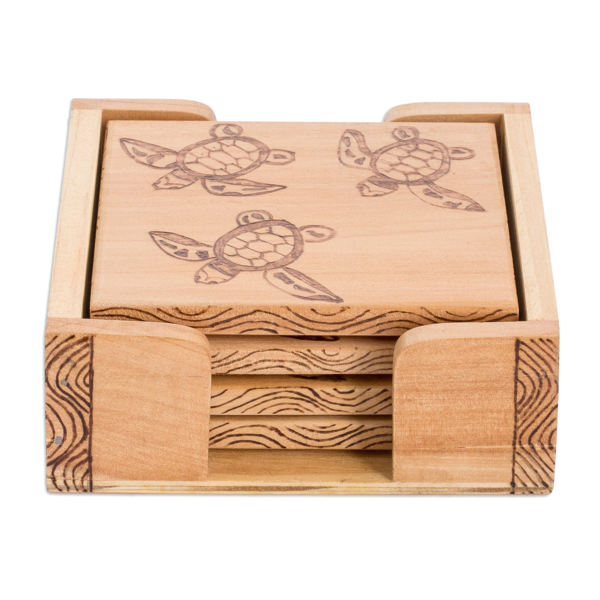 Set of 4 Turtle-Themed Laurel Wood Coasters with Storage Box - Turtle's Drinks | NOVICA