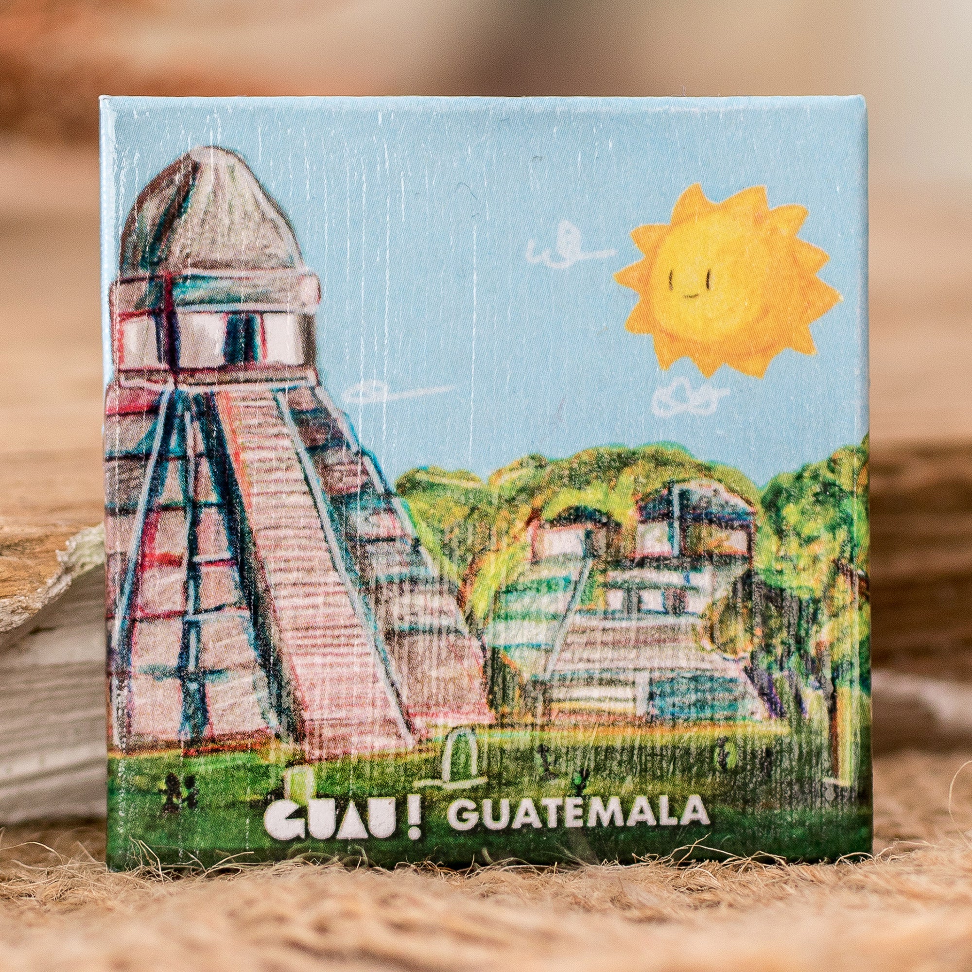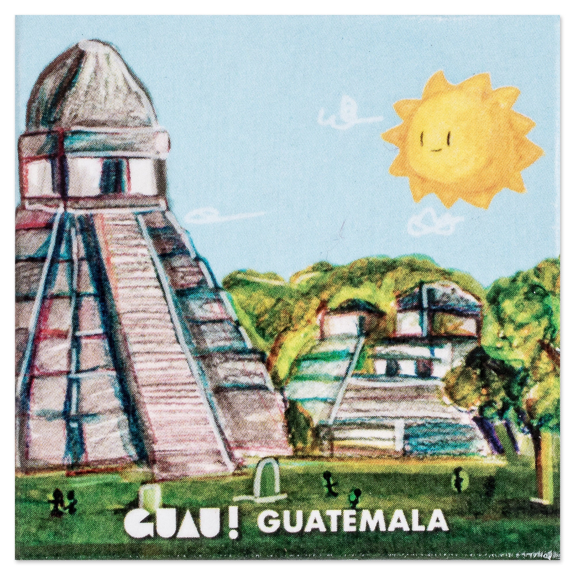 The magnificent view of the Tikal relives a history of splendor and union with the universe, honoring the Maya culture. Inspired by Guatemala's ancient era, Gaby Briz and a talented artisan team create this cardboard magnet accented with a majestic composition in bright hues. The accessory is also decorated with the Spanish phrase Guau! Guatemala as a nod to the nation's marvelous complexes.