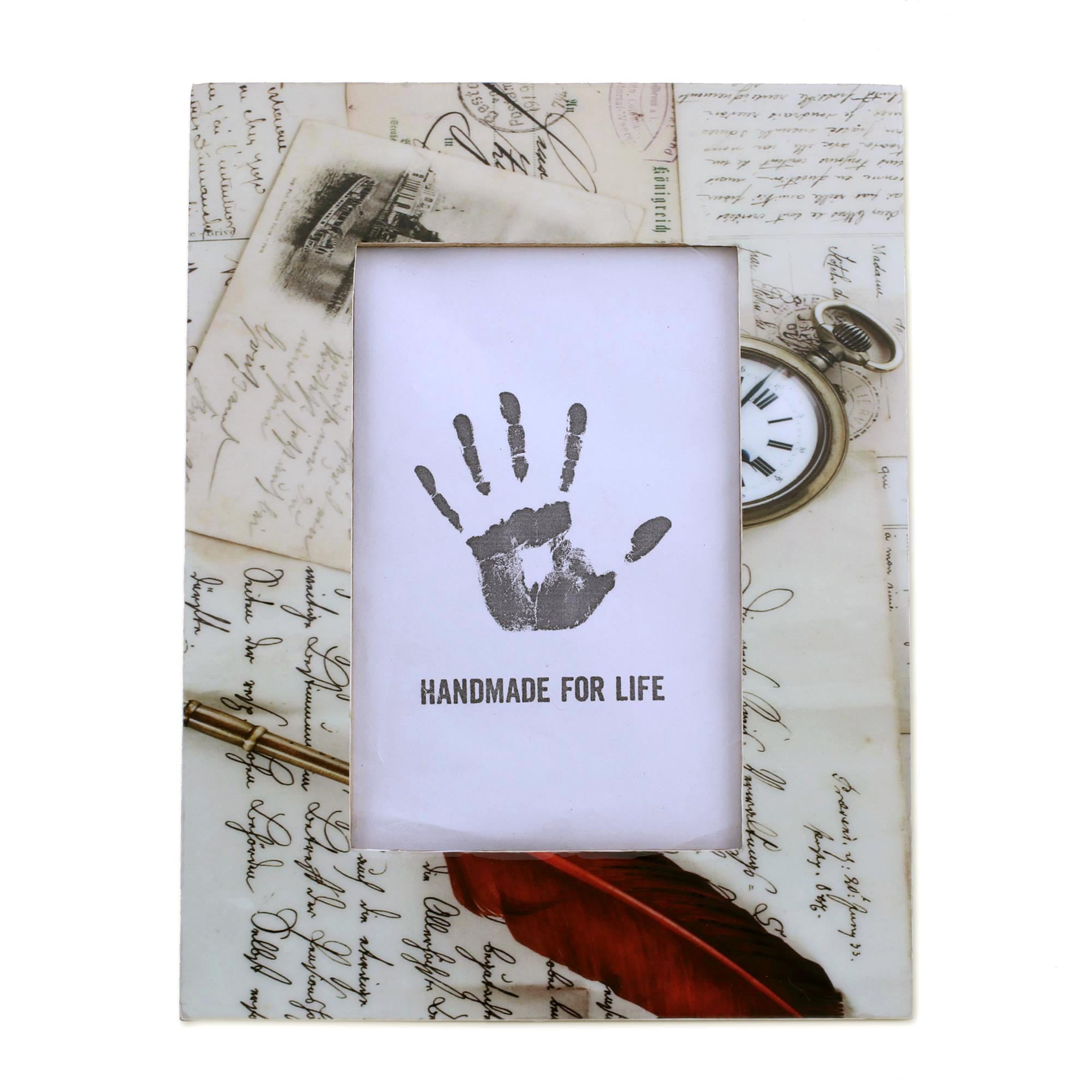 The laminated image of old correspondence with a timepiece and a feather quill decorates the rectangular shape of this wood photo frame, presented by Kamal. Indian artisans create this piece of home decor, offering a fantastic accessory for displaying your cherished memories.