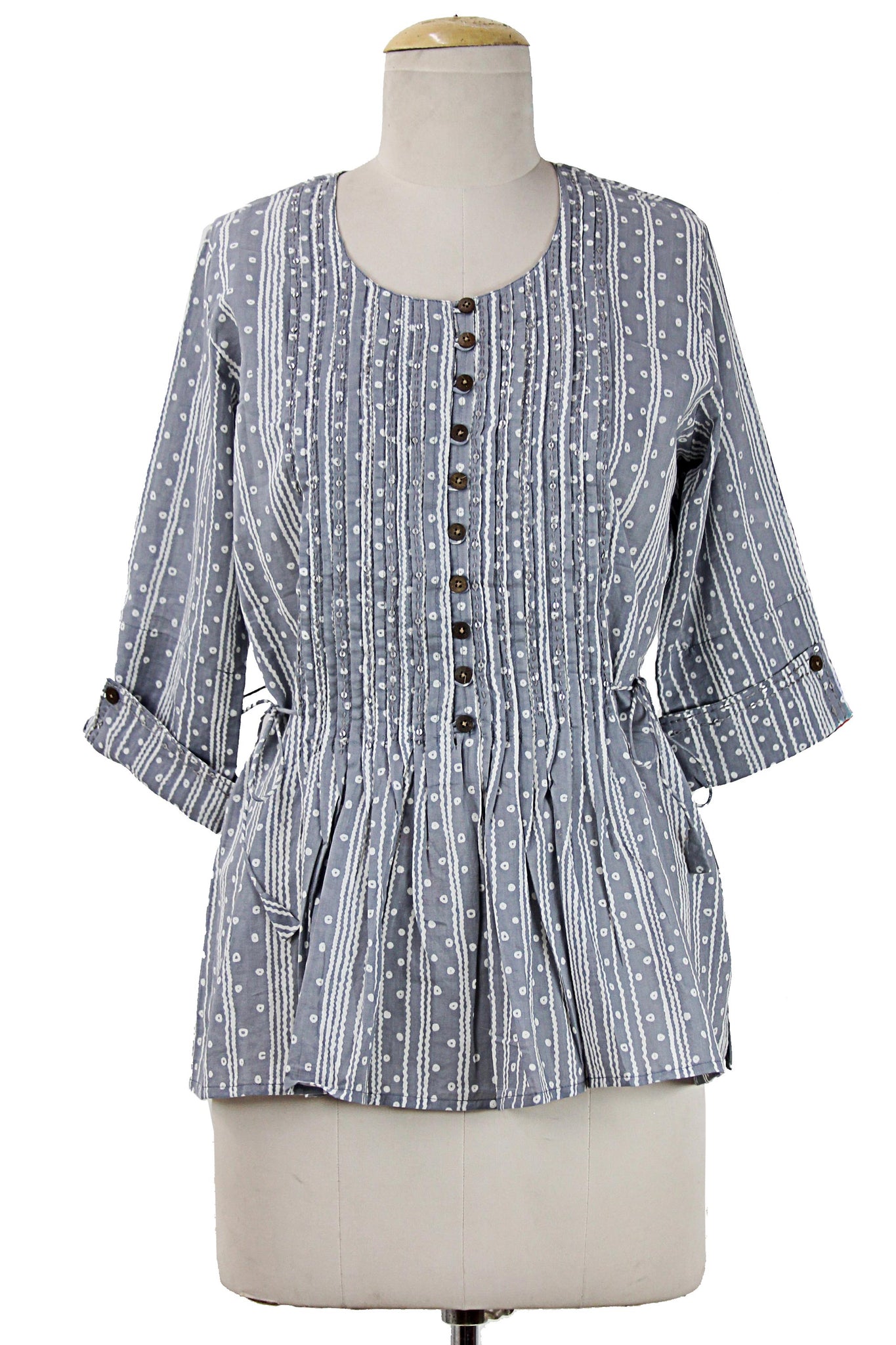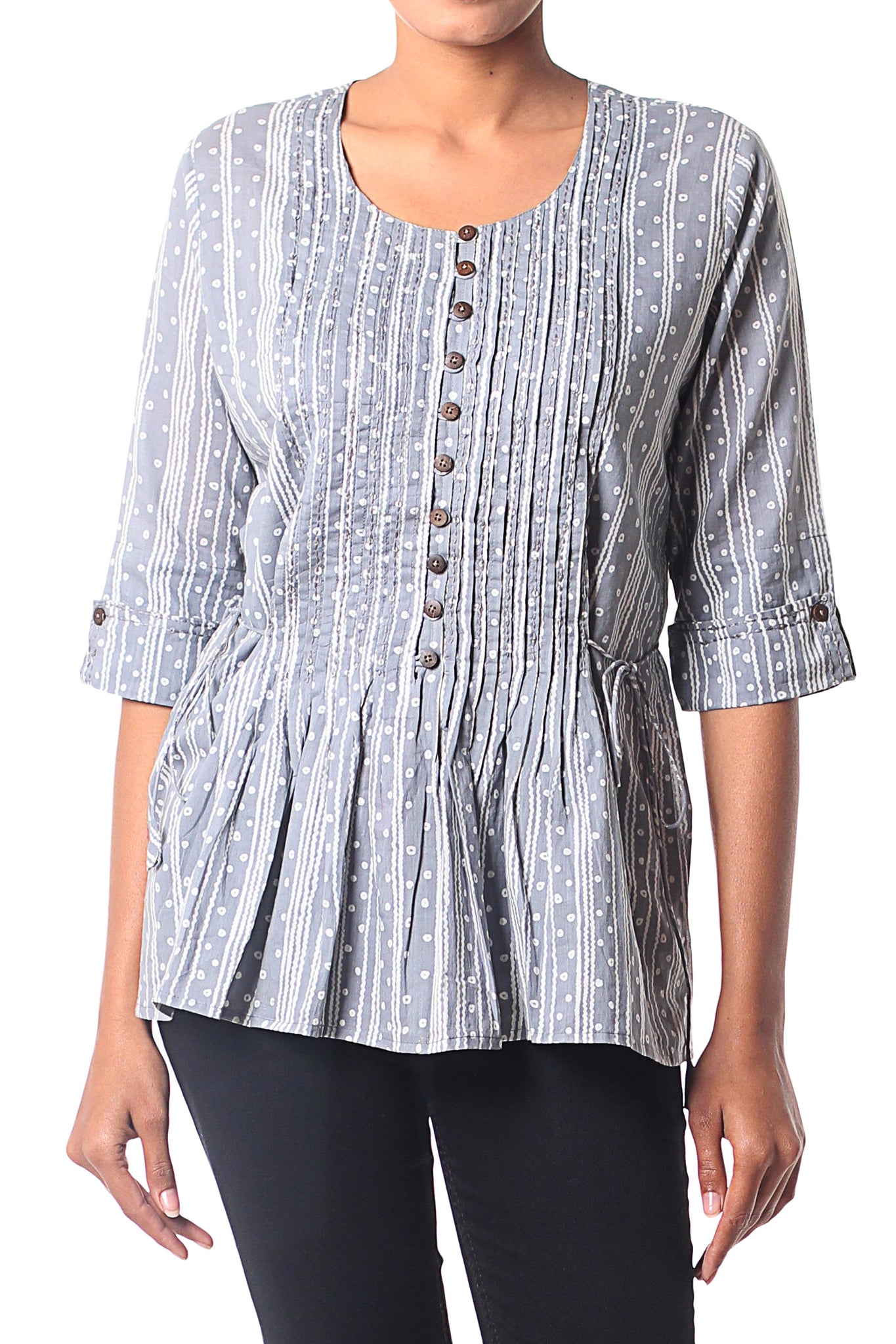 Ritu Agnihotri of India presents this casual grey cotton blouse, featuring a stunning motif in white. Artisans use a traditional block printing technique to create a rippled line and bubble motif. This blouse features three-fourth sleeves and coconut shell button accents.