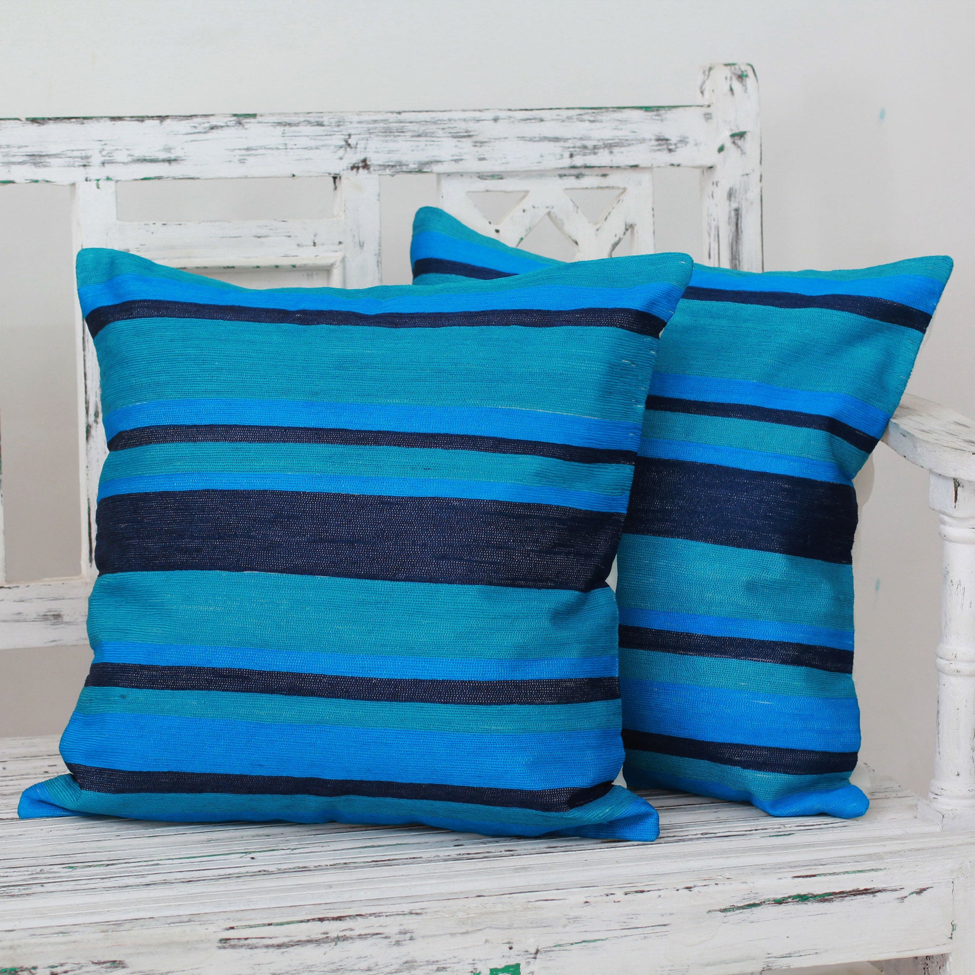 Blue streams of various widths adorn the front of this pair of vivid cushion covers from Seema in India. The aqua, cerulean and dark navy stripes are embroidered on the front panels of the polyester pillow covers; the reverse sides are solid off-white polyester. The covers close with zippers; cushions are not included.