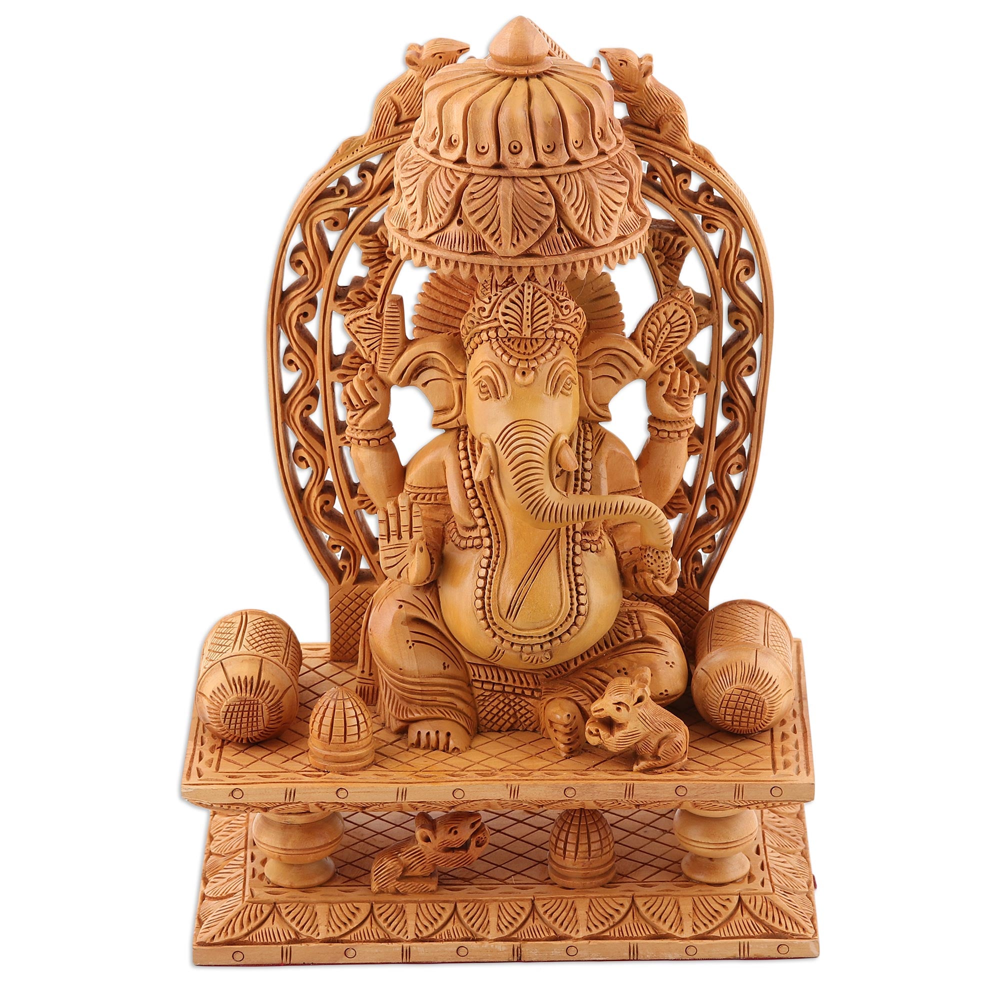 From Suresh and Devender Garg, this finely detailed sculpture honors Lord Ganesha. The beloved man-elephant, Ganesha is the son of Shiva and Durga, and has the power to keep under control the occult forces that bring disaster upon humankind. He holds an axe and lash to protect the world from evil and disaster. On his third hand he holds his favorite dessert, and with his right hand he blesses the faithful. The Hindu deity appears on a lotus throne surrounded by mice, his vehicle to transcend the different plains of life as symbol of the mind's power.