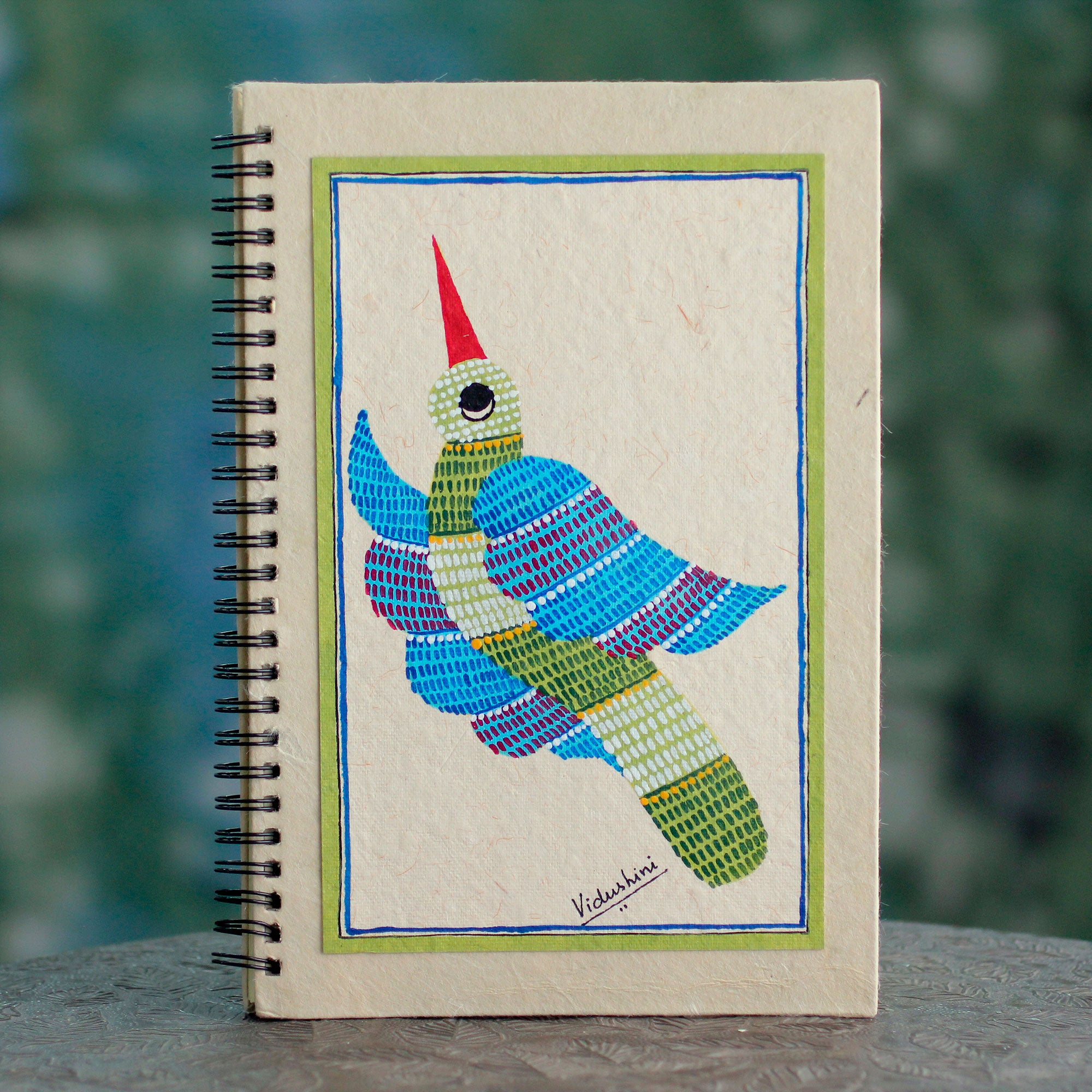 A colorful bird revels in its freedom on the cover of this journal from Vidushini in India. The artisan paints the front cover by hand in the traditional Gond folk art style, which was once used to adorn the walls and floors of a home. The journal is made of handmade paper and features 40 unlined pages and a spiral binding.
