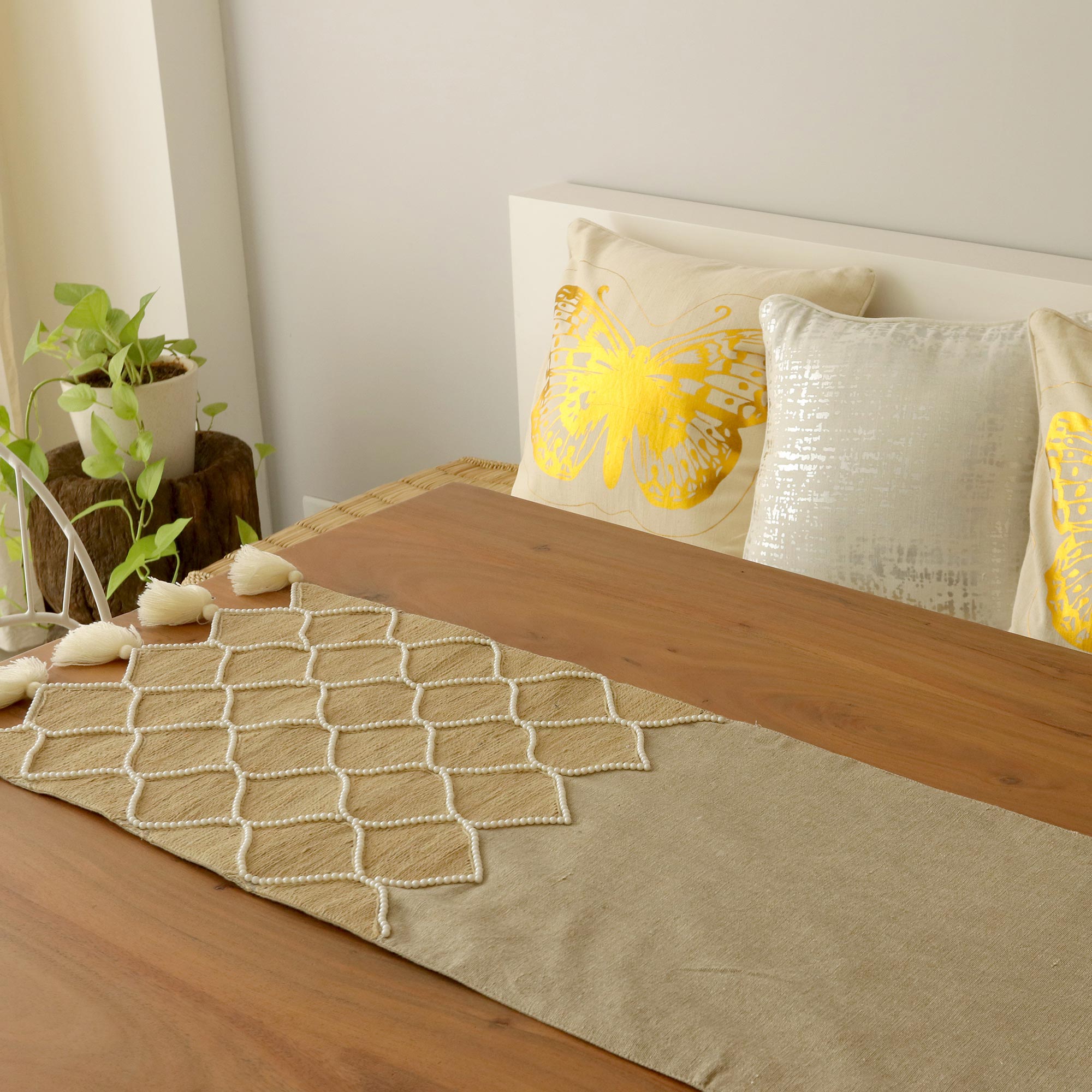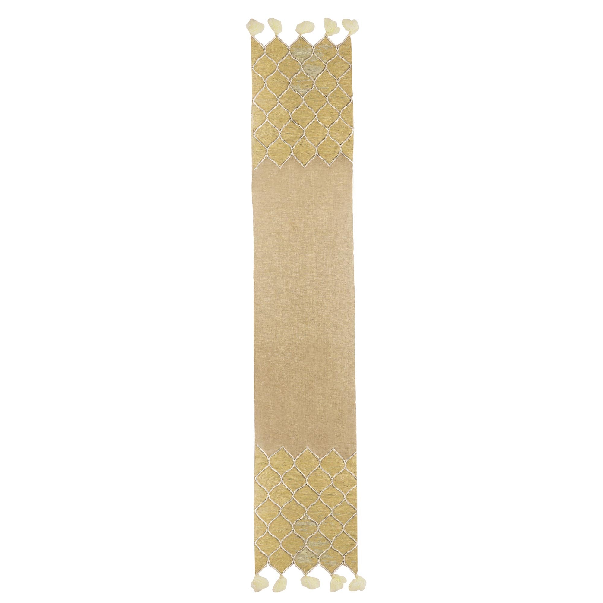 India's Seema presents this gorgeous embroidered cotton table runner for your dining room. A beaded embroidered honeycomb motif made from jute contrasts gorgeously against a beige background. This table runner features tassels on each end.