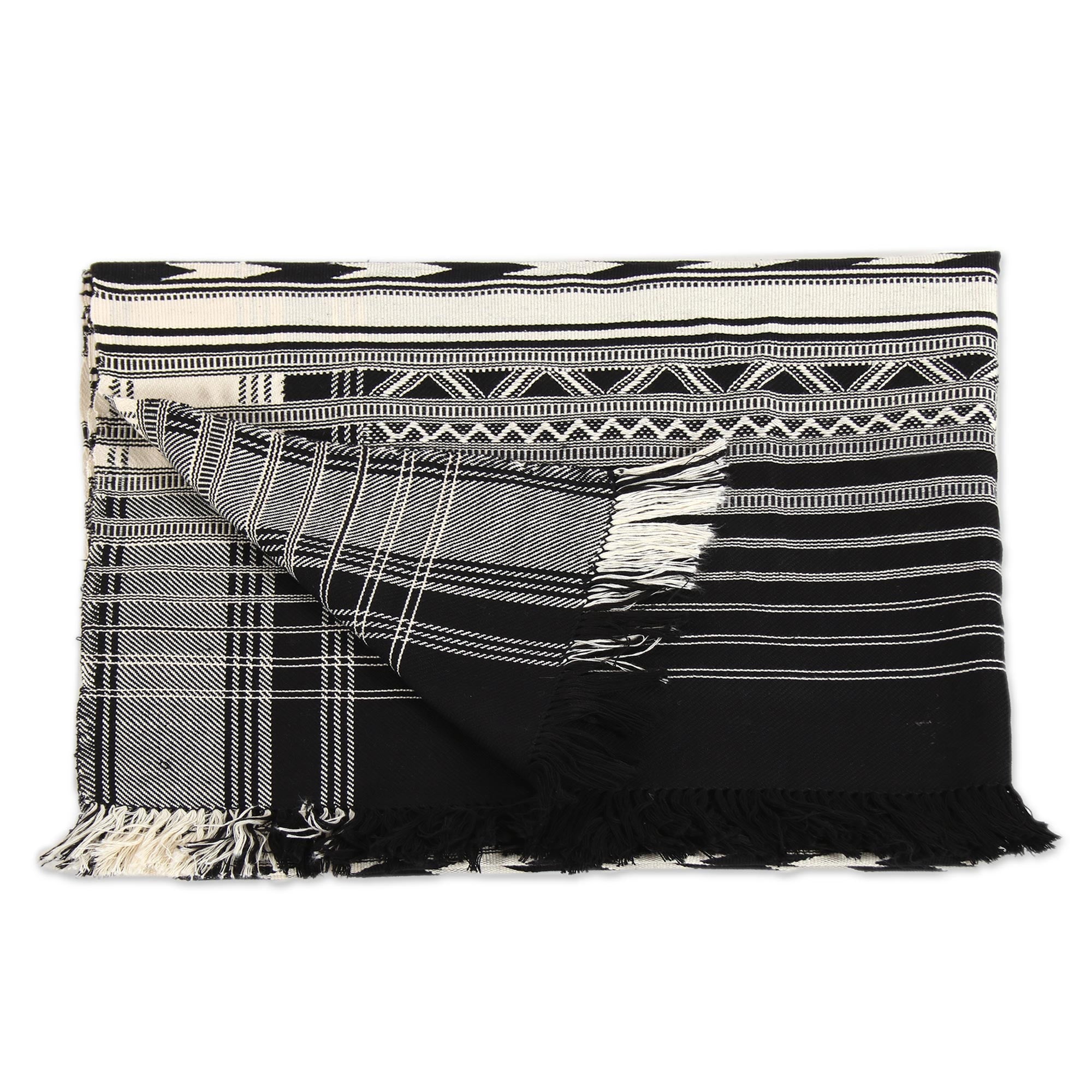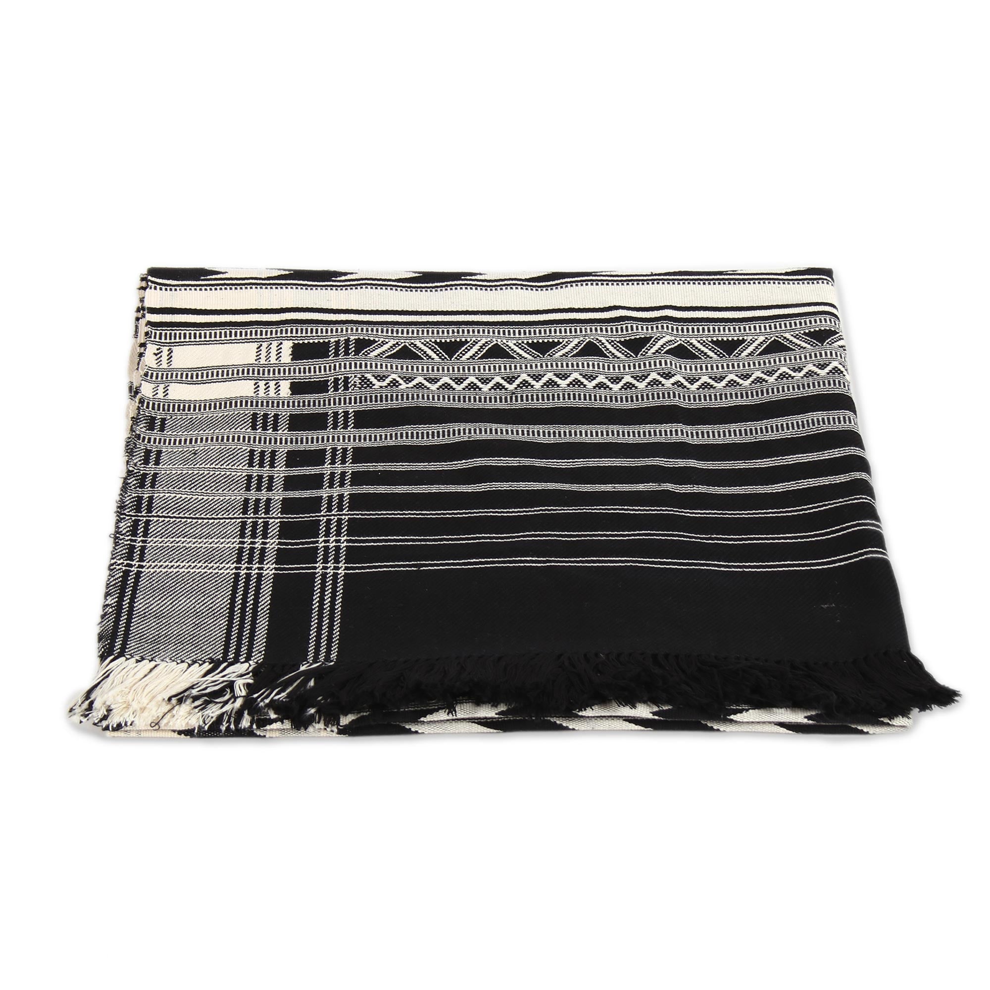 Myriad patterns dance in symmetrical elegance to the rhythm of black and white undertones. They adorn a cotton throw that is masterfully woven by UMBVS Desert Weavers of India.