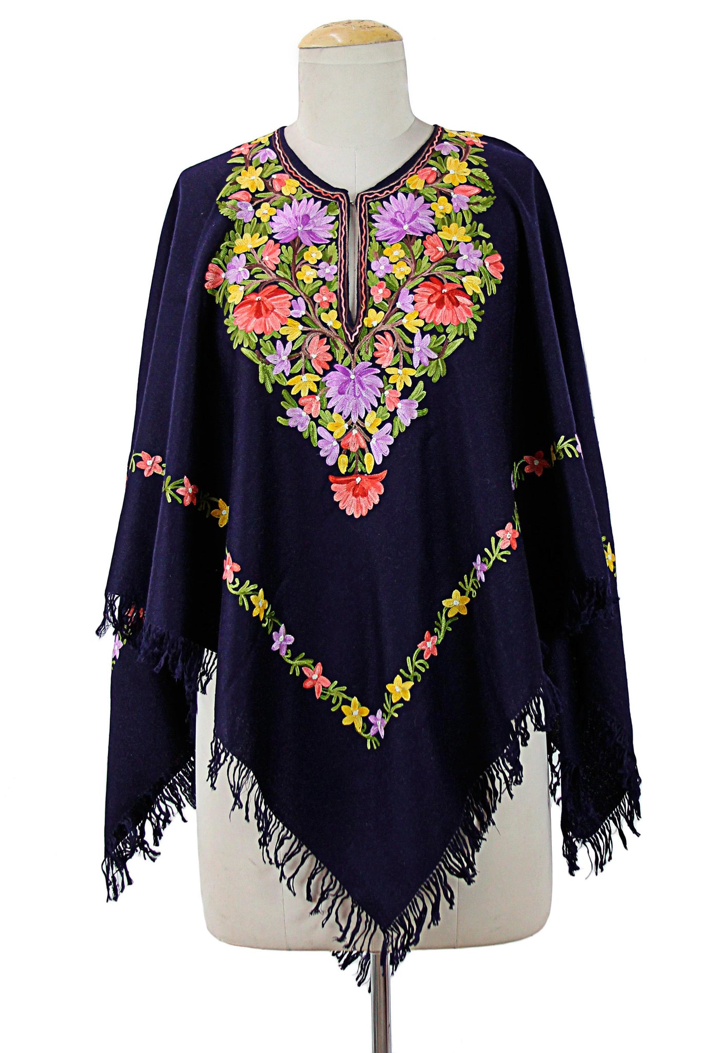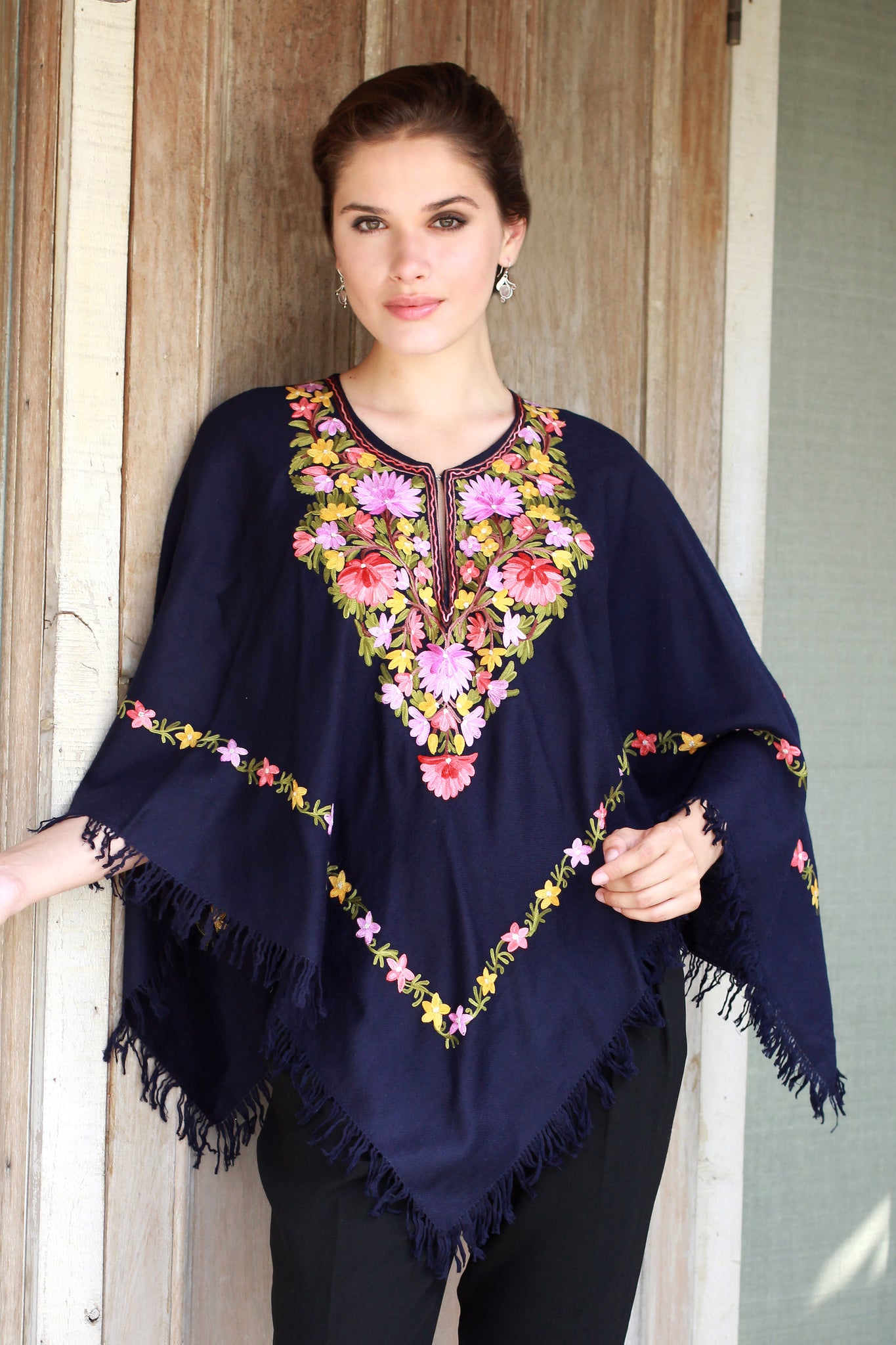 Breathtakingly detailed with aari embroidery, this lovely fringed woolen poncho adds beauty to your day. Once done entirely by hand, aari embroidery dates back to the 12th century and was used to adorn royal Mughal garb. The deep midnight blue wool provides a rich backdrop for blossoms of cherry pink, lilac, and yellow accented with green leaves. The neck can be secured with a hook and eye closure.