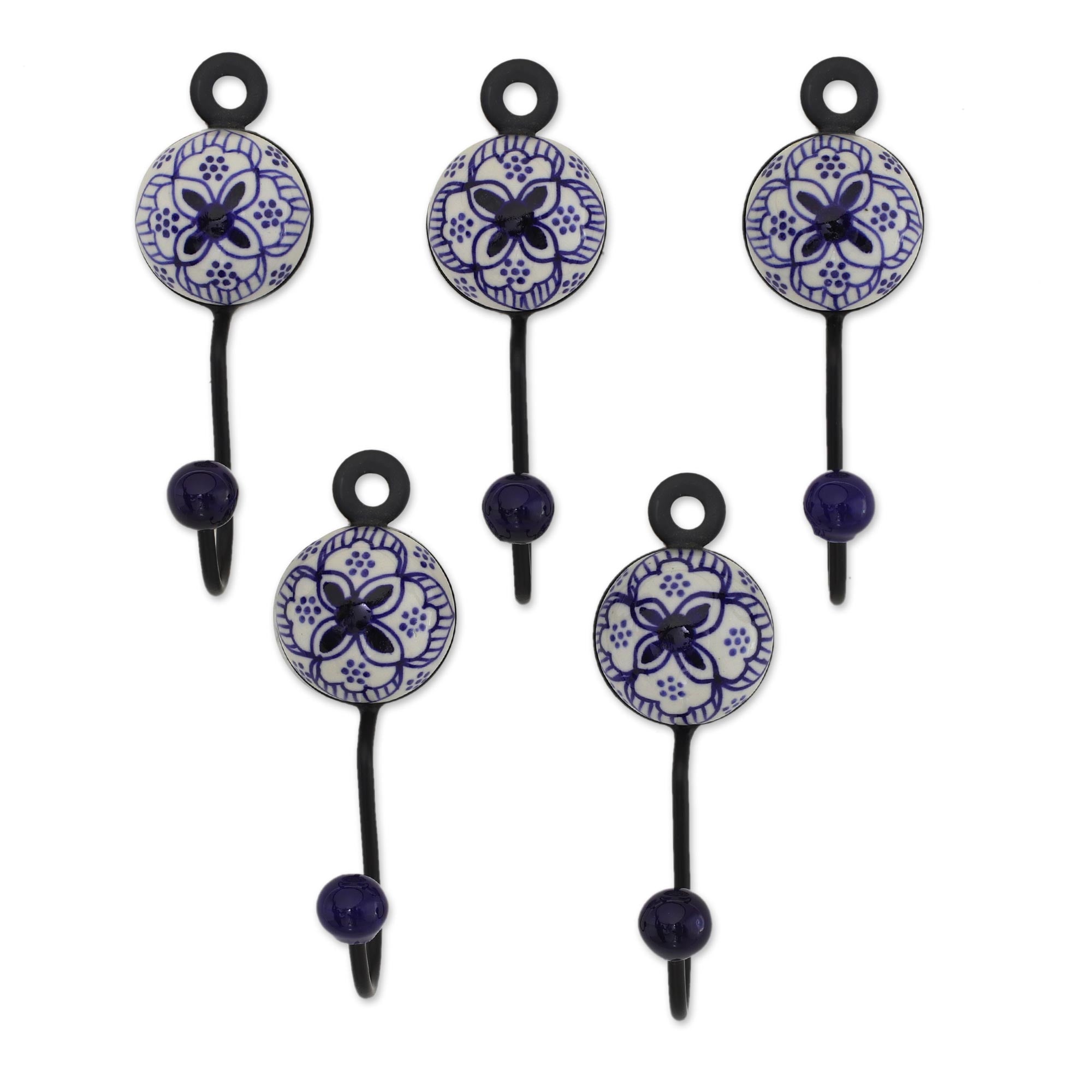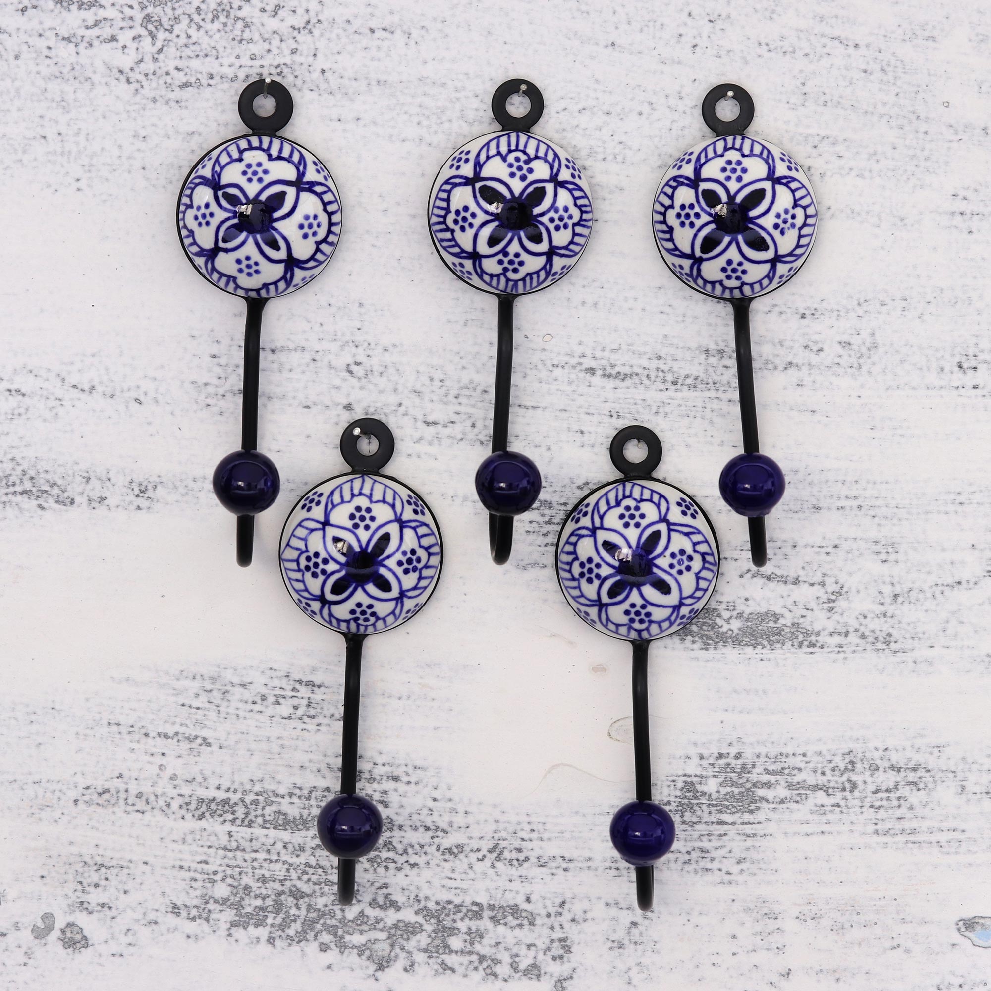 Painted by hand with charming blue floral motifs, five ceramic knobs decorate this set of coat hooks. Khalid Ali presents the set, outfitted with brass hooks for a handy and decorative addition to your home.