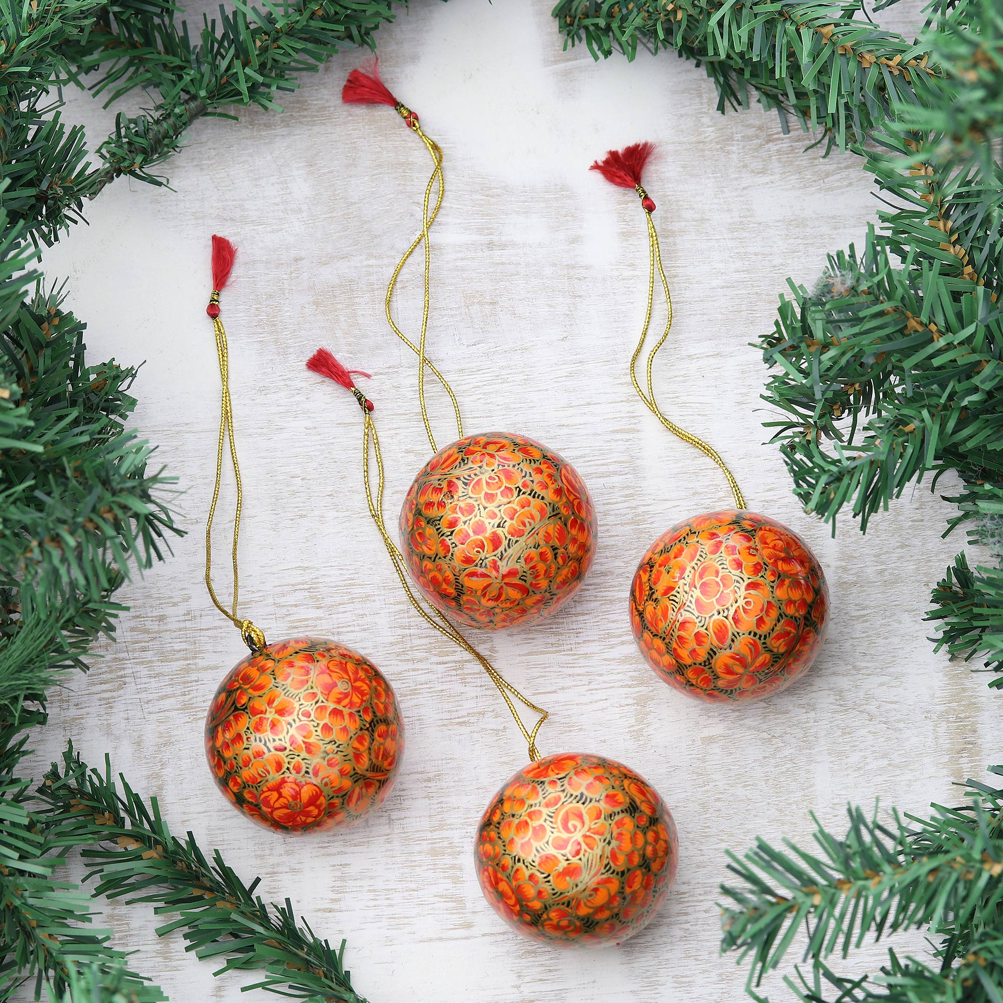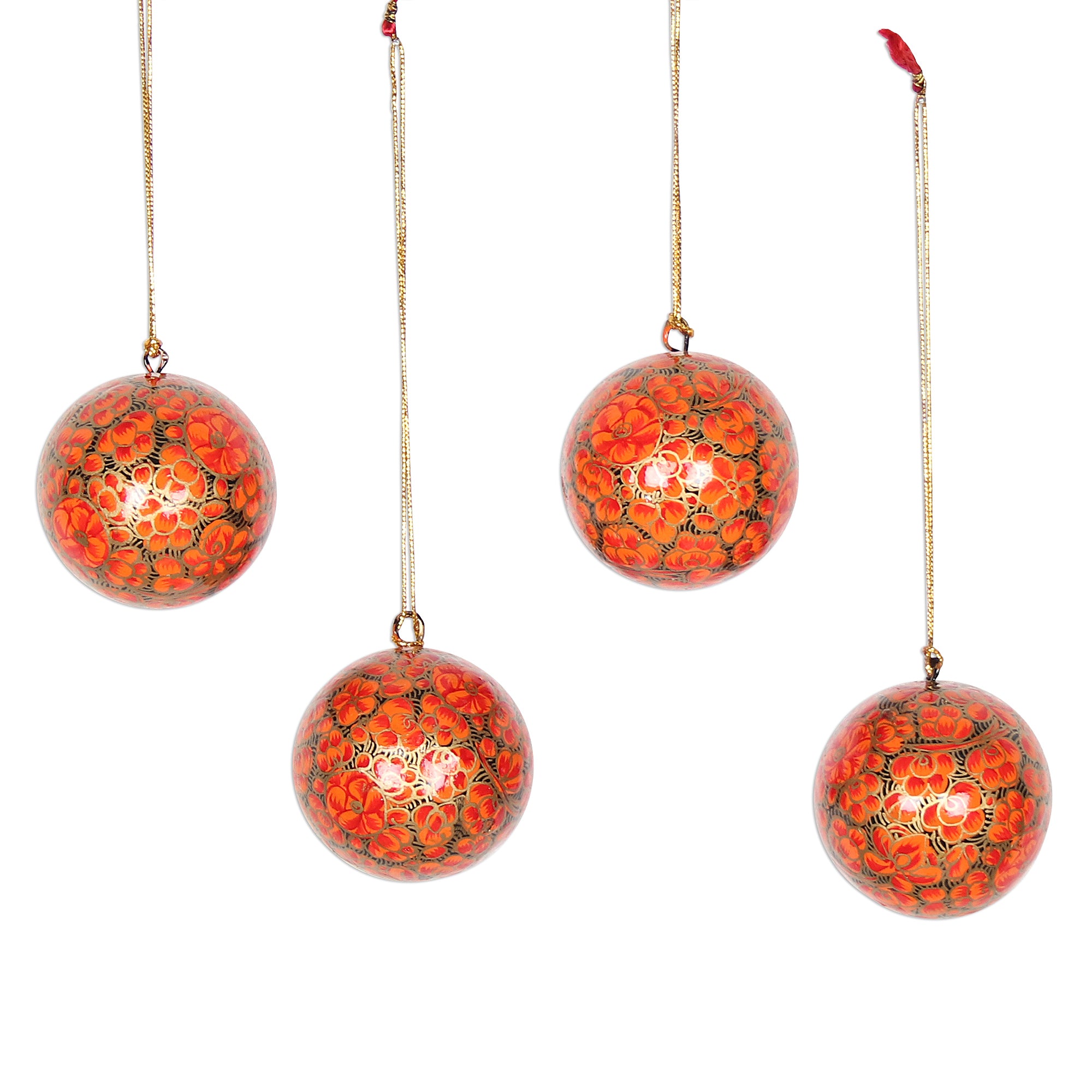 Hand-painted with fiery red and orange floral motifs, these four papier mache ornaments are designed by Indian artisan Sajad. Each ornament dangles from a golden cord with a red tassel.
