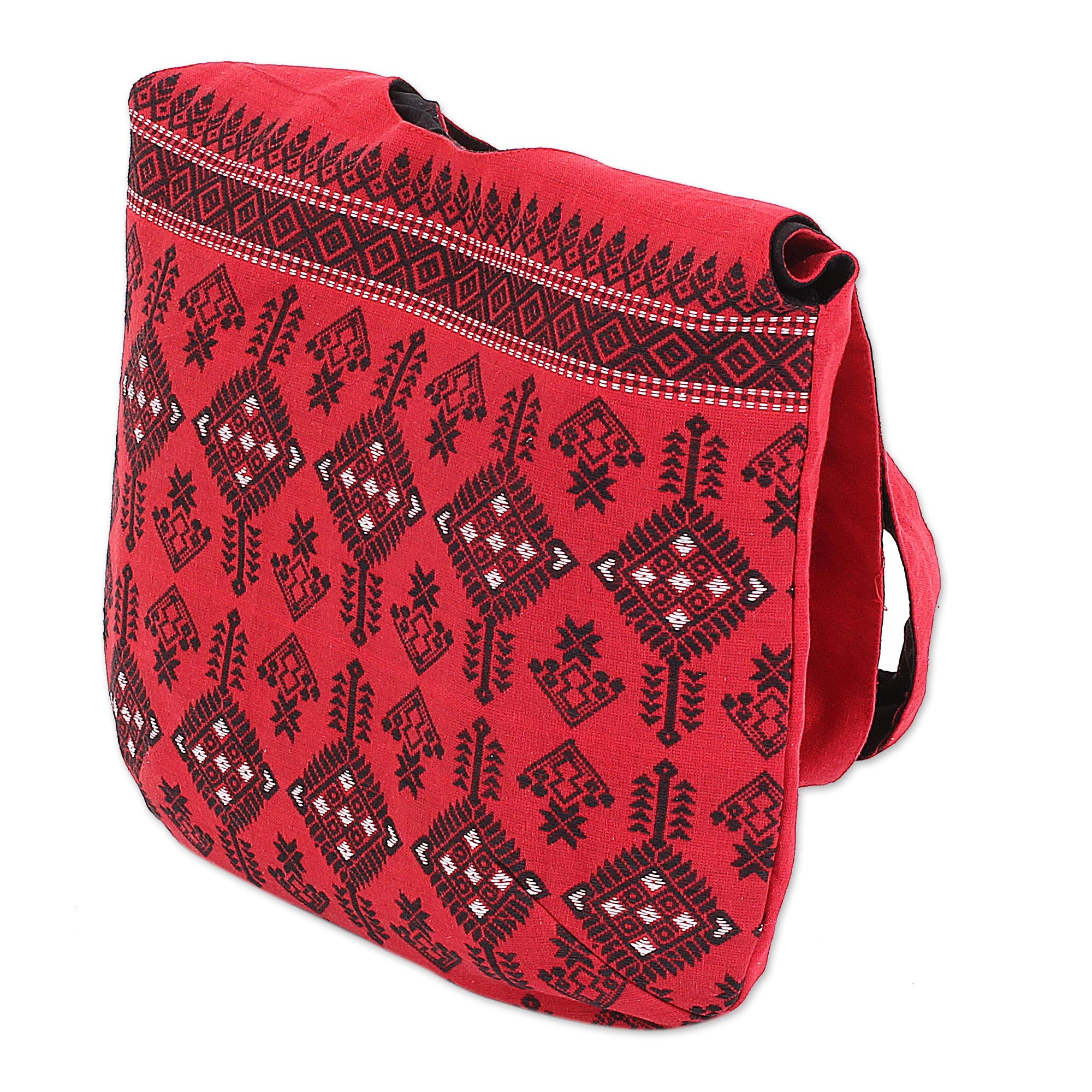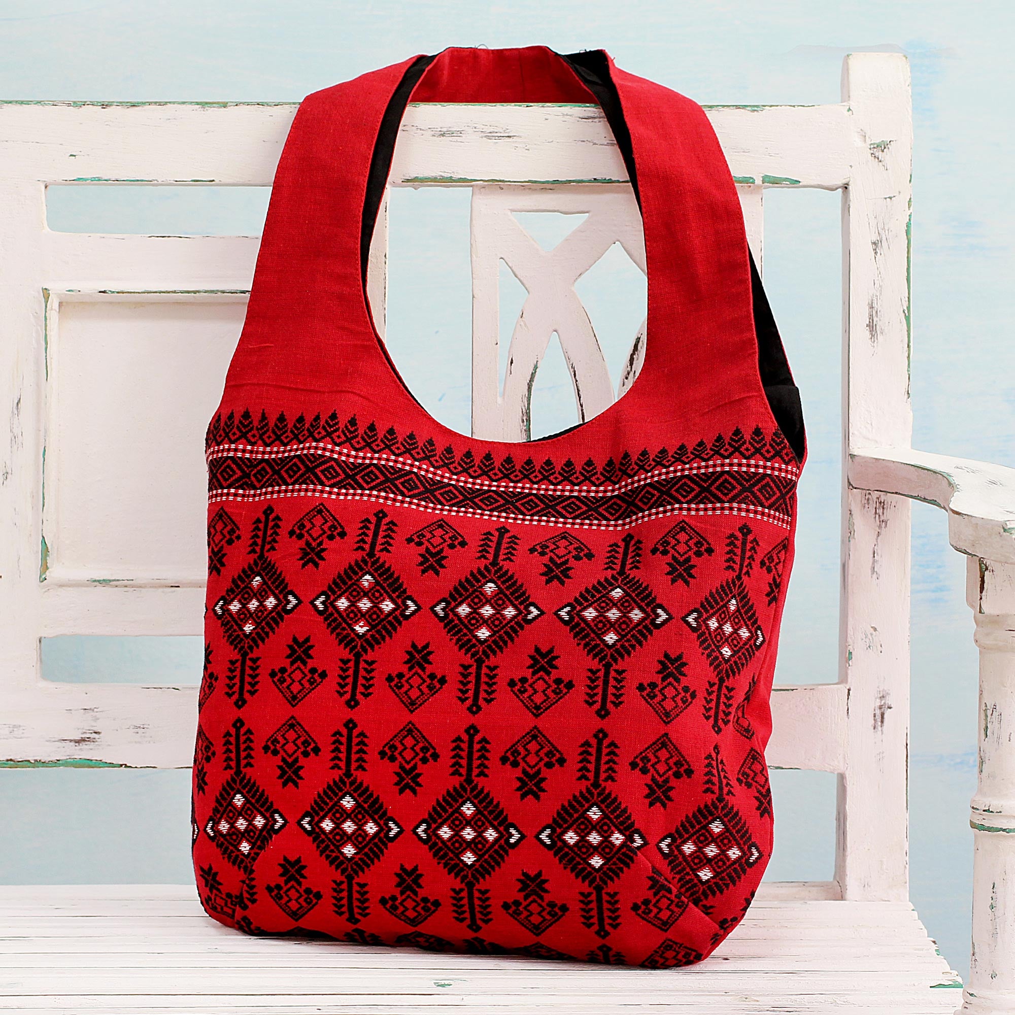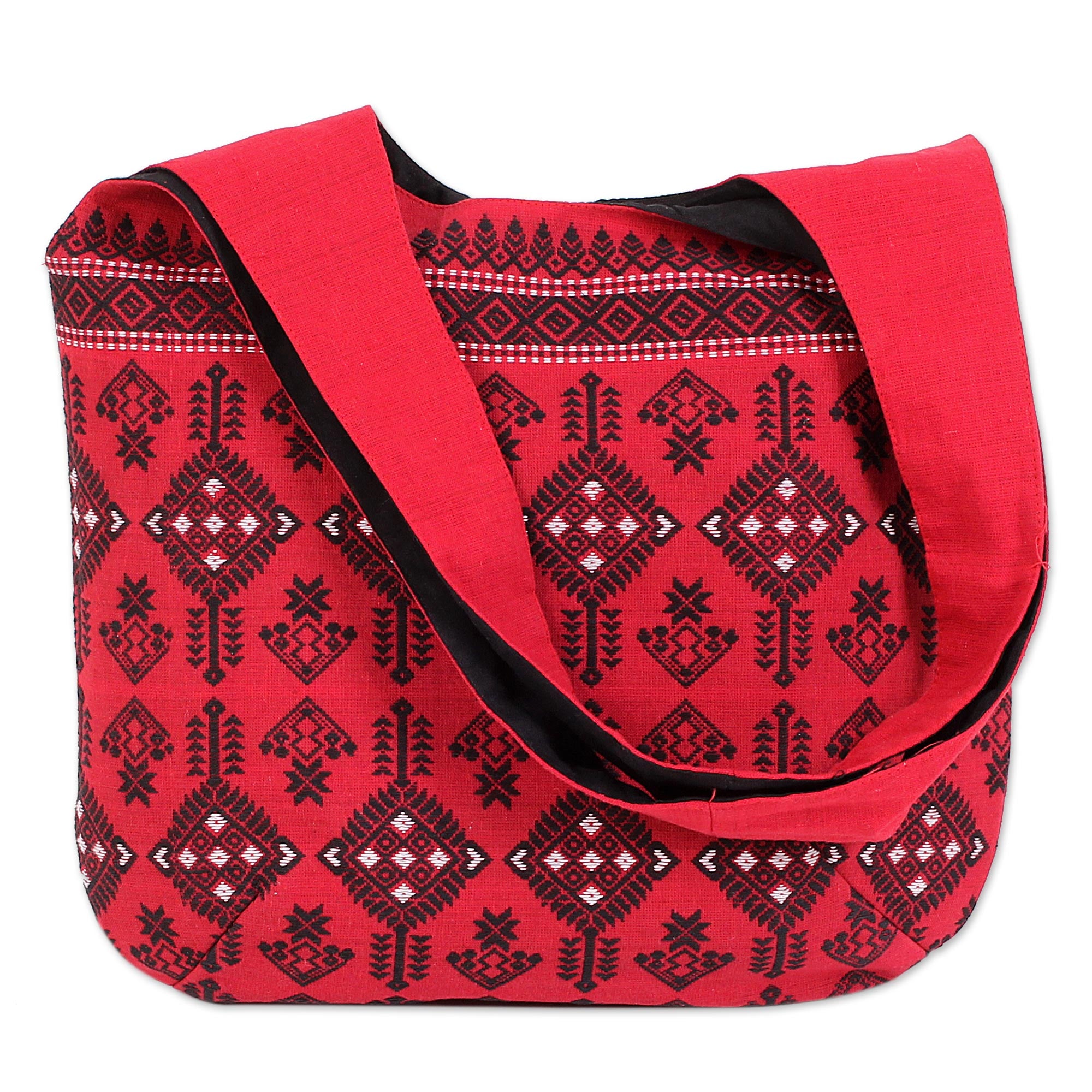 Delightful kite motifs decorate the chili-red body of this shoulder bag from India. Crafted of cotton, the handbag is designed by Manjuri Hazarika. A magnetic snap opens to a black cotton lining, featuring a single inner zipper pocket and a single open pocket.