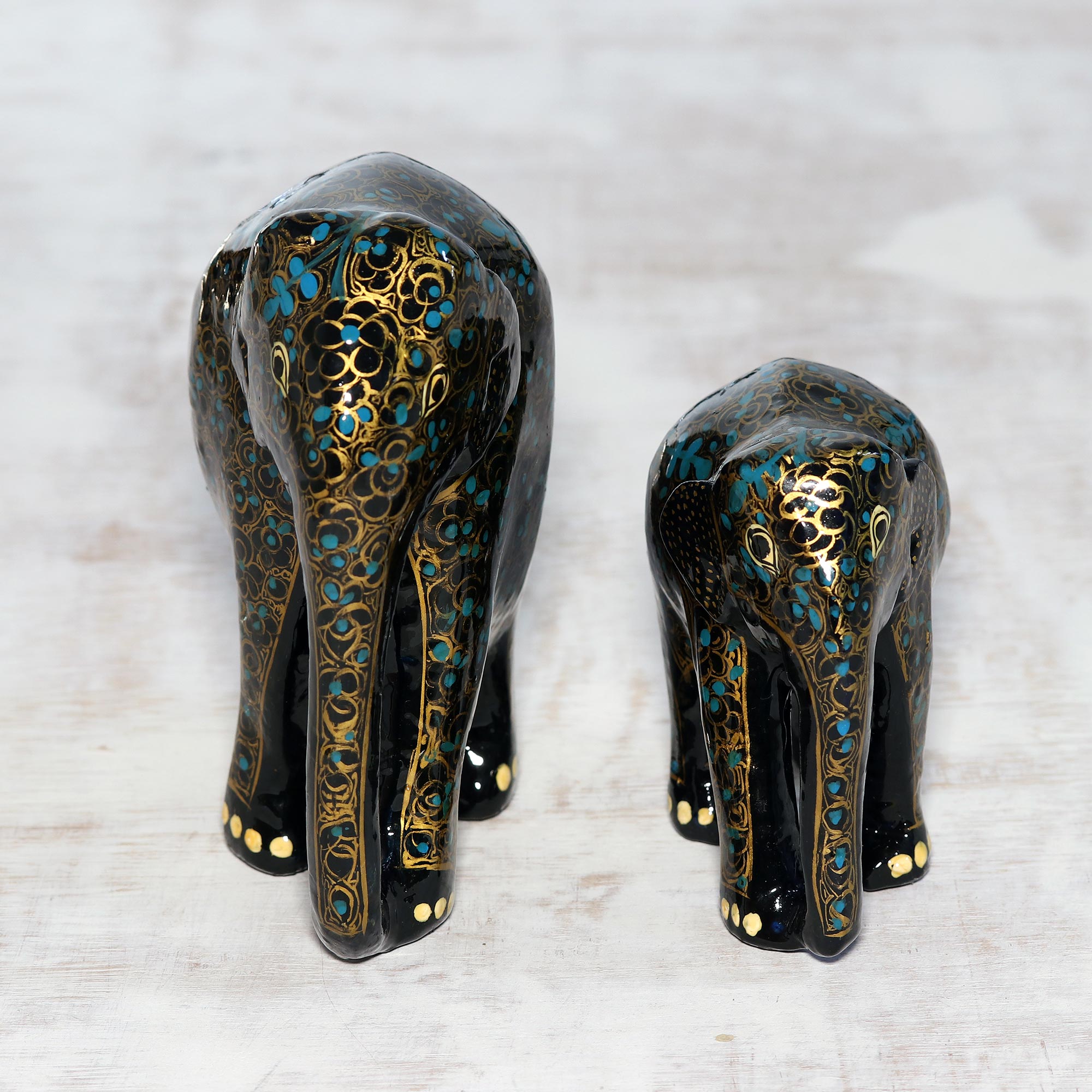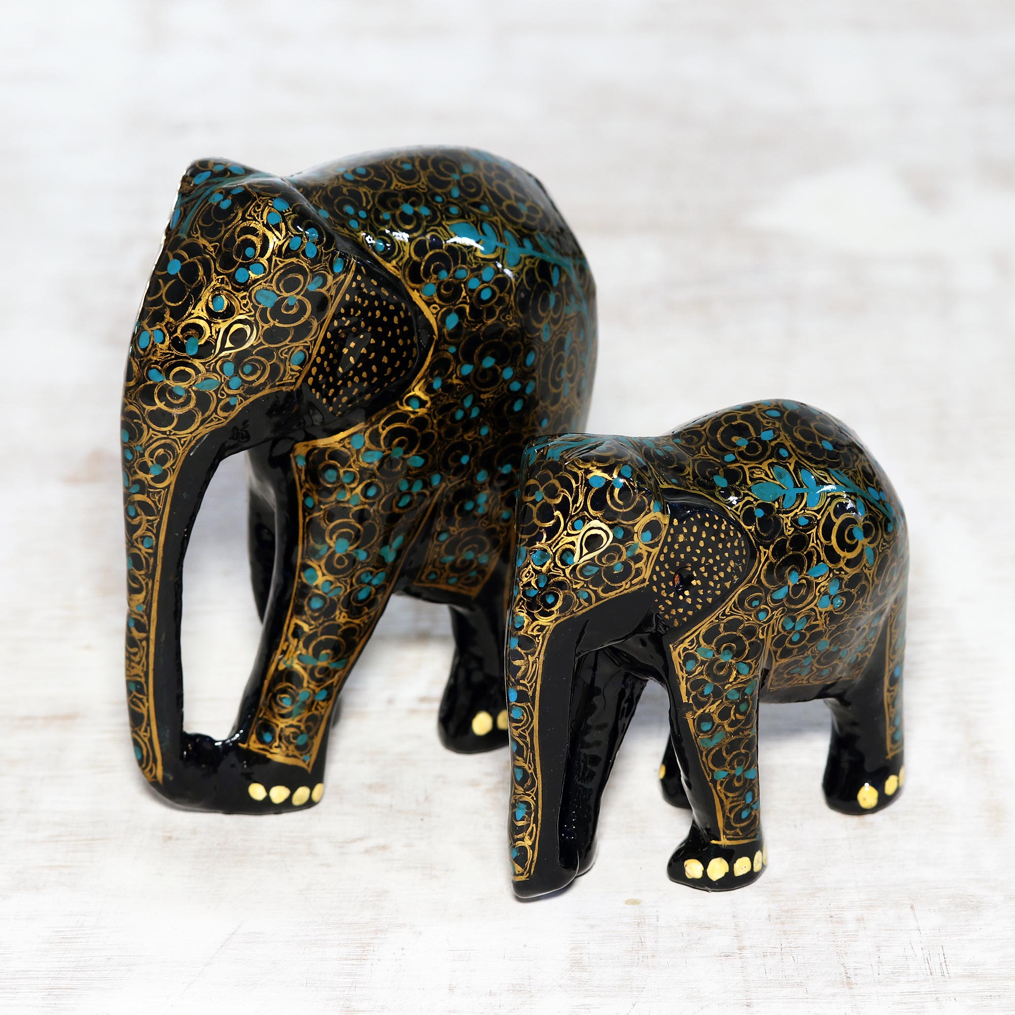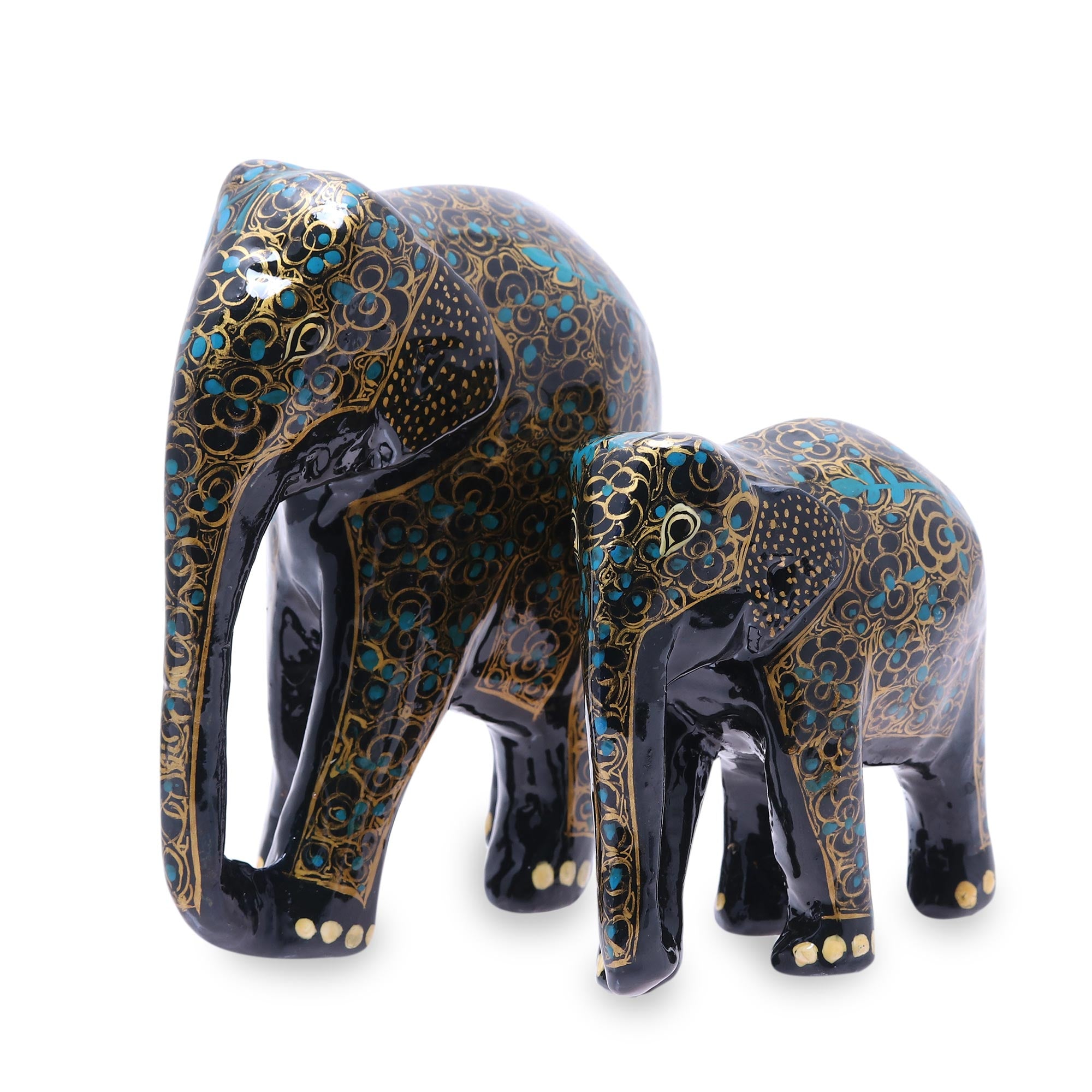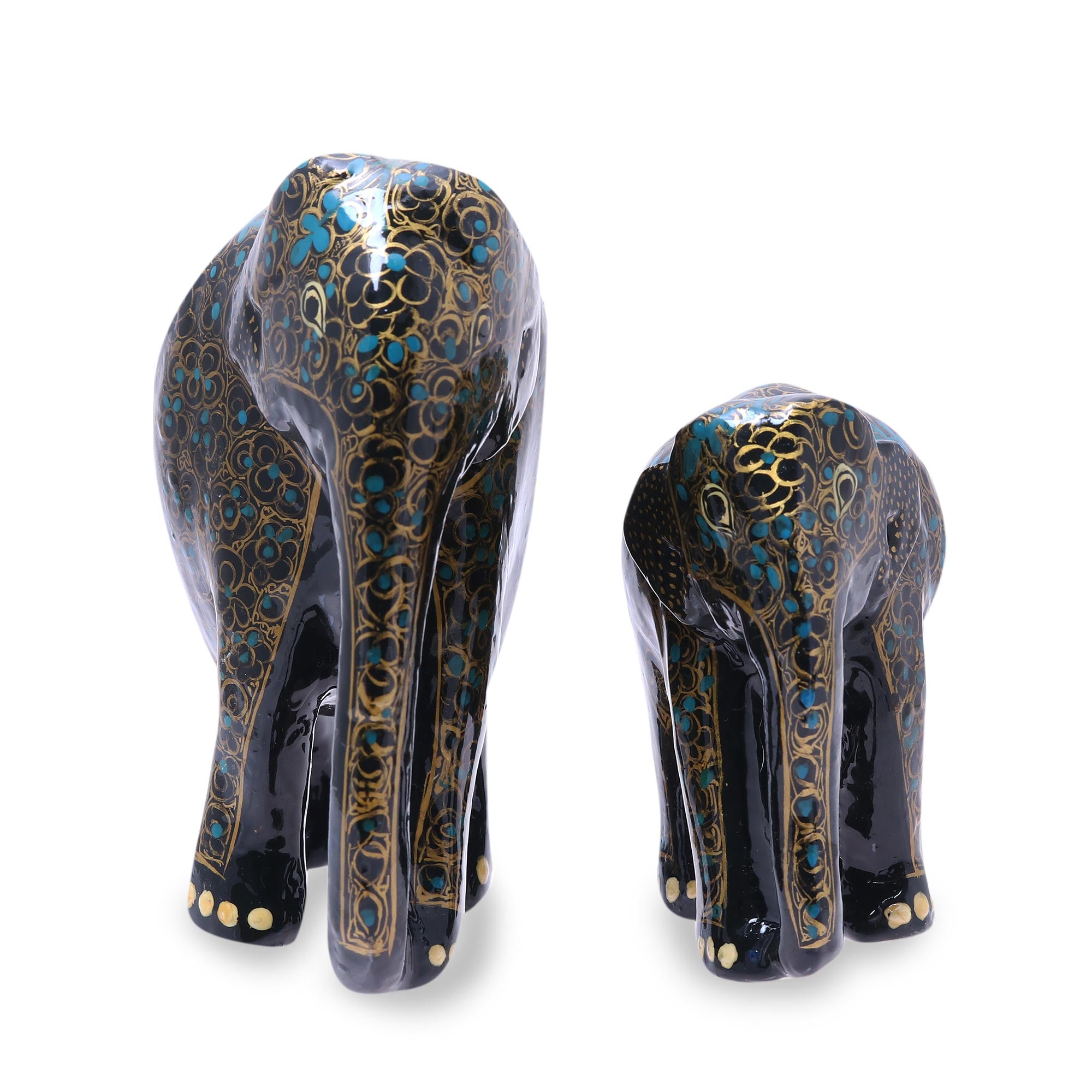 Designed by Indian artisan Sajad, this strikingly beautiful set of elephant sculptures — featuring a mother elephant and her child — will enhance the decor of any room. Each sculpture is carved from weeping willow wood, covered in papier-maché, and buffed to a smooth finish. Oil paints in magnificent gold and blue cover each black sculpture with a glossy, floral robe.