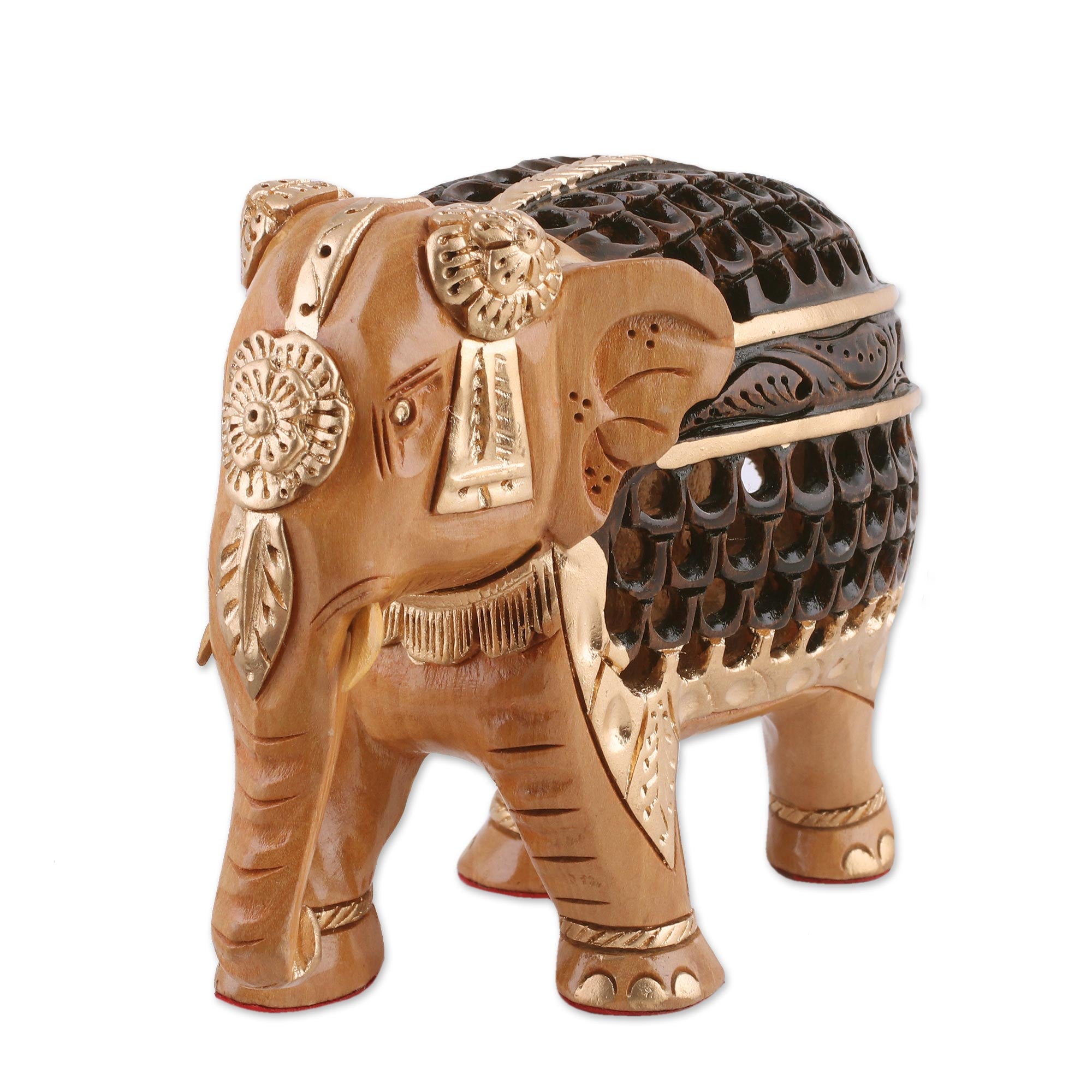A magnificent elephant is handcrafted of kadam wood, intricately detailed with light and dark brown finishes alongside gold-tone accents. Ashish Mehta of India creates the sculpture, elaborating the elephant's body with jali motifs that reveal a smaller elephant inside.
