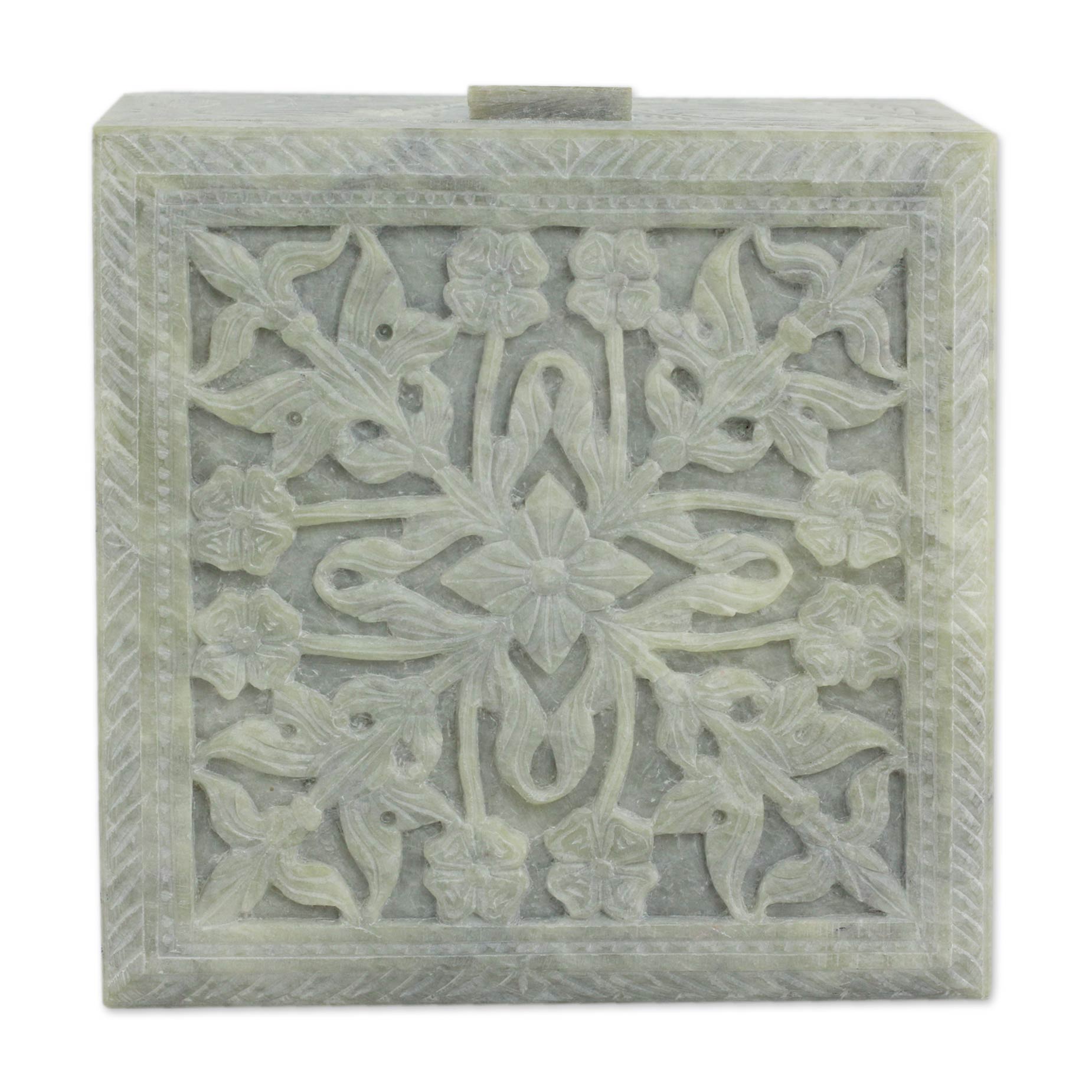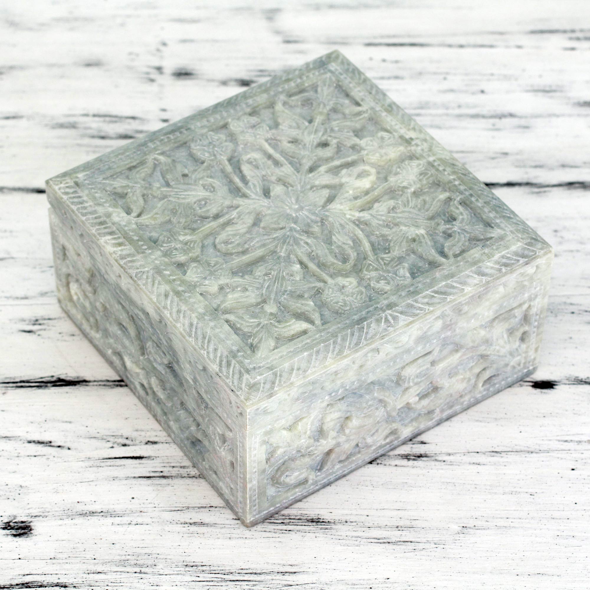 Bursting into bloom, wild roses grace a lavish jewelry box that showcases India's legendary stone carving artistry. Master artisan Gulam Rasool selects natural soapstone as his medium.