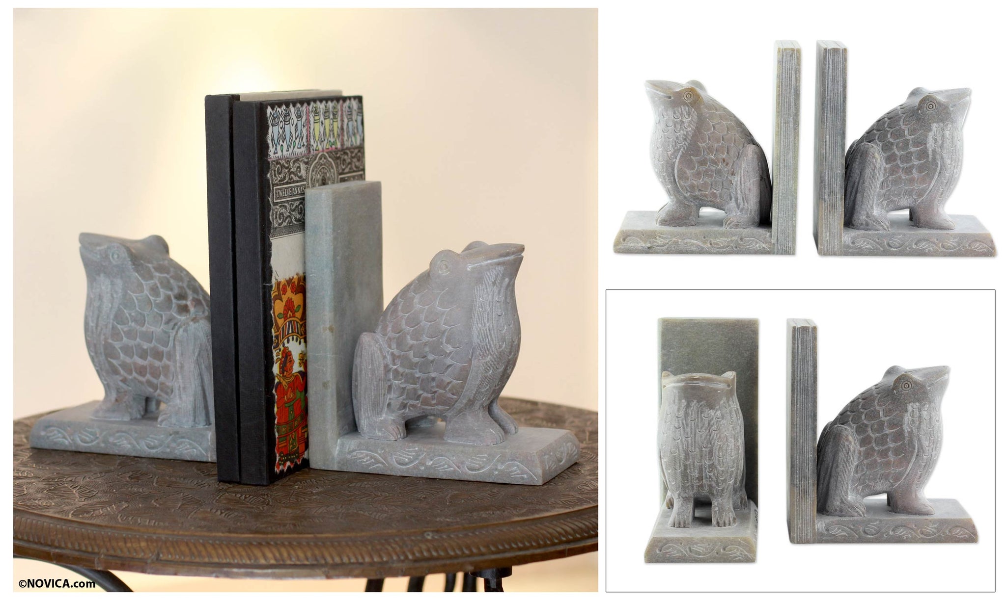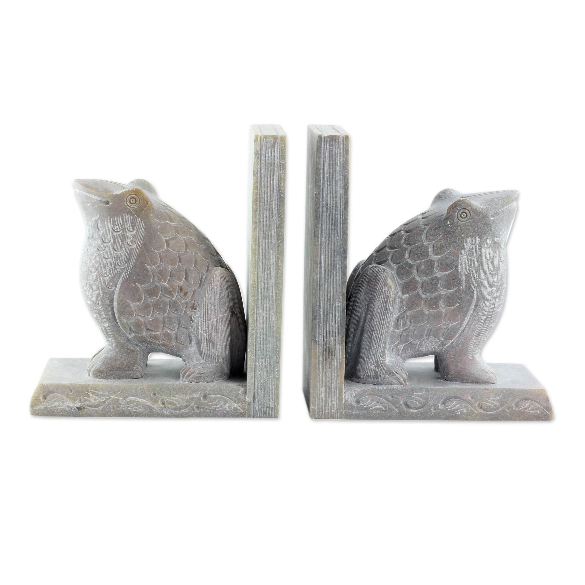 Cheerful frogs sit back to back, proudly holding books in place. Expertly hand-carved by Gulam Rasool, the bookends showcase natural soapstone's innate beauty.
