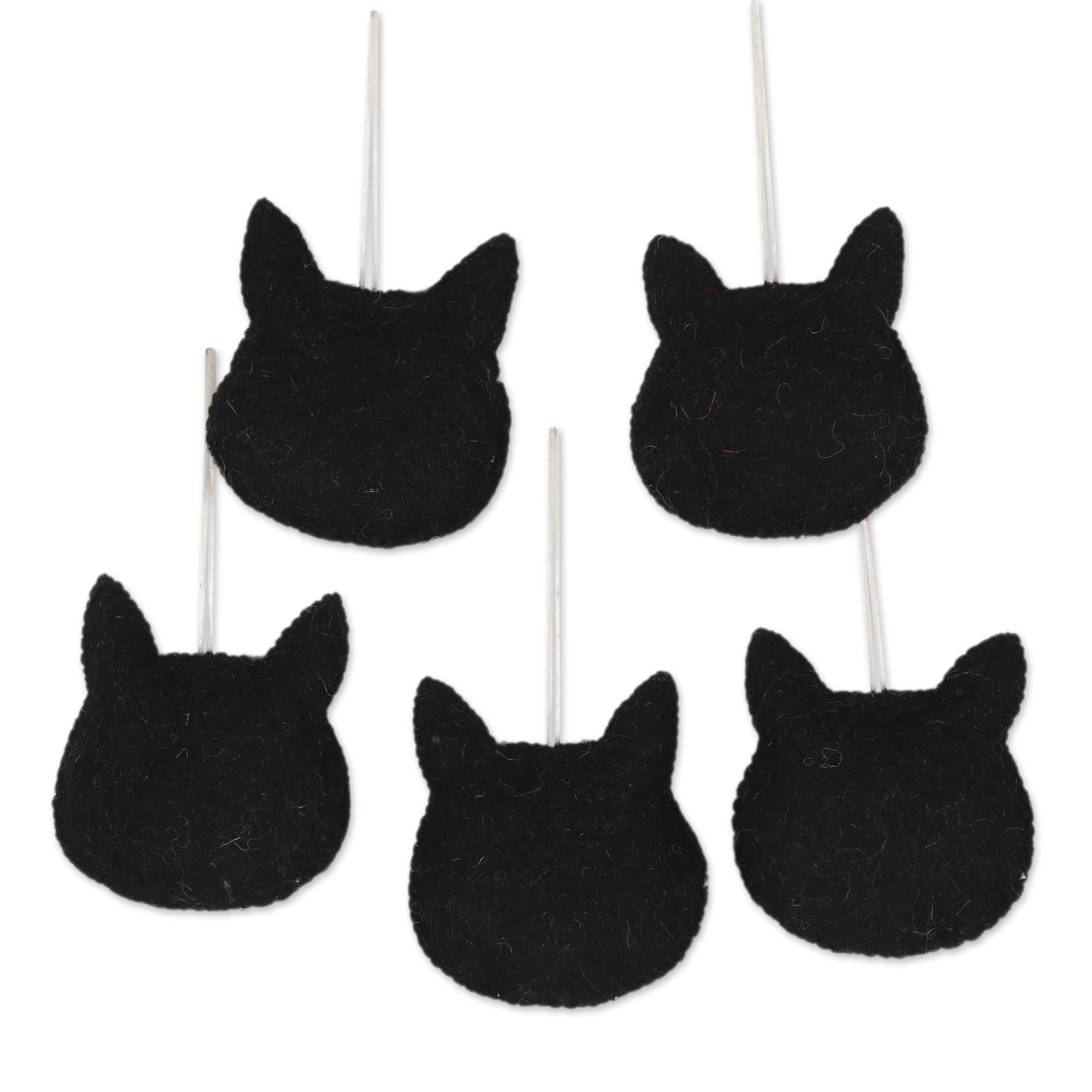 Hand Crafted Black Cat Wool Felt Ornaments (Set of 5) - Black Cats | NOVICA