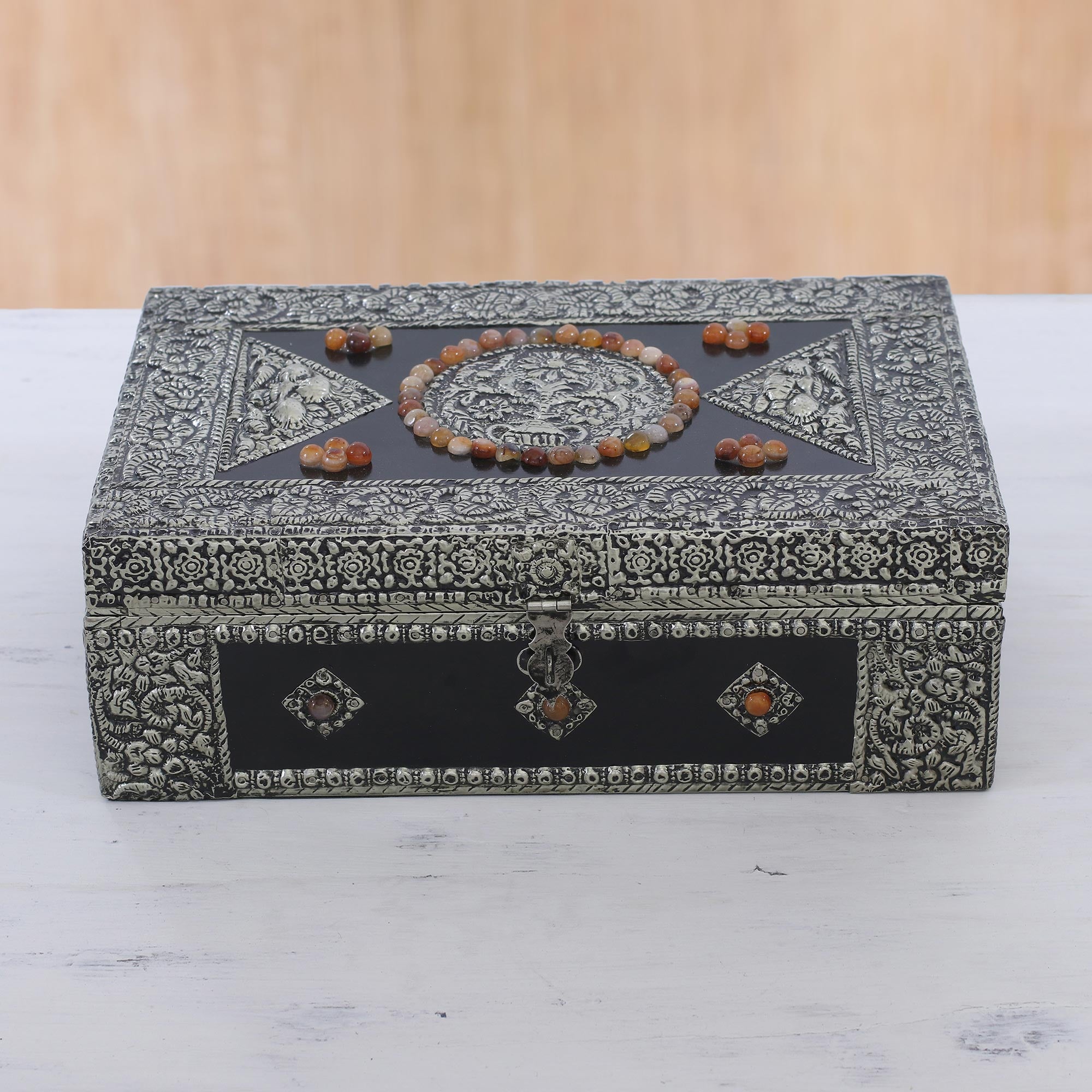 Lavish floral motifs on sleek black bring their own charisma to this jewelry box. Khalid Ali crafts the piece of mango wood, covering it in brass repoussé bathed in nickel. He lines the box with velvet and adds a lift out tray for smaller treasures. He then adds ornate handles, a mirror inside the lid, and a latch that can by locked.