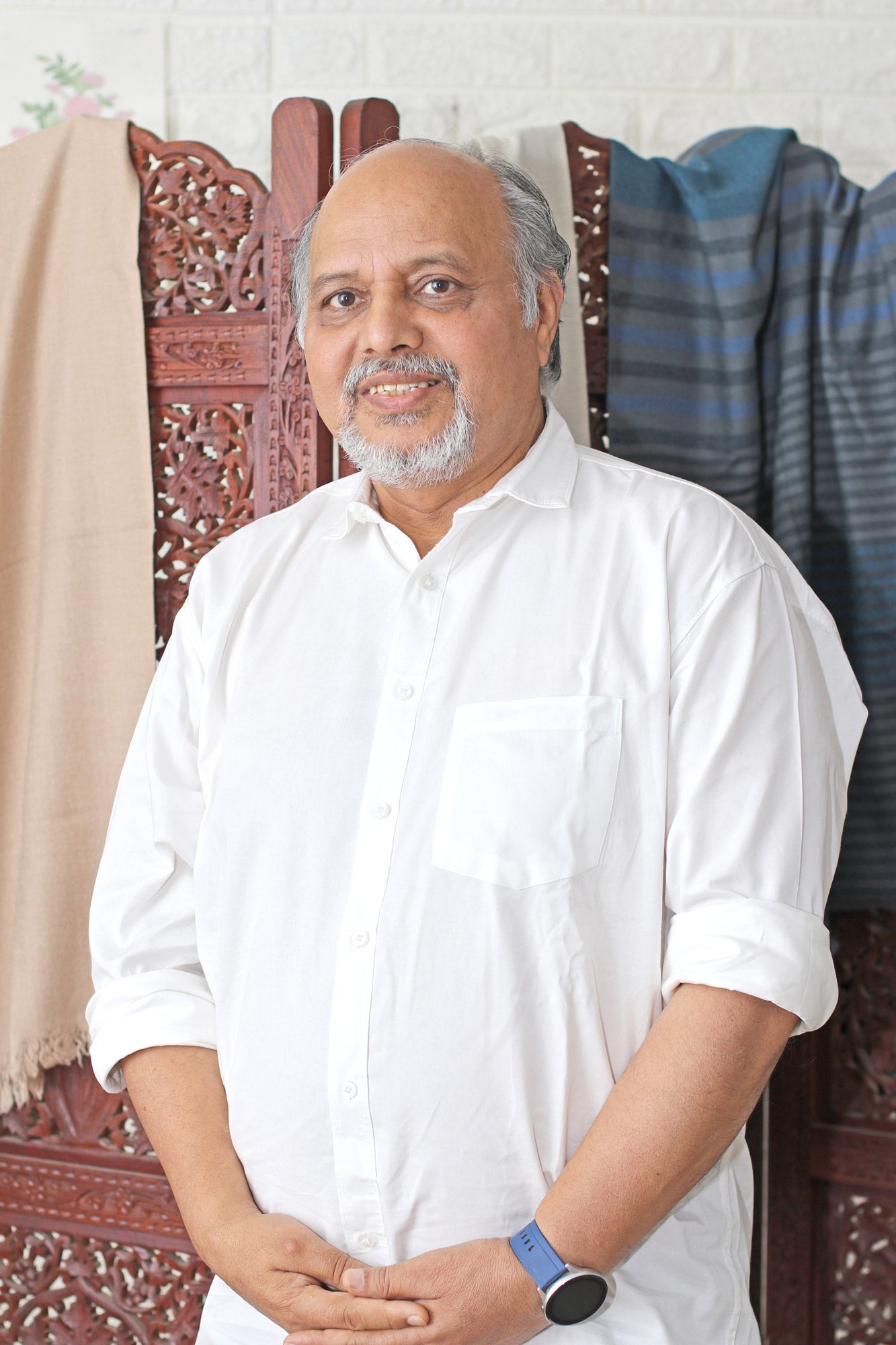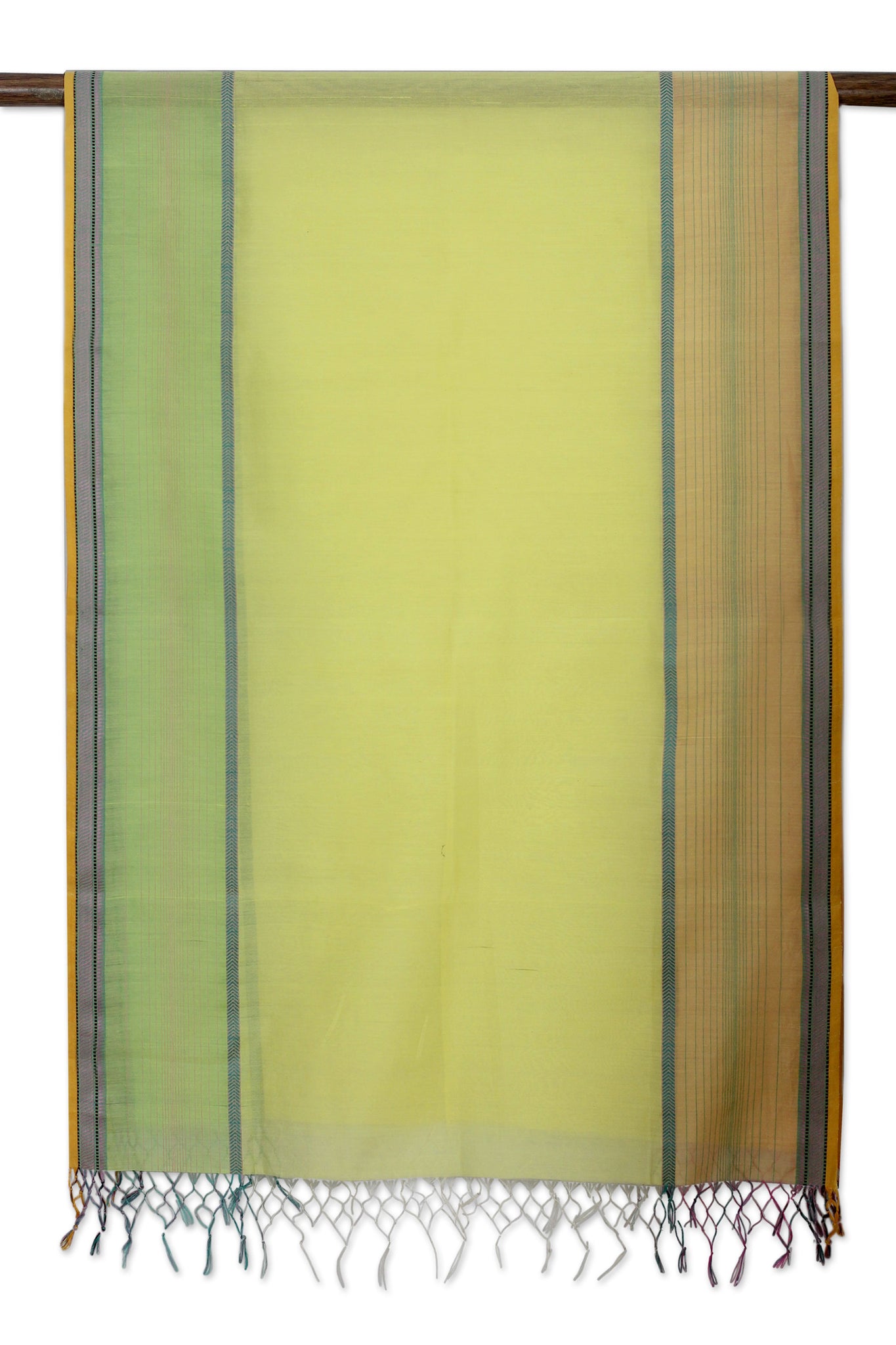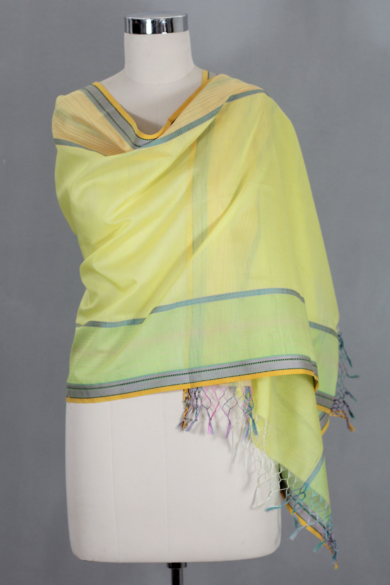History tells of Ahilya Bai Holkar, the Philosopher Queen renowned for her wisdom and bravery who commanded armies into battle. She once commissioned weavers to design long sarees without floral motifs, as she did not care for them. Weavers drew inspiration from the detailing on the Maheshwar Fort, and wove intricately patterned fabrics that have come to be known as Maheshwari weaves. Indian artisan Rajveer preserves this legendary tradition with this bright yellow shawl, woven on a hand loom with a cotton and silk blend featuring discreet shades of green and rose.