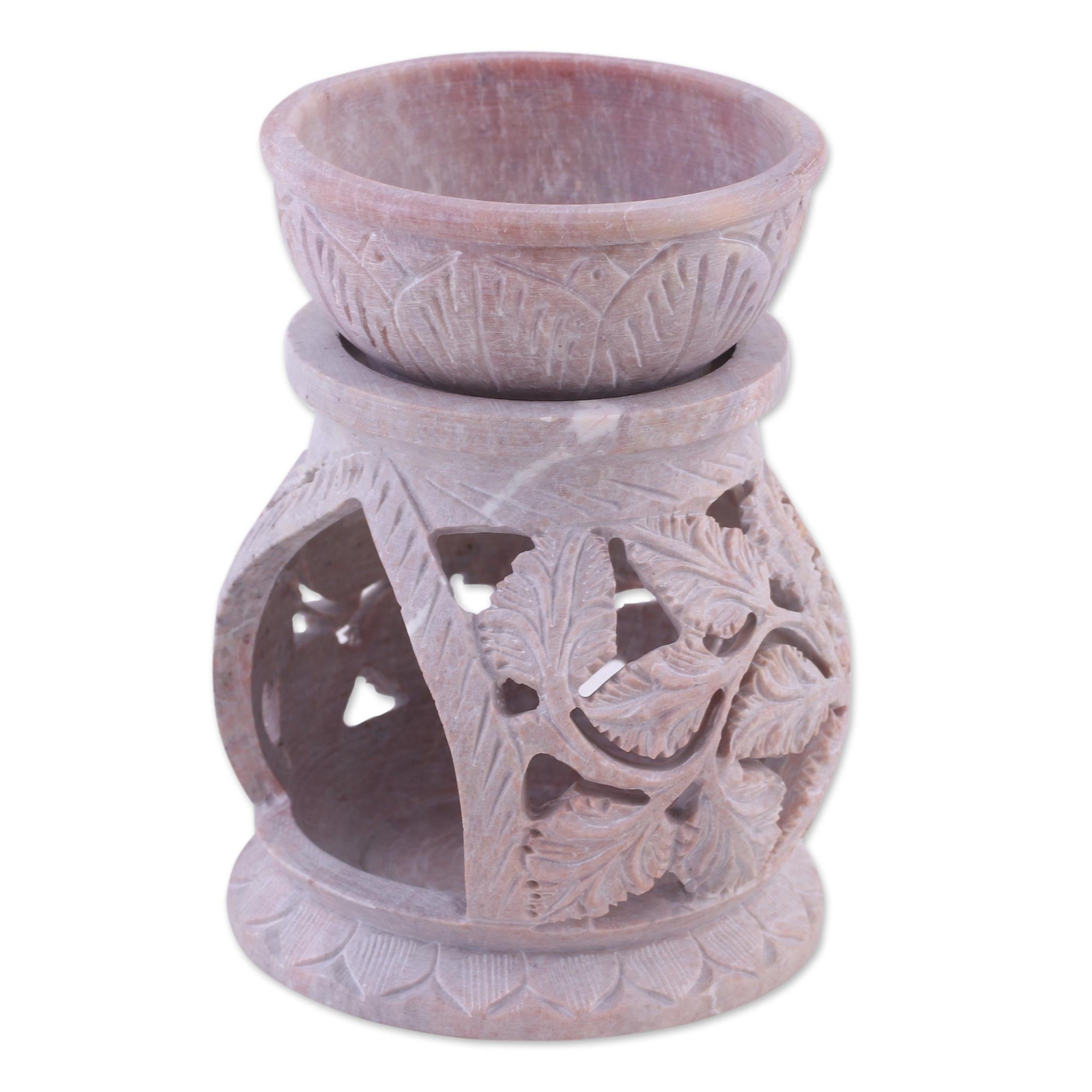 The perfect accessory for diffusing scented oils, this charming oil warmer makes a handy addition to your home. Gulam Rasool hand-carves the warmer from natural soapstone with pink and beige hues. The bottom tealight holder features openwork leaf motifs in relief that reveal the flame flickering within. At the top of the warmer is a removable basin for holding scented oils, etched with petal motifs.