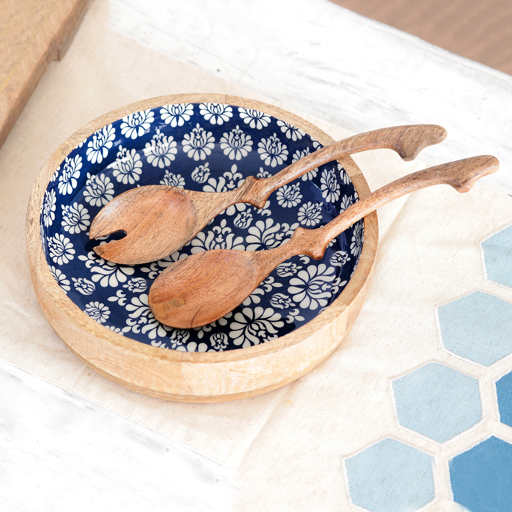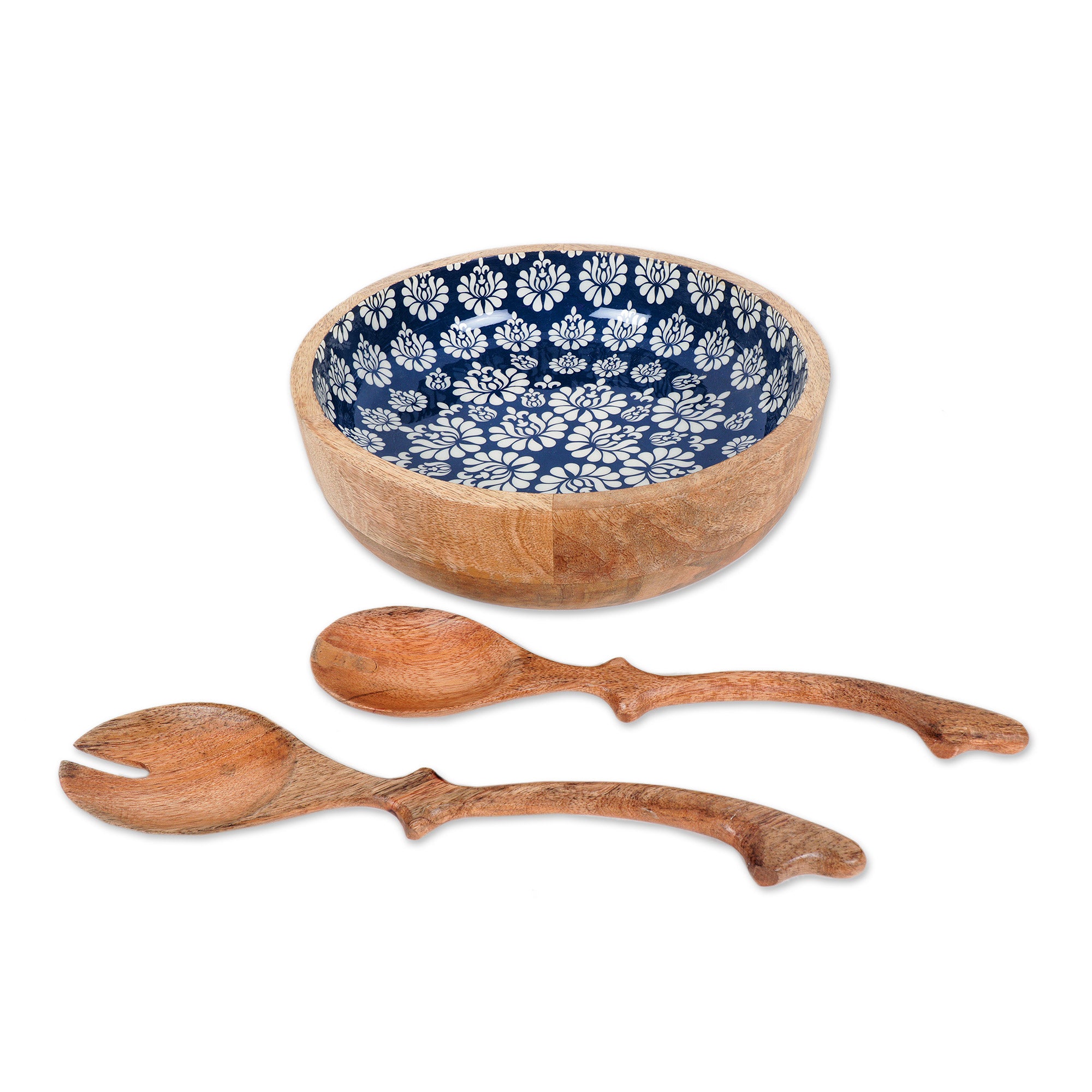 A multitude of white lotus stand out on a background of deep blue, offset by rustic mangowood in this handcrafted salad set. A lively addition to any meal, the set includes the food-safe resin coated bowl and a pair of salad servers with hand carved detailing. Hand wash.