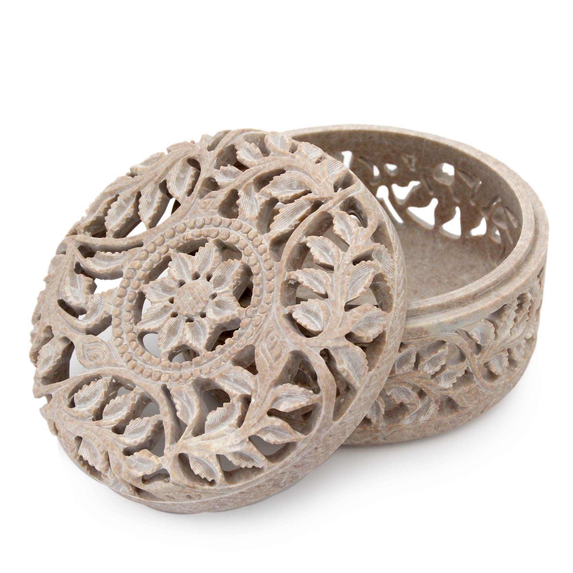 Sculpted in soapstone, leafy vines form exquisite arabesques. Gulam Rasool is a master at traditional jali or openwork carving. Centered with a flower, this jewelry box is exceptional.