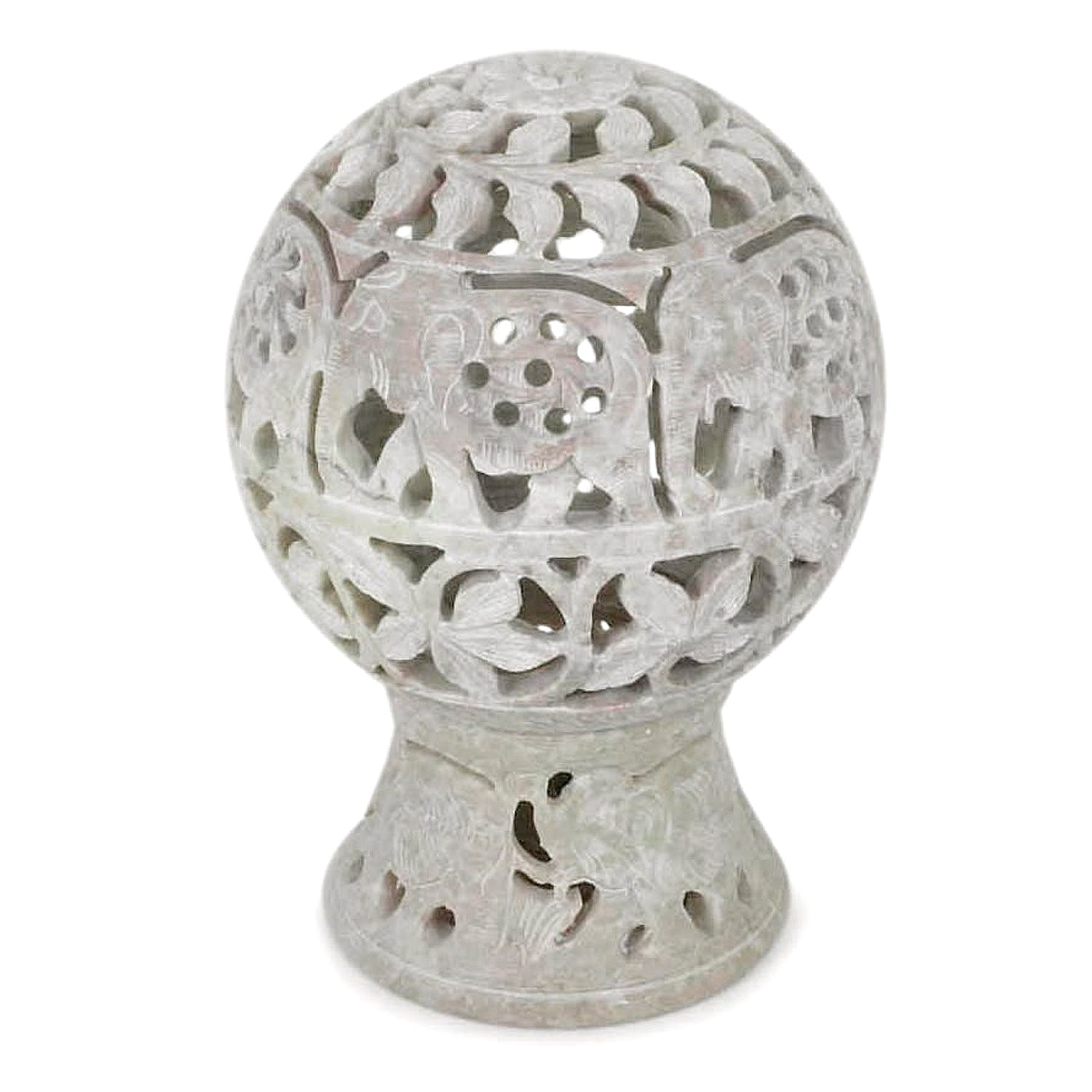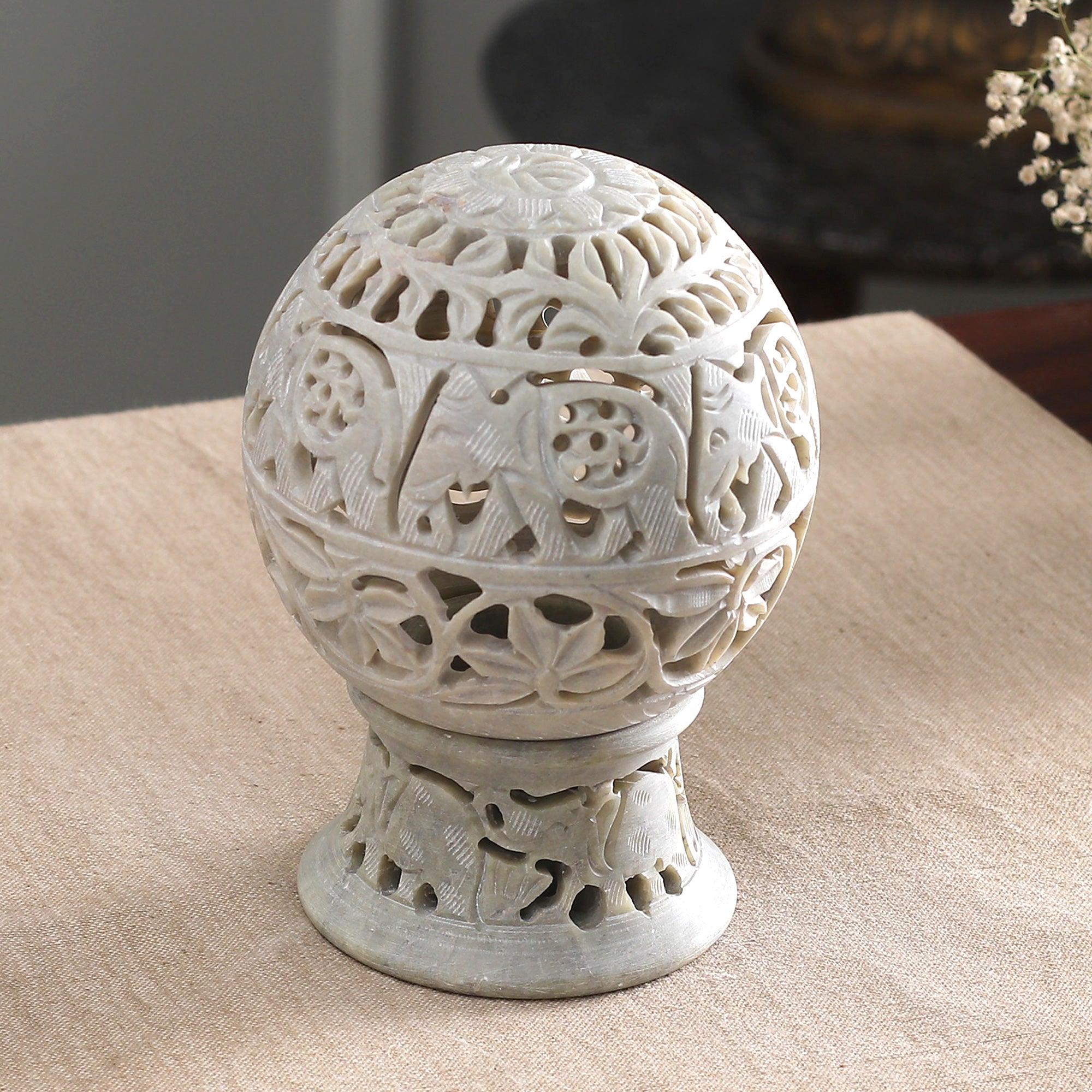 Cheerful elephants march around a floral globe that shields a glowing tea light. Hand-carved of soapstone, this delightful candleholder by Gulam Rasool is wonderfully original.