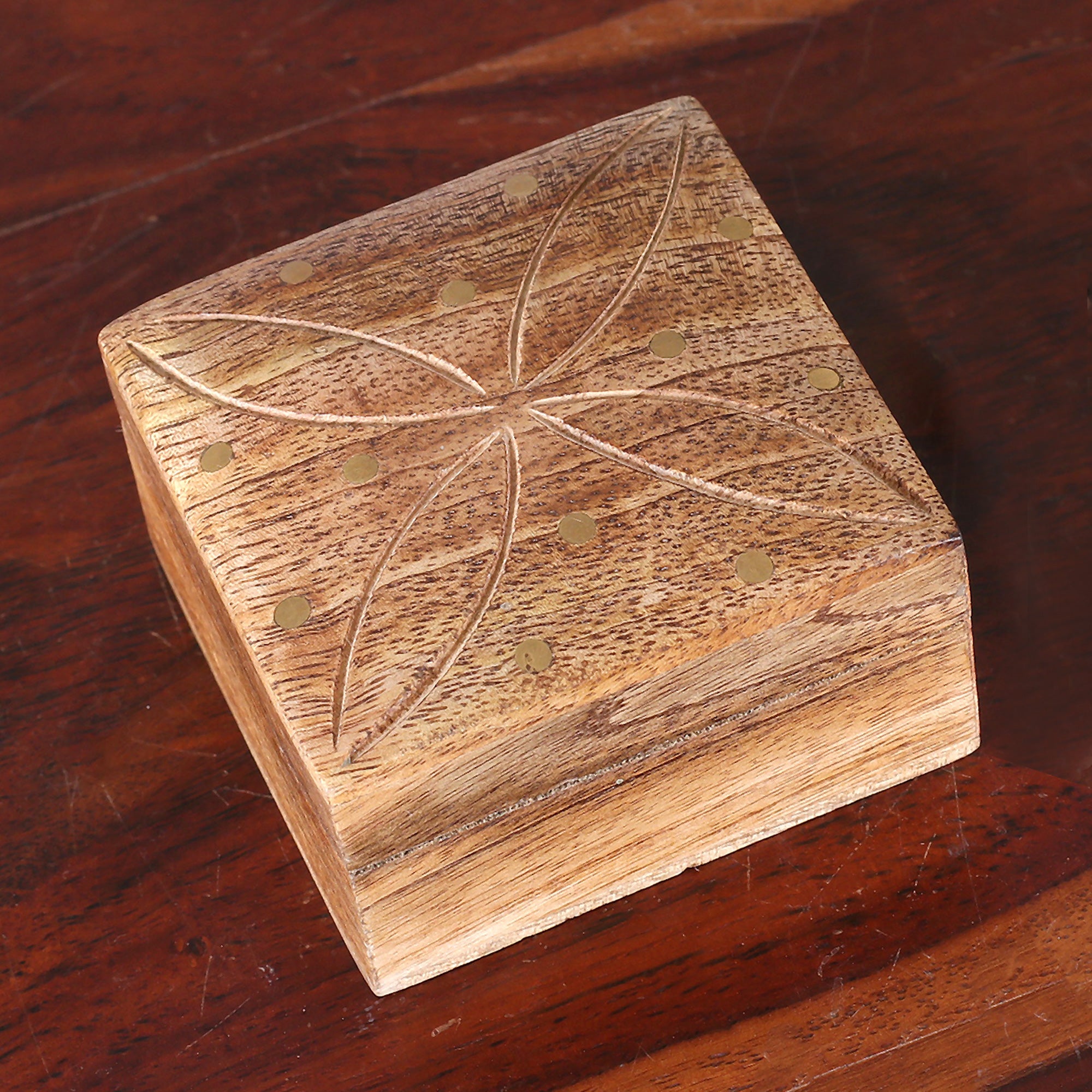 Arti Sharma of India presents this lovely decorative box handcrafted from mango wood. The top of the hinged lid is inlaid with brass dots and carved with the outline of a four-petal flower. The rich brown stain on both the interior and exterior showcases the beautiful grain of the wood.