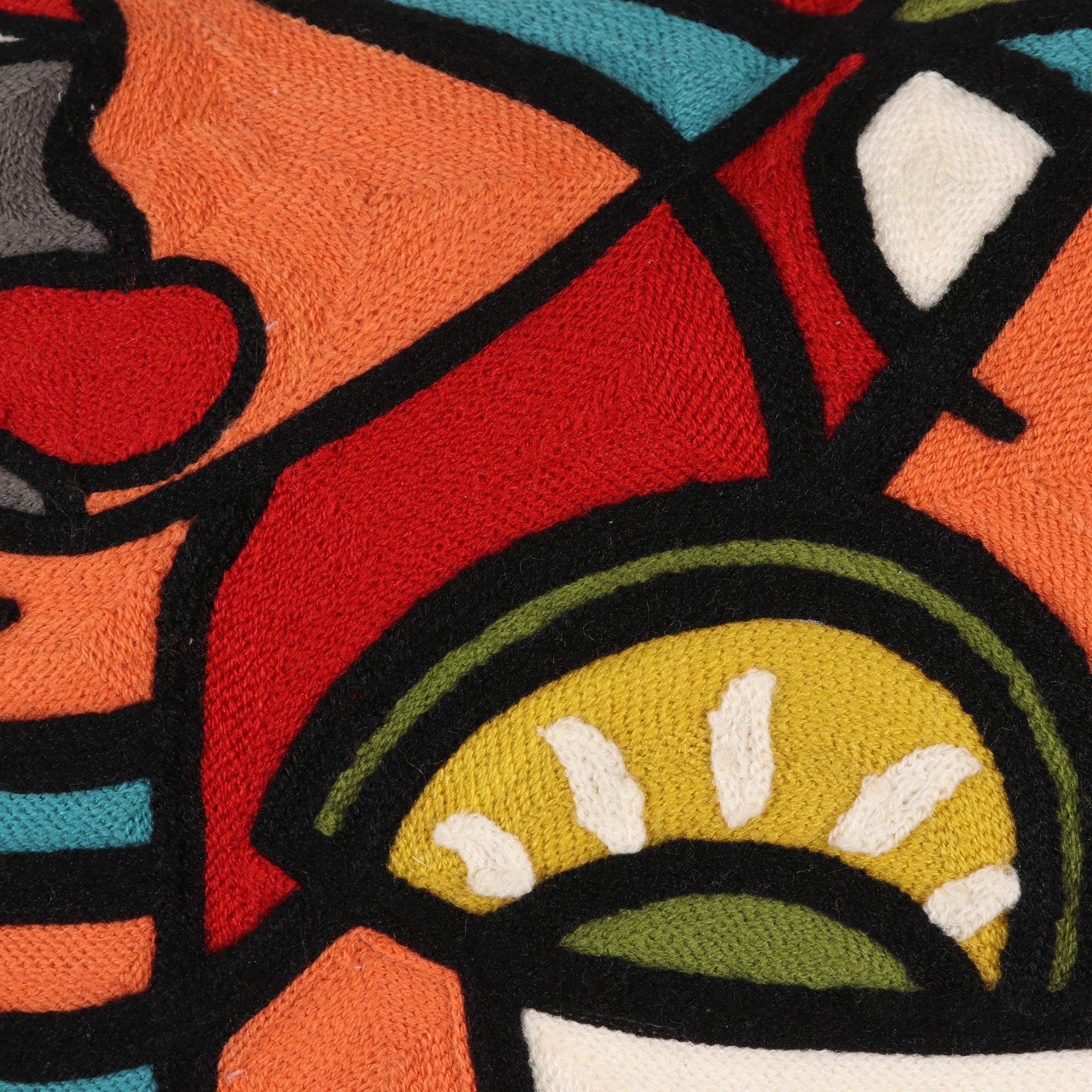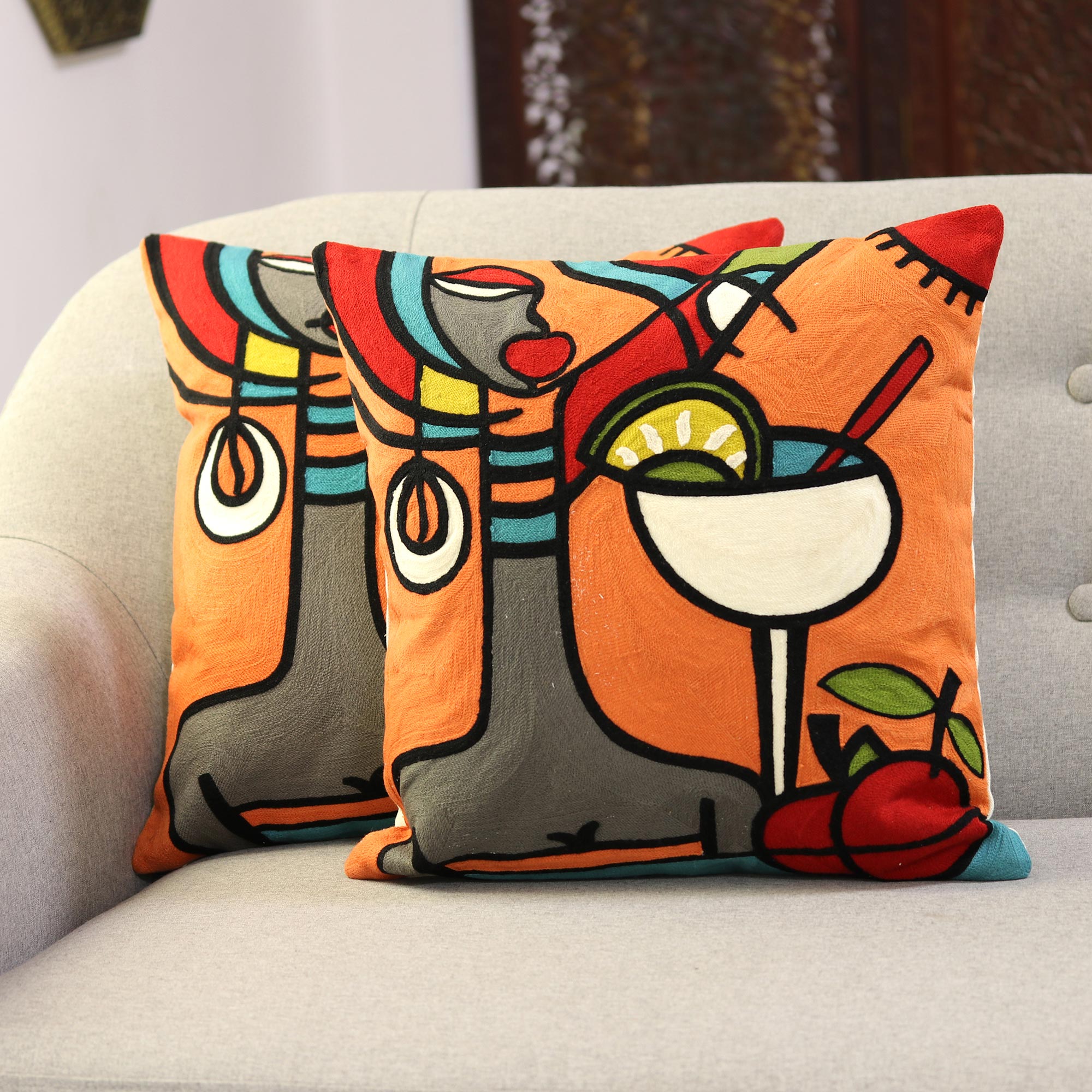 Against a tangerine background, a chic woman enjoys a margarita on this pair of chain stitched cushion covers from India. Sumiya creates these cushion covers, which feature intricately embroidered modern designs. Each cover has a back in solid antique white and opens on one side with a zipper for inserting a cushion.