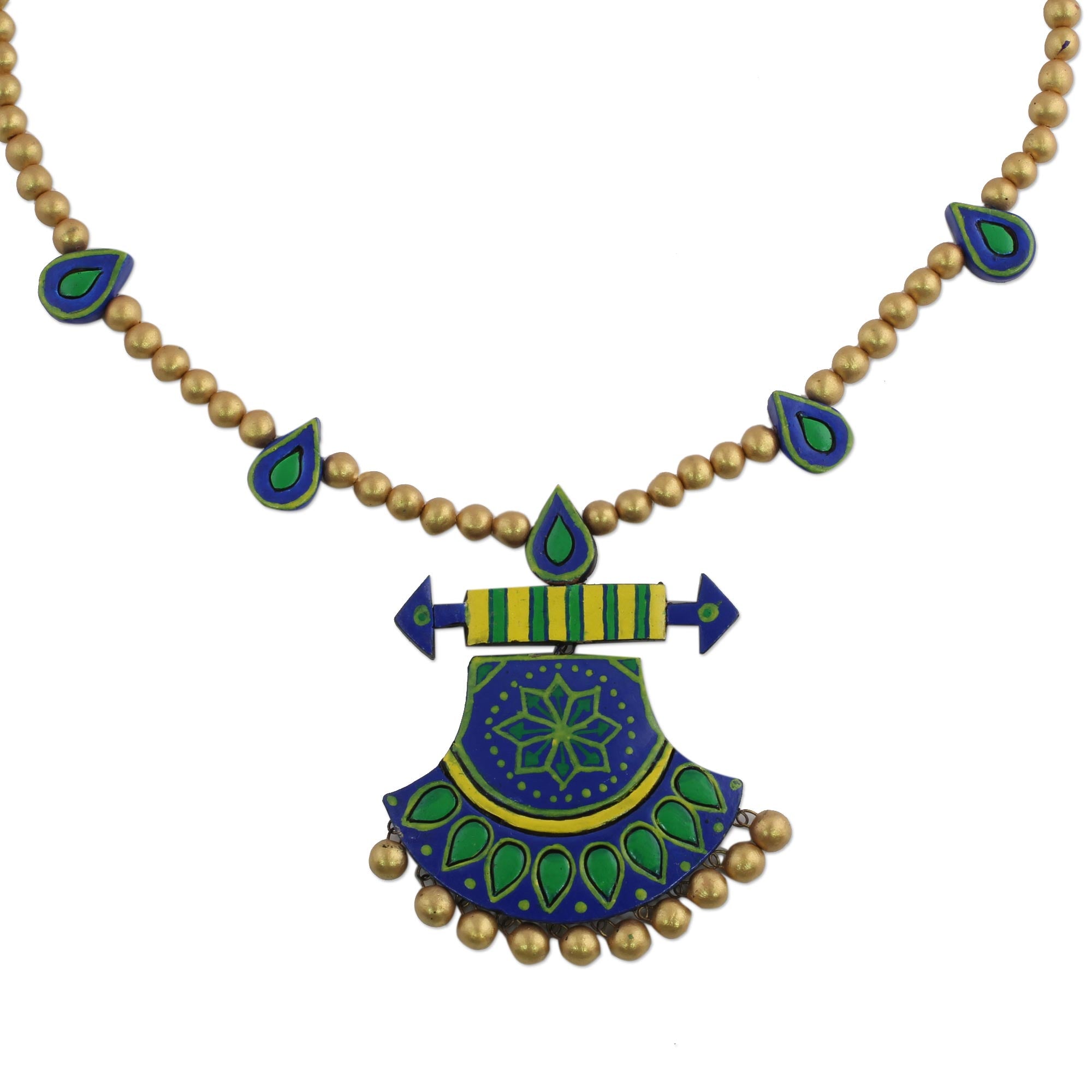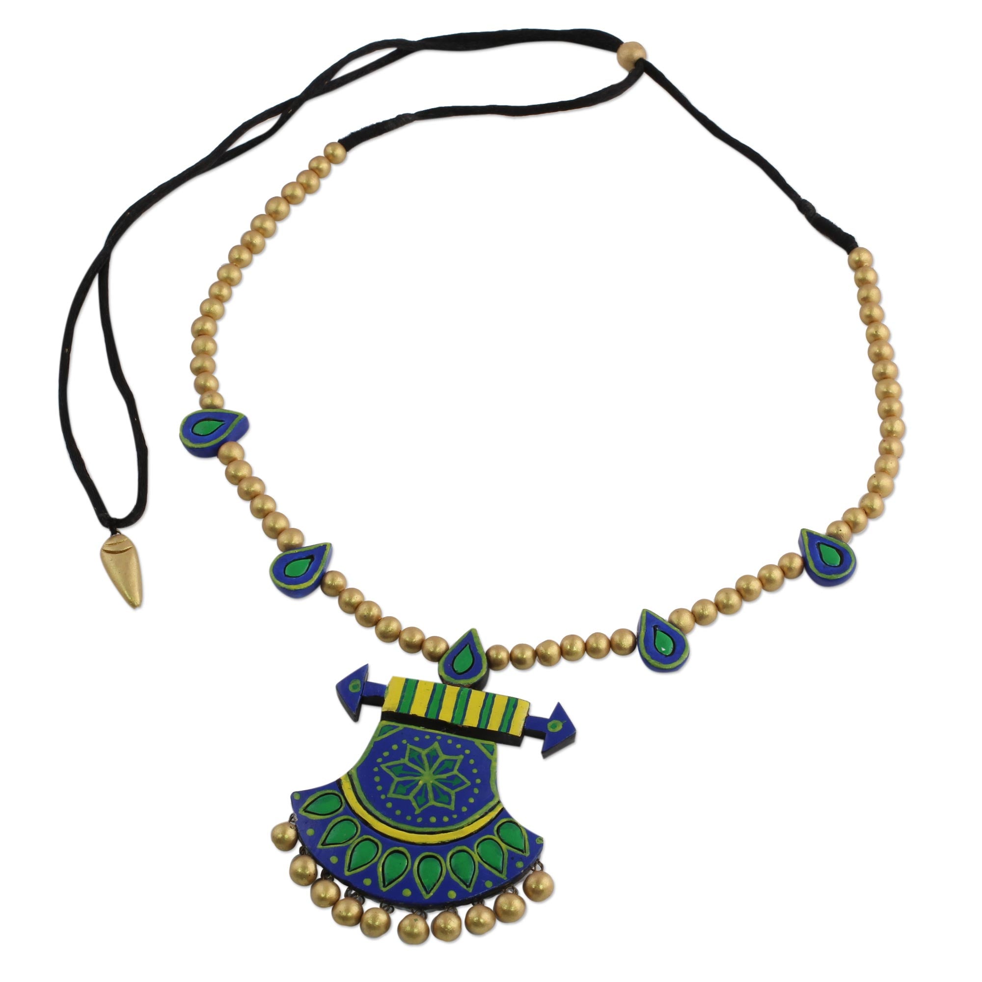 Raindrop beads are handcrafted of ceramic, flanked by round beads painted gold in this necklace from India. Ritu Thapar designs this regal necklace, adding a bell-shaped pendant painted with floral motifs in blue, green, and yellow and accented with gold-tone baubles that hang at the bottom. The pendant centers a black nylon cord of adjustable length.