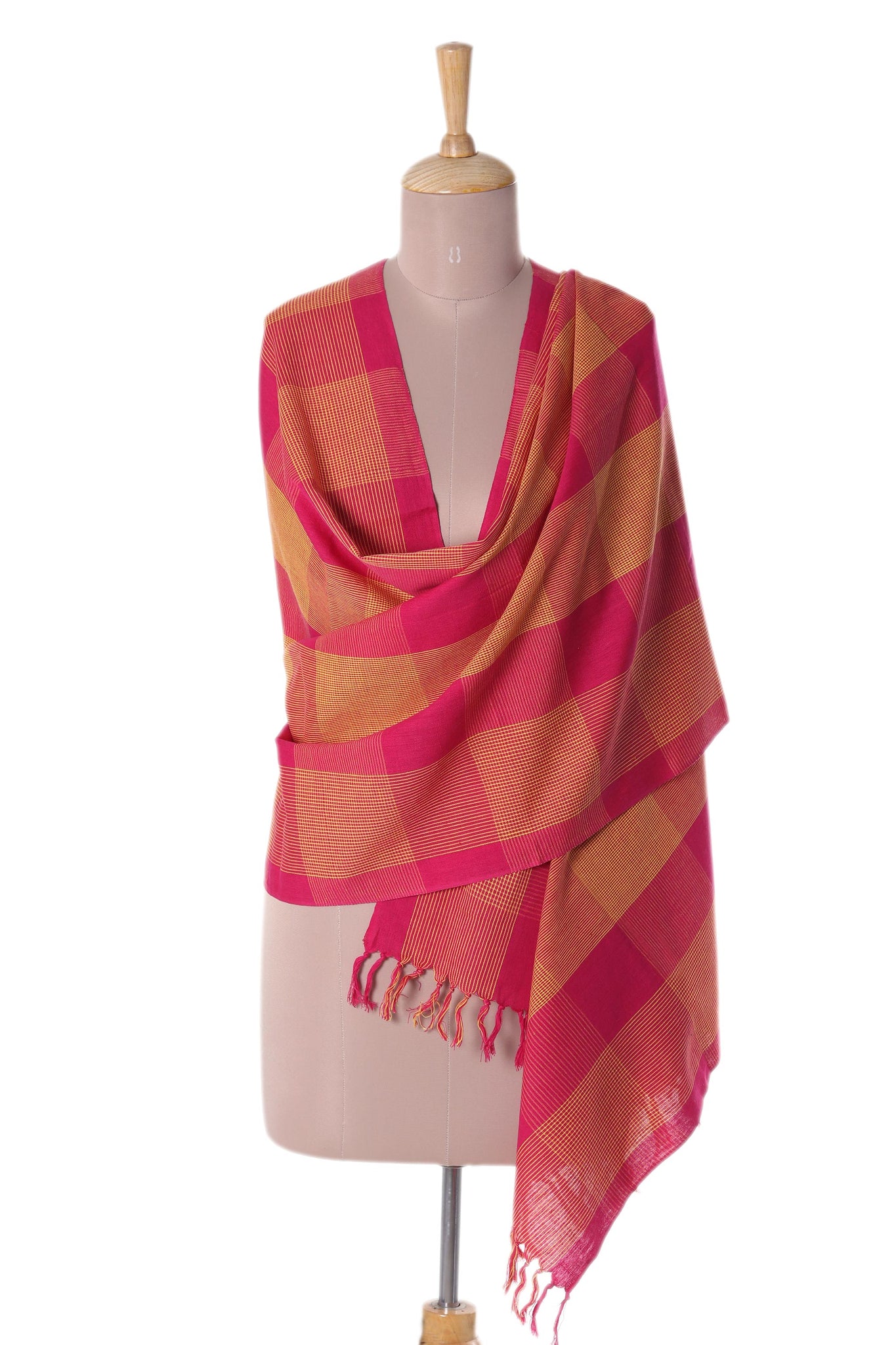 Woven from cotton by Indian artisans, this fringed cotton shawl brings a vibrant flair wherever it goes. Ritu Agnihotri designs this shawl, featuring a prominent color in fuchsia with intricate daffodil square patterns.