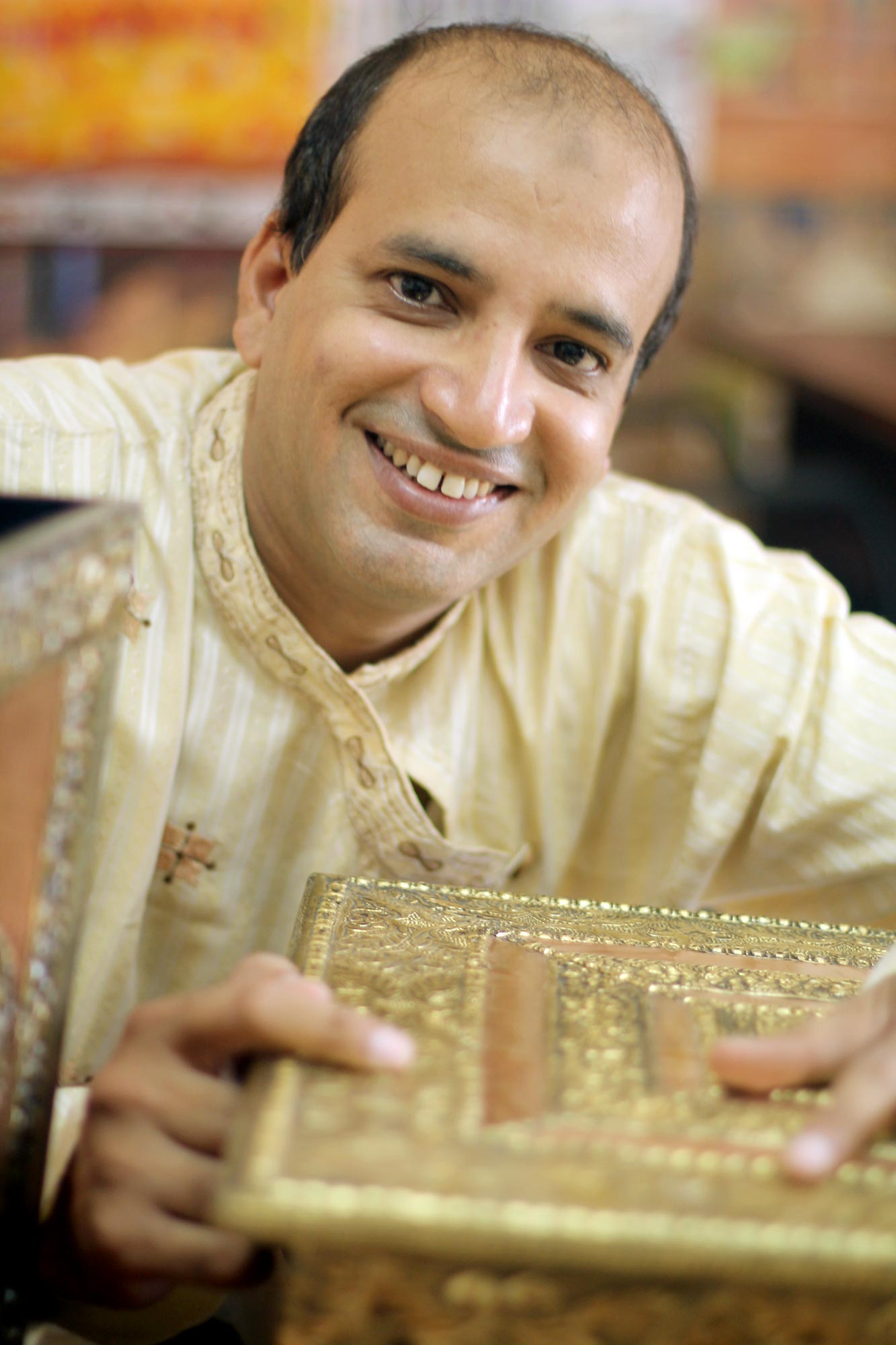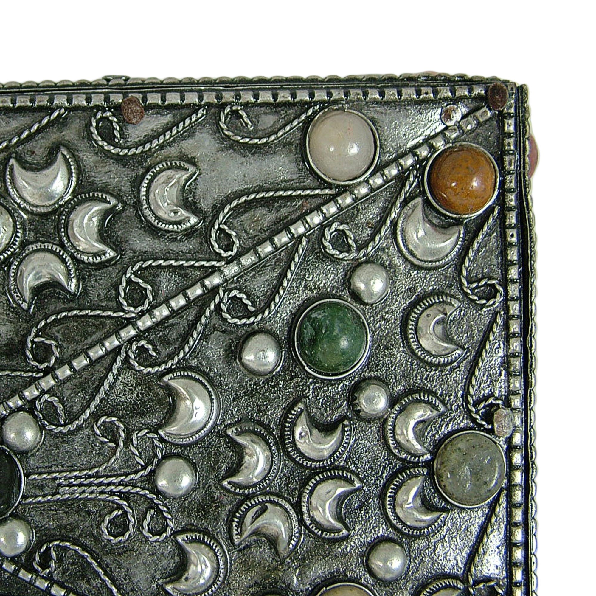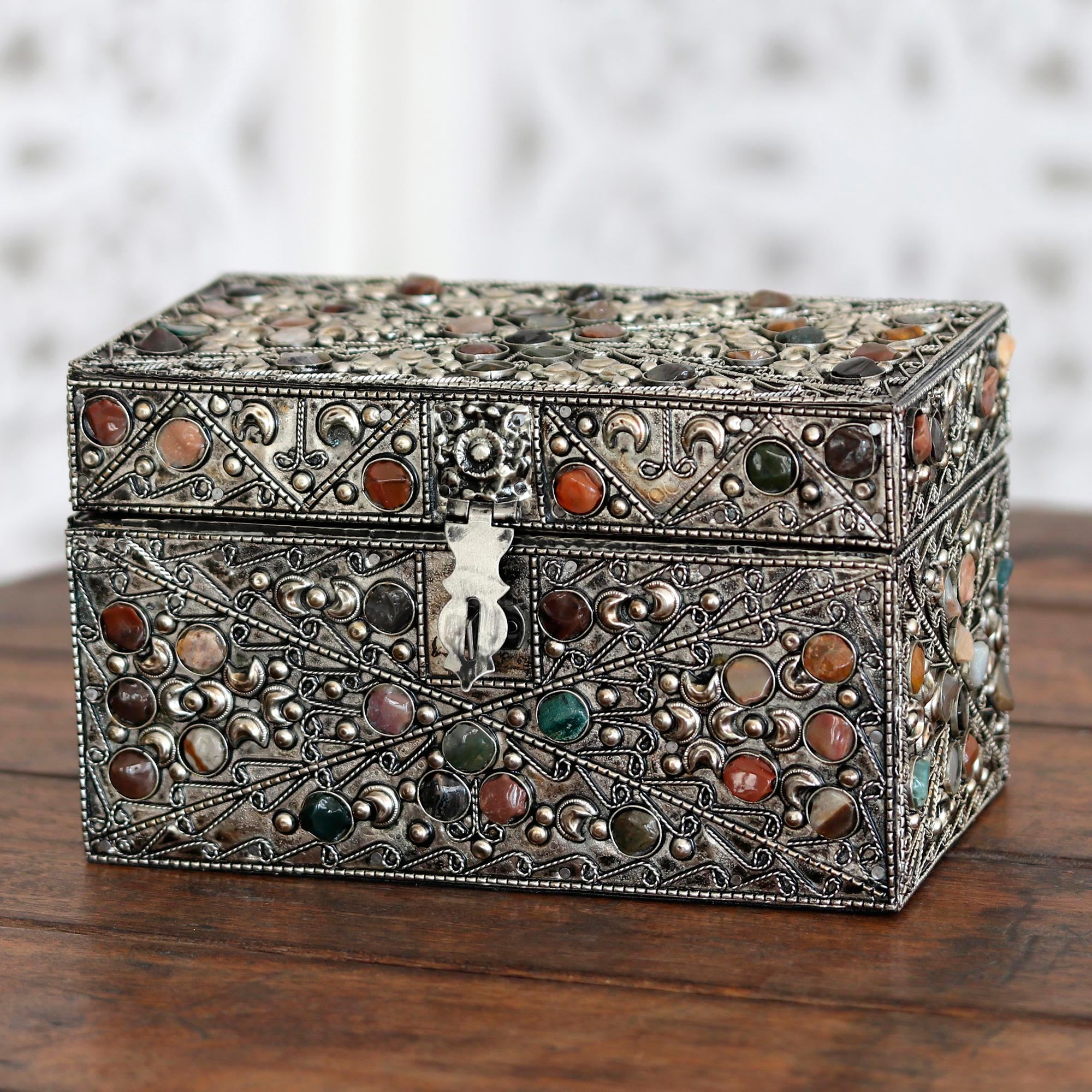 Khalid Ali creates a majestic coffer to hold personal treasures. Colorful glass beads cover this regal velvet-lined jewelry box. To create the antique style coffer Ali works in beautiful embossed brass bathed in nickel. A mirror is conveniently placed in the lid.