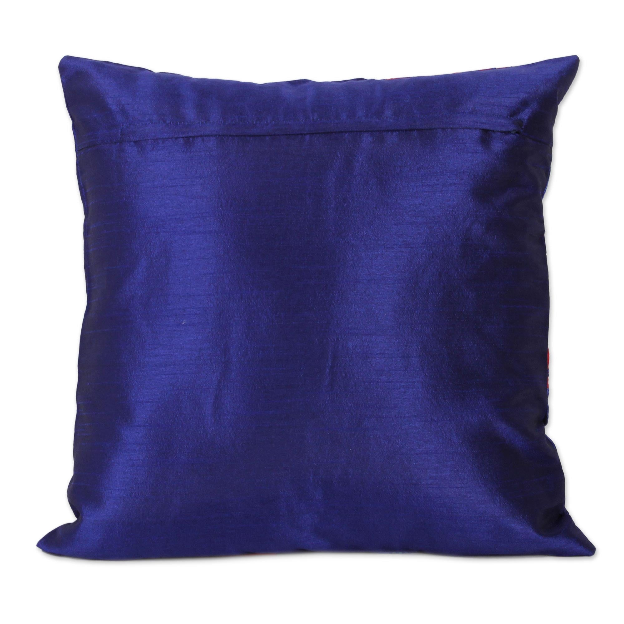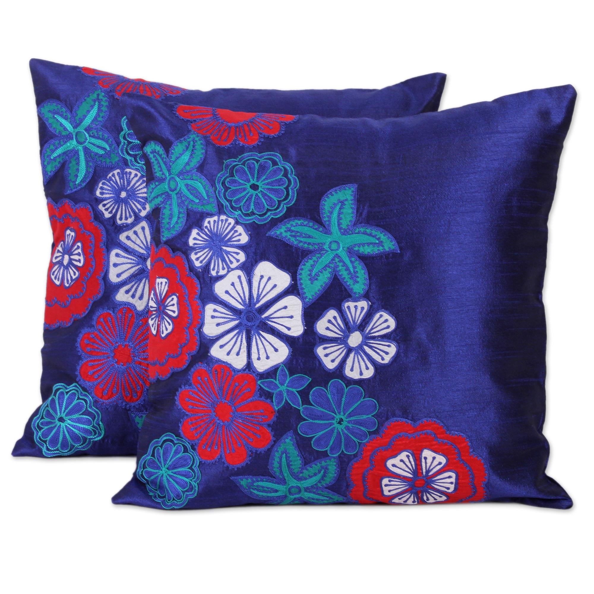 Seema crafts a dazzling pair of covers in sapphire blue. Conjuring a floral garden with machine embroidery and colorful appliqué, she creates contemporary decorative accents. The reverse side is solid blue and features a zipper closure.