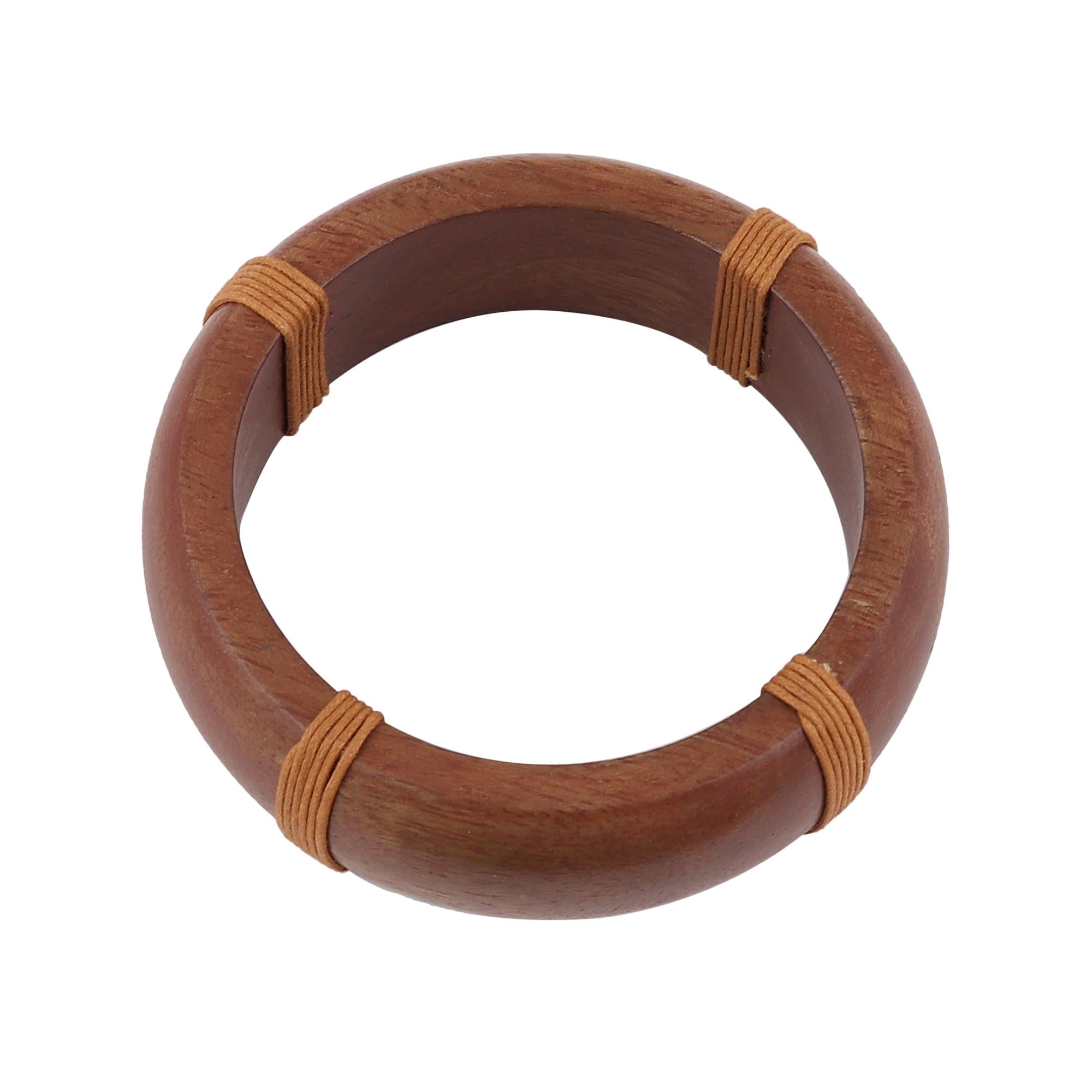 Arti Sharma of India presents an attractive babul acacia wood bangle bracelet. The bracelet's smooth finish highlights the wood grain and four bands of brown cotton cord wrapped around the bangle give it a distinctive look.