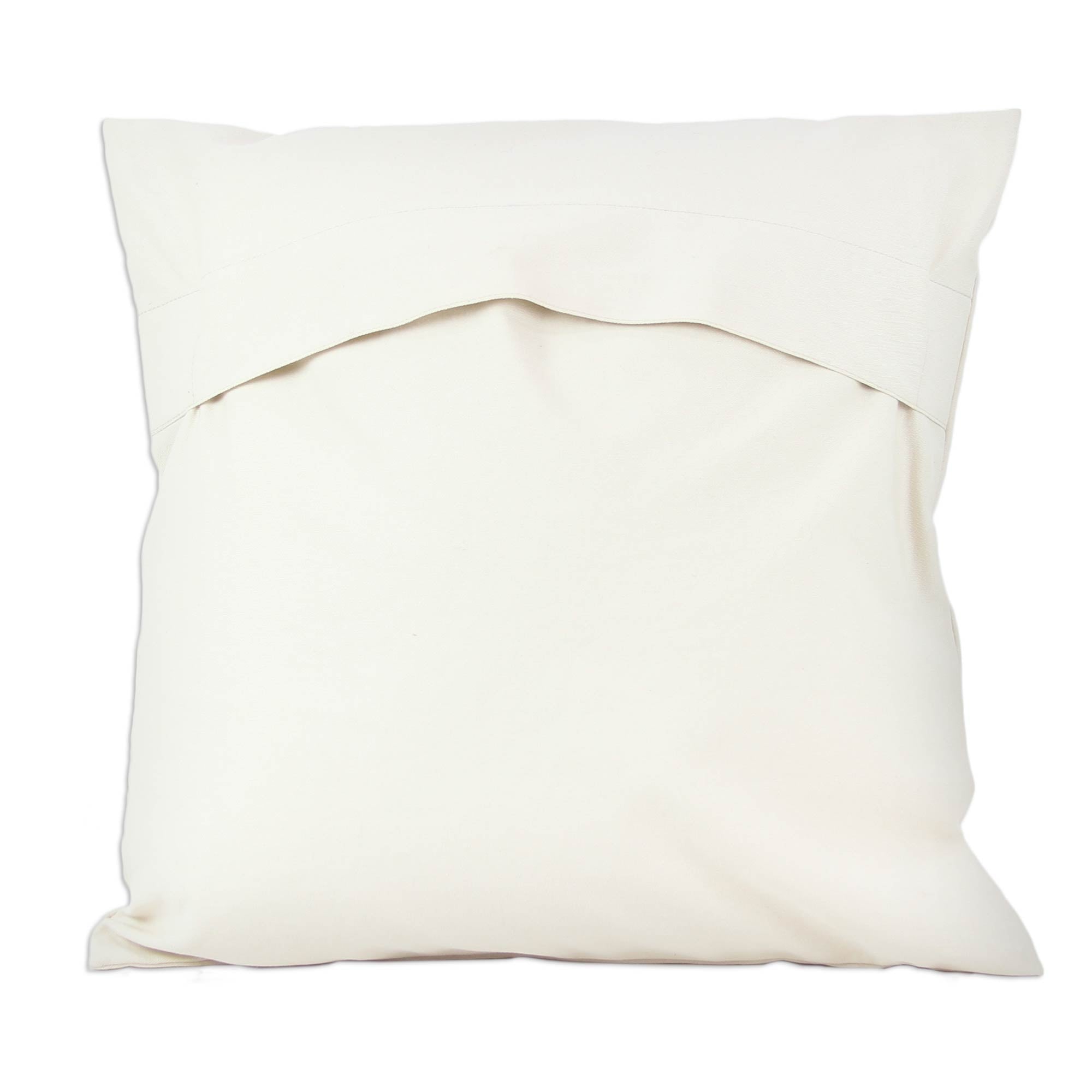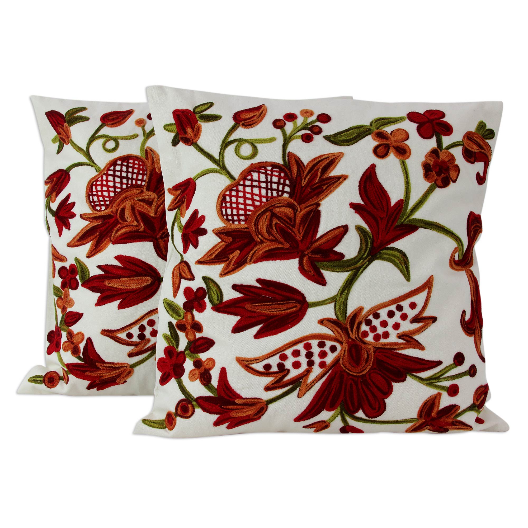 Beautiful blossoms in orange, red and burgundy reveal the intricacy of India's traditional aari embroidery. Lavishly machine-embroidered, these cushion covers are designed by Amit Moza. A slit opening at the back permits insertion of the cushions, and the reverse side is solid ivory.