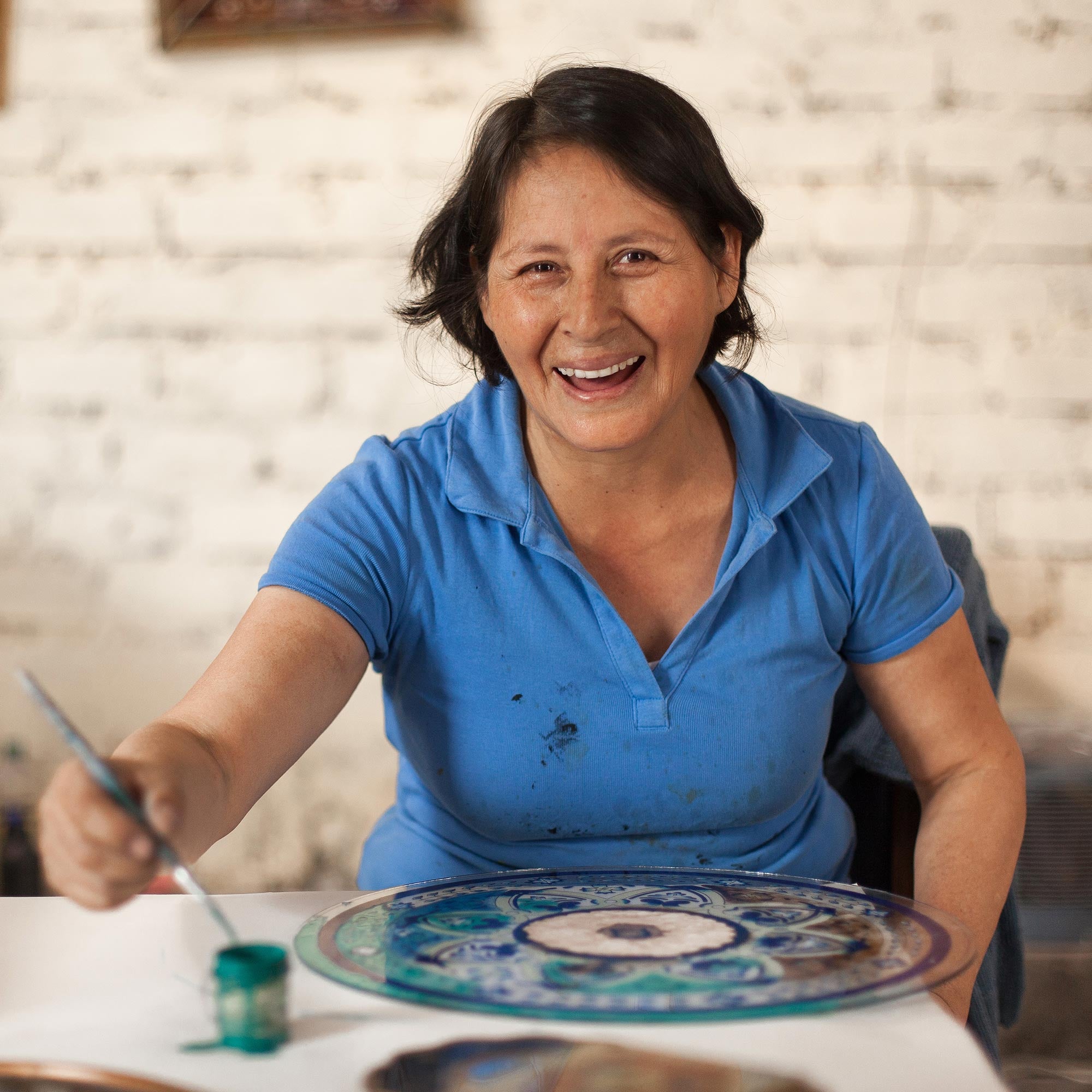 Expert in the Peruvian art of reverse painted glass, Asunta Pelaez creates a wall mirror of antiqued elegance. She hand-paints the mirror frame with floral motifs, creating a weathered illusion accentuated by aged golden and caramel hues.