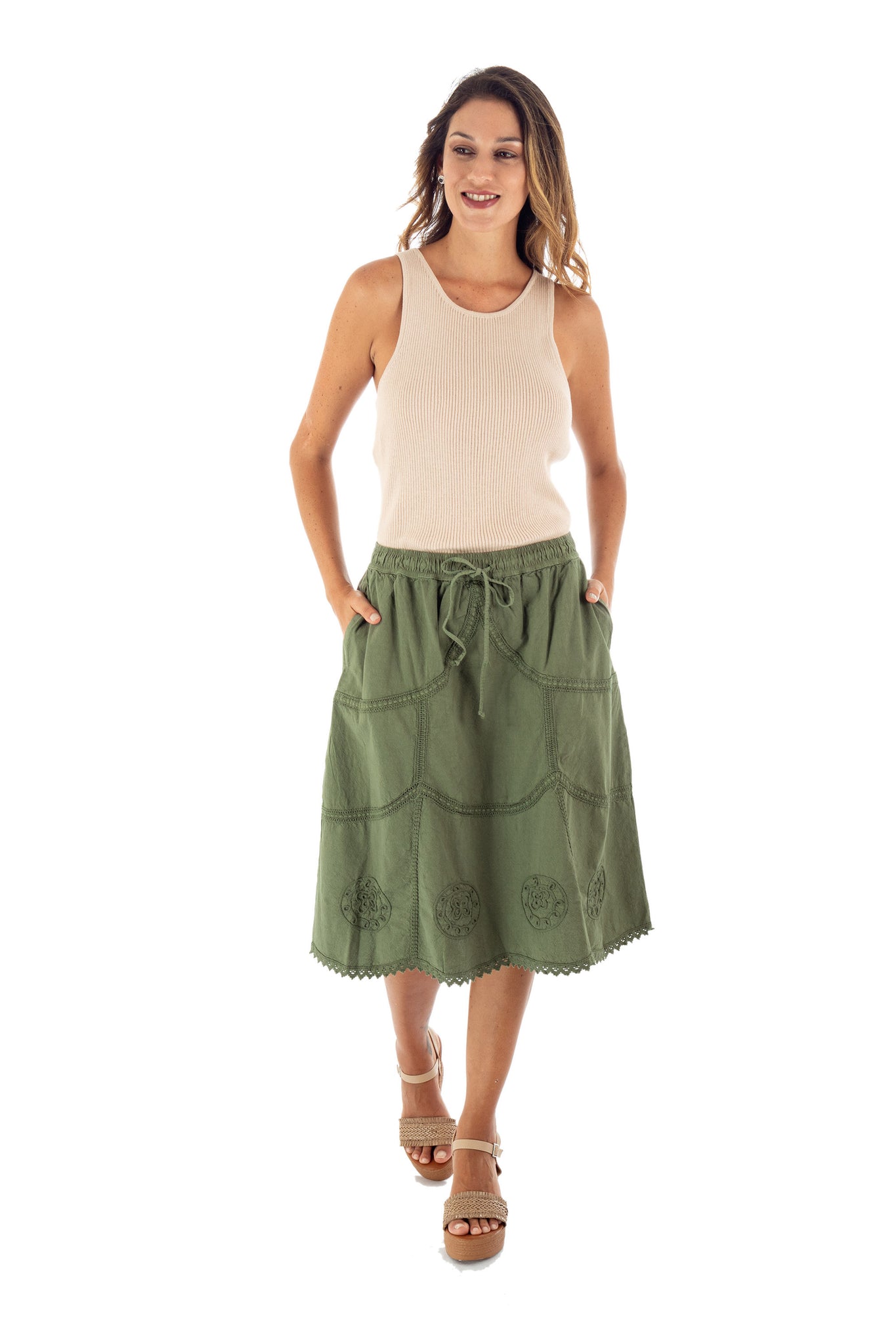 Dress up a pair of white sneakers or a simple t-shirt with this lightweight cotton skirt. Antonio Cajahuanca designs and crafts it in a laurel green cotton with embroidery, lace trim, side seam pockets and a convenient adjustable drawstring waistband.