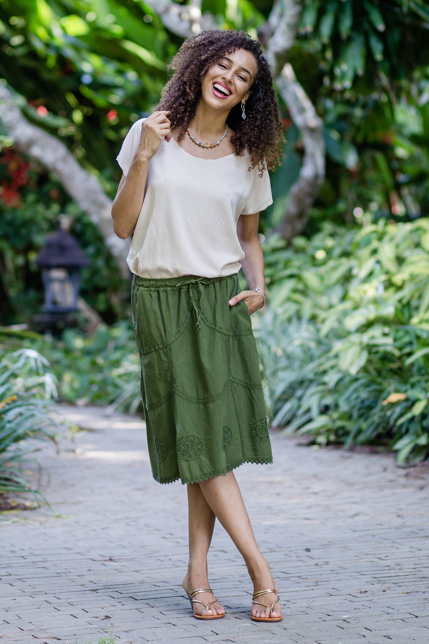 Embroidered Laurel Green Cotton Skirt from Peru - Andean Fields | NOVICA