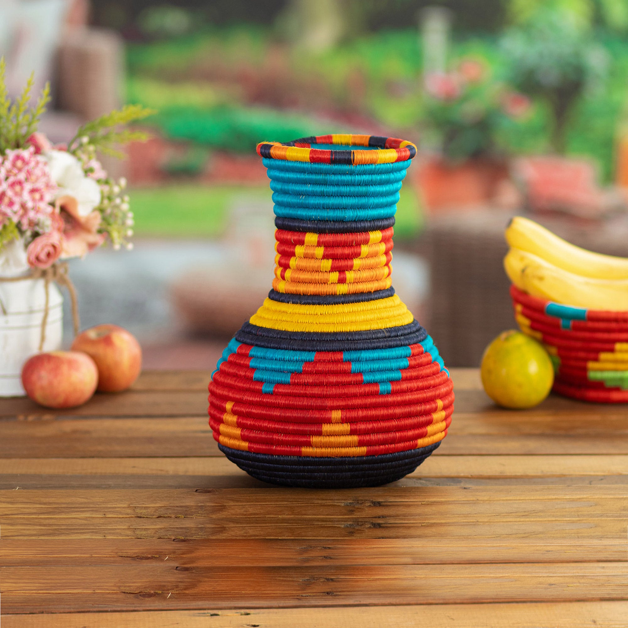 Steep peaks recall the Sierra Madre range that runs through Northern Colombia. Omaira Manrique brings the images to this stunning decorative case. She works in the hallmark style of Guacamayas, coiling cabuya and reed grass fibers in vivid rainbow colors.