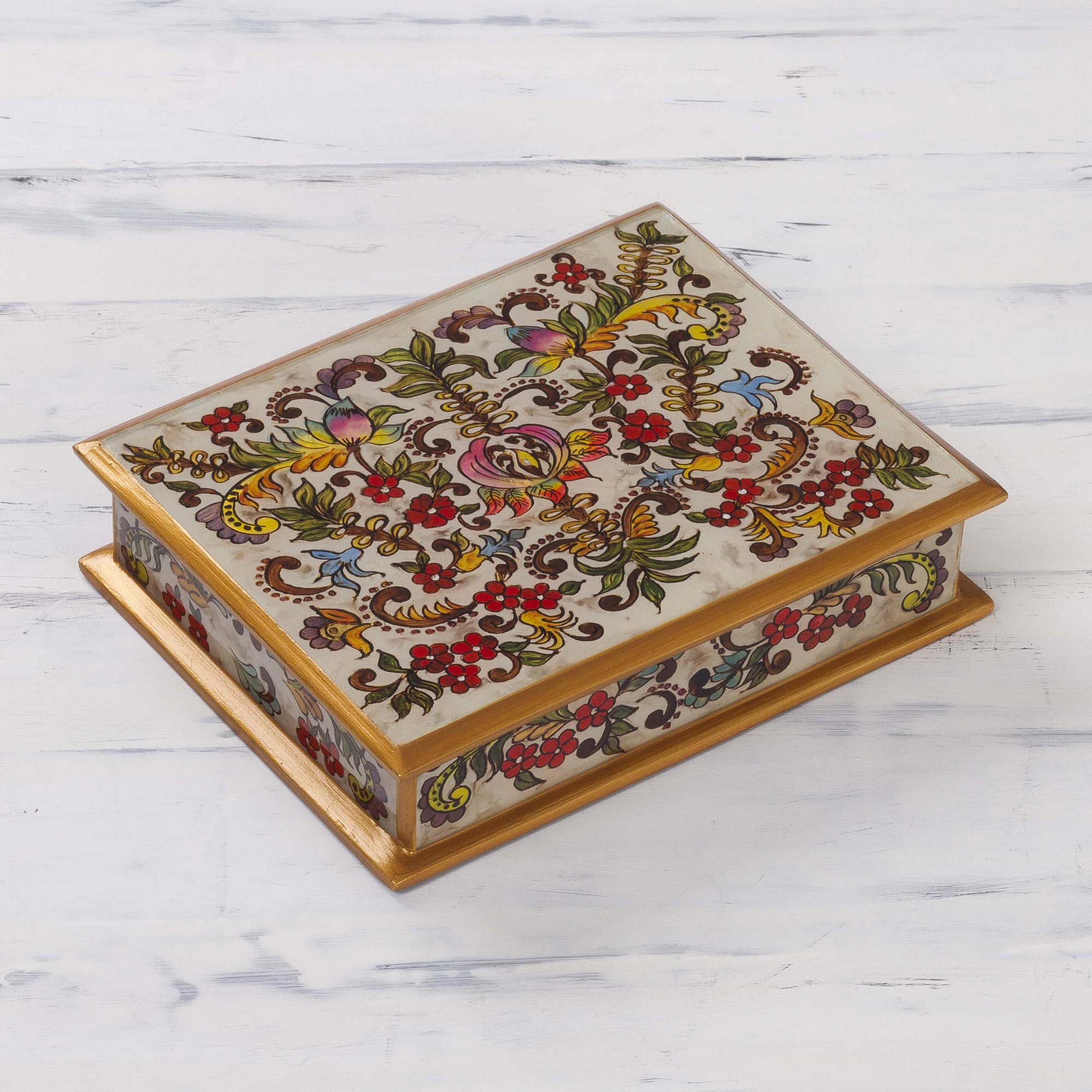 A colorful palette represents the vast variety of flowers in an Andean garden. Painted on the reverse side of glass panes, the motifs cover a beautiful box by Felicita Espinoza. Gilded borders add elegance to the hand crafted coffer.