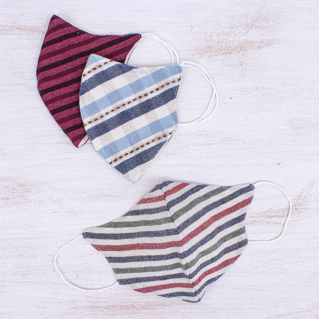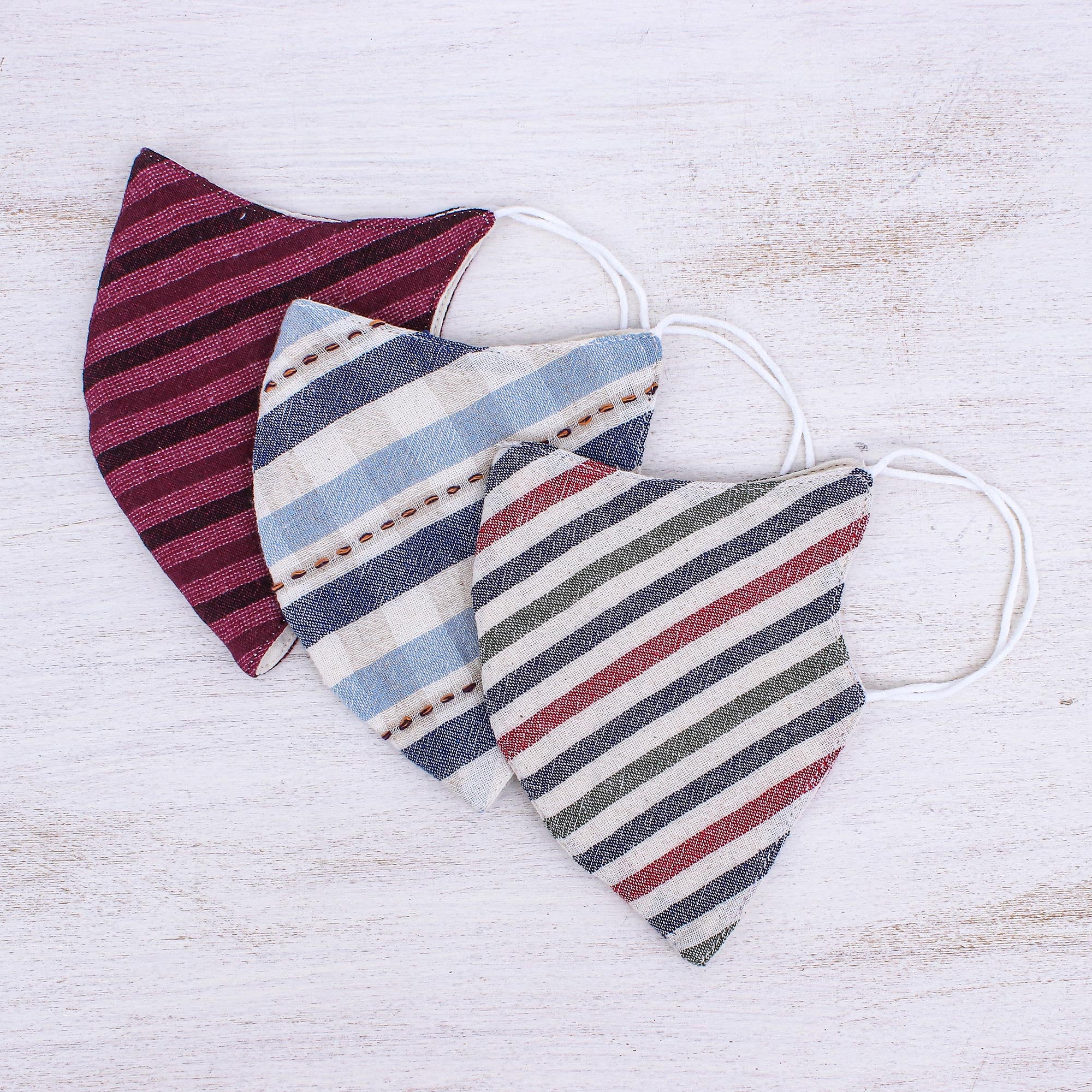 Modern colors and patterns distinguish a trio of face masks for today's needs. Cotton stripes in navy, green and red on white, and in magenta fond a complement in blue and navy plaid. All three become contoured masks with three layers of fabric, including a double layered cotton lining with an opening so you may insert a protective layer of tissue or paper towels. All are both washable and reusable, and feature elastic to loop over the ears.