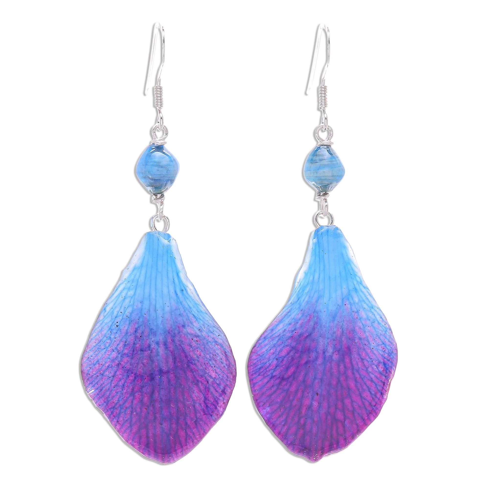 Presented by Danai in Thailand, these pretty earrings are crafted with natural flowers. The blue petals are from actual dendrobium orchids; their beauty is preserved forever in a coating of resin. Blue pearl-like beads above the petals are made from eco-friendly paper that is crafted from cleaning and dyeing elephant dung fiber. The earrings swing from sterling silver hooks. Please expect the color and size of flower petals to vary.