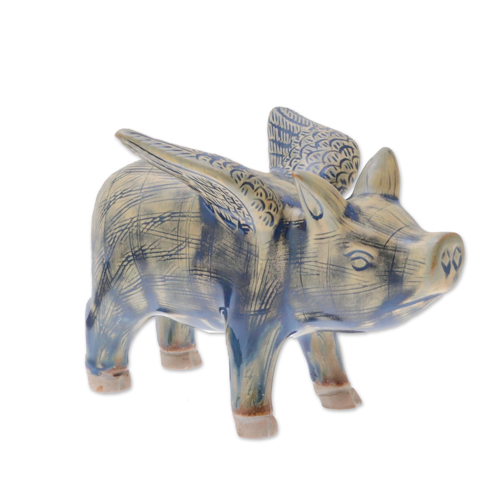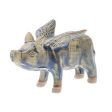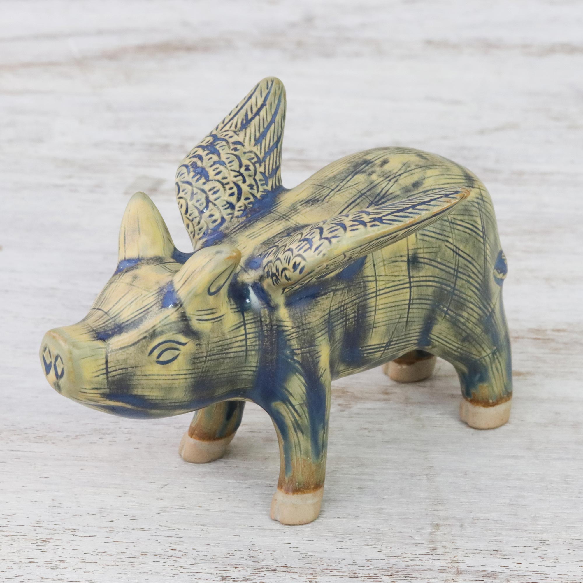 Duangkamol affirms that pigs can fly with this charming figurine. Working in fine celadon ceramic, she crafts a pig with wings. Yellow-green glaze is accented by blue details.