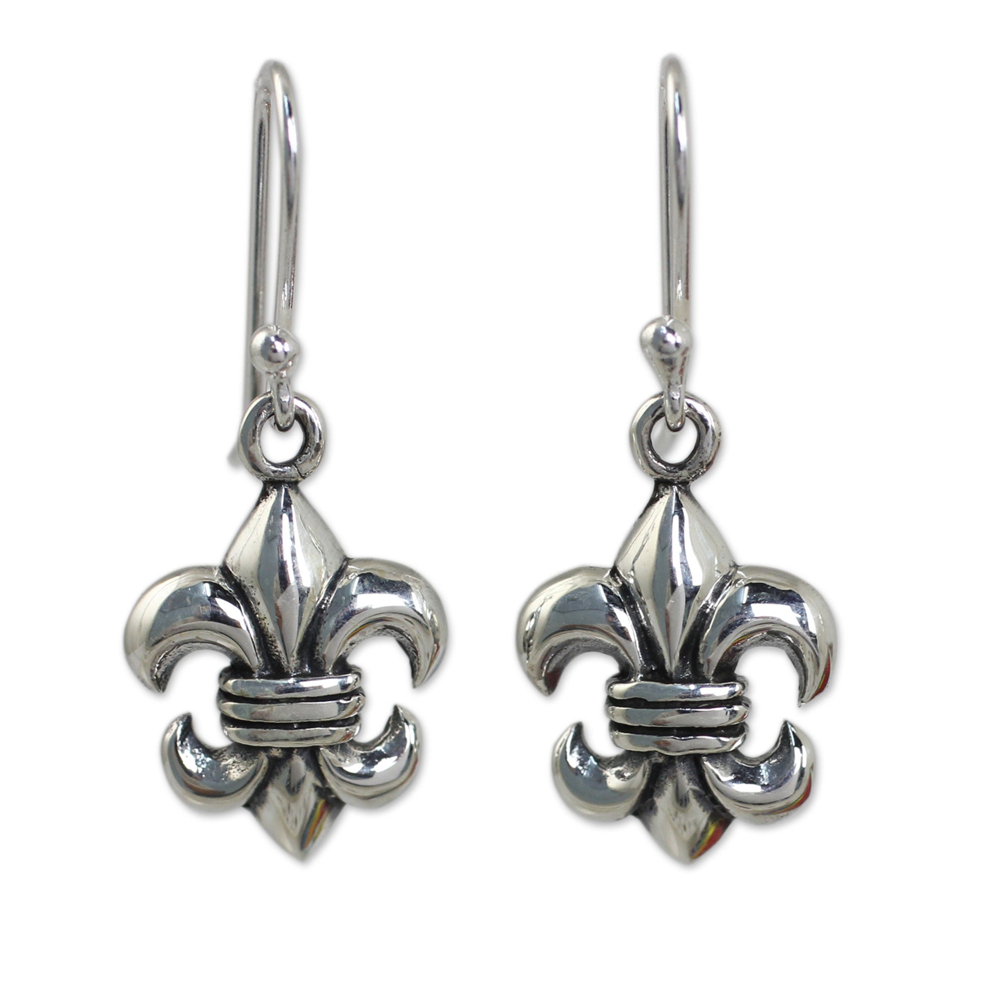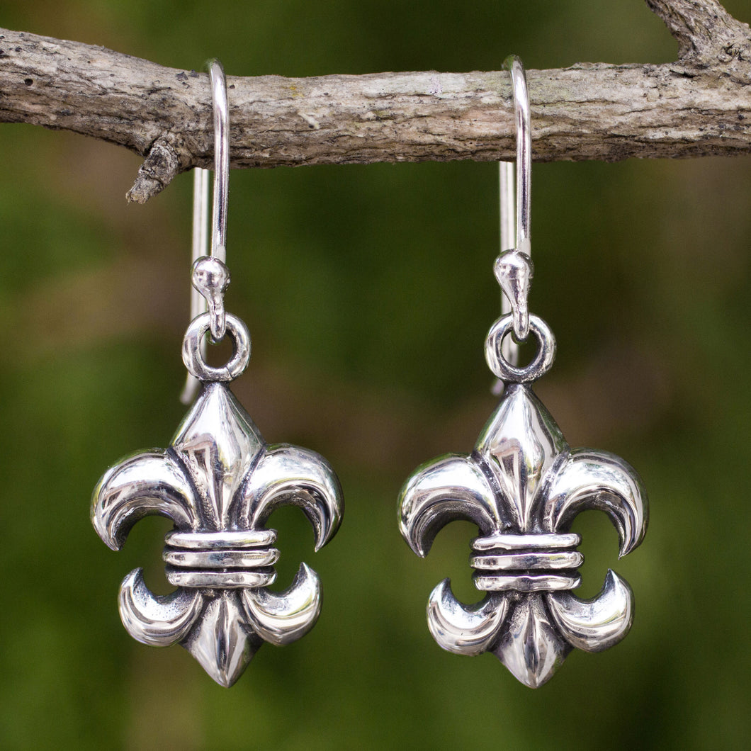 The stylized lily known as the fleur-de-lis is featured in these dangle earrings from Wadarat Supasirisuk of Thailand. The earrings are crafted from polished sterling silver with oxidized accents that add depth to the design.