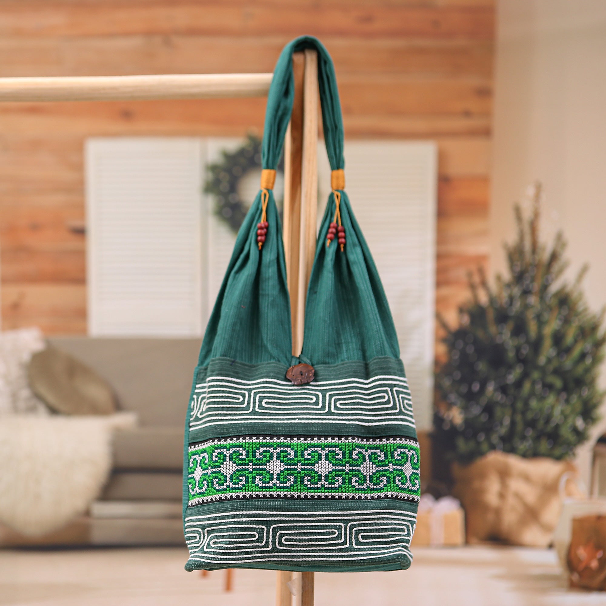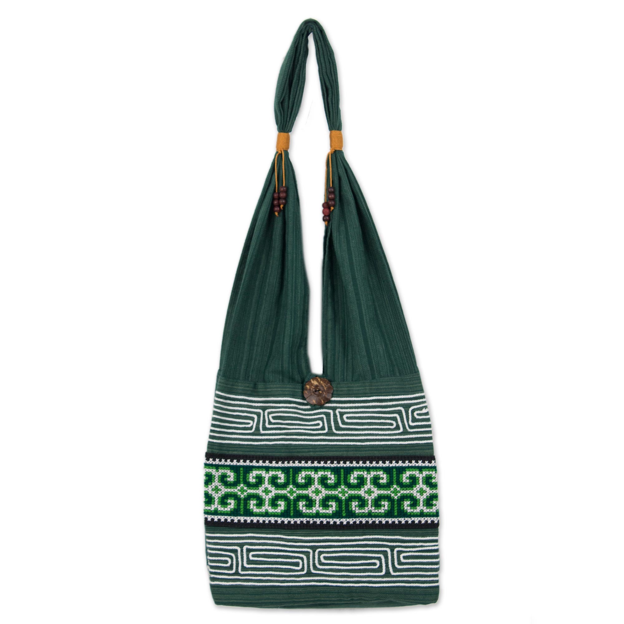 Jiap Rojjana designs a cotton sling bag in lush emerald green. The bag is adorned with embroidered motifs in white, green and dark red color as well as white cotton coiling. The sling bag features a solid black lining and a zipper pocket. The bag fastens with a coconut flower button.