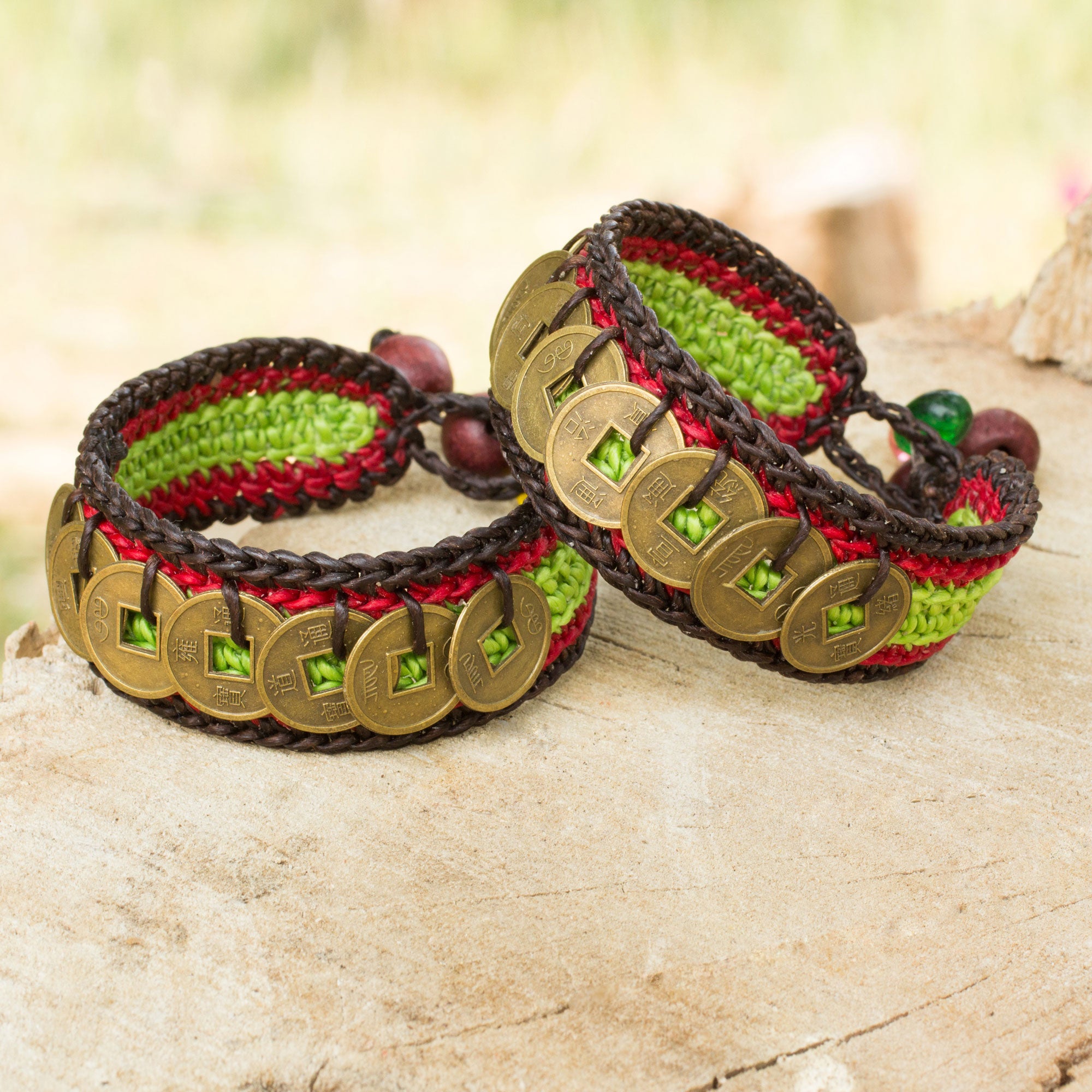 Thai designer Tiraphan Hasub conjures mystical elegance with the design of these crocheted bracelets. She works with brass replicas of the legendary Chinese coin, believed to bring wealth and success according to Feng Shui practices. The bracelet's colorful threads are centered by green, symbol of health, harmony and nature. Hasub includes rain tree wood and glass beads for the bracelets' clasps.