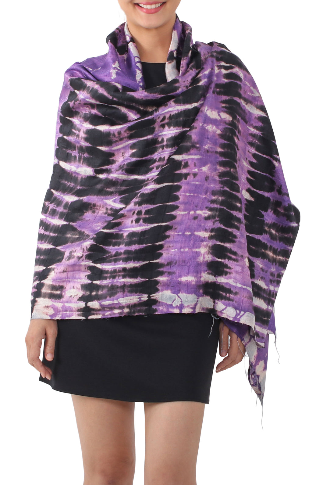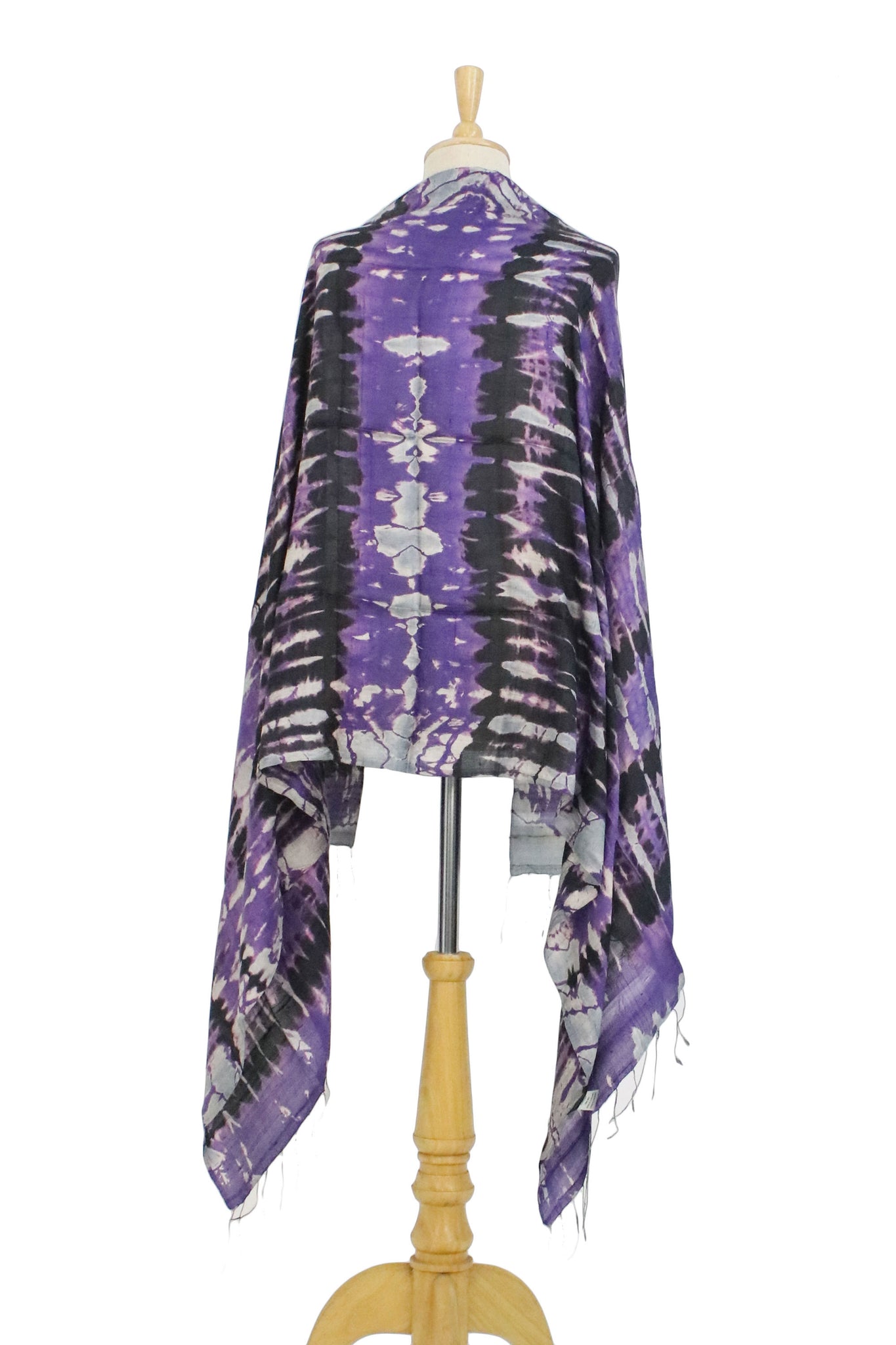 Imperial purple and black tie-dye makes this shawl into an eye-catching piece of art. Vinita hand-spins and weaves the silk to create the shawl, with a grey fringe at the end for added decoration.