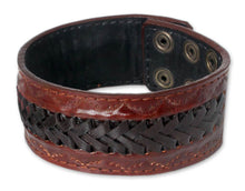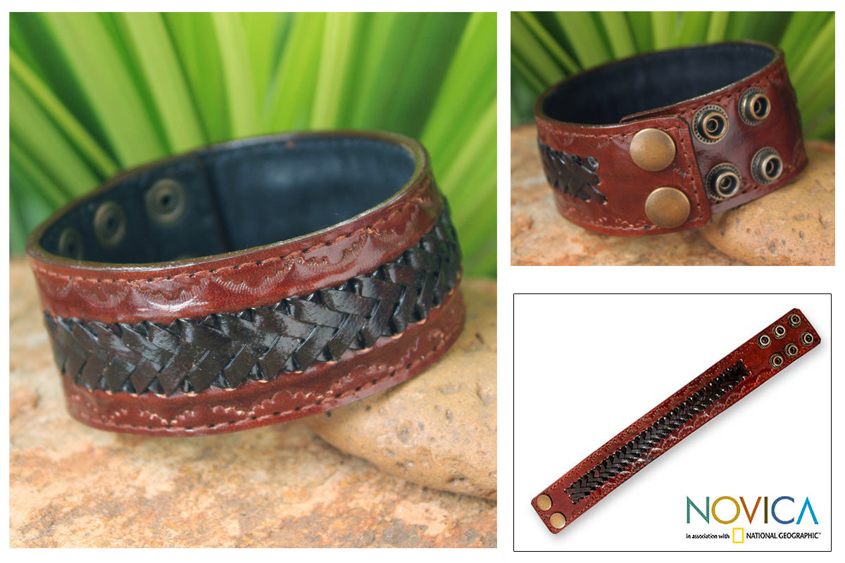 Trendy and handsome, this men's design features leather in black and brown. Chaloemphon crafts the wide men's wristband by hand, adding brass snaps to adjust the bracelet's length.