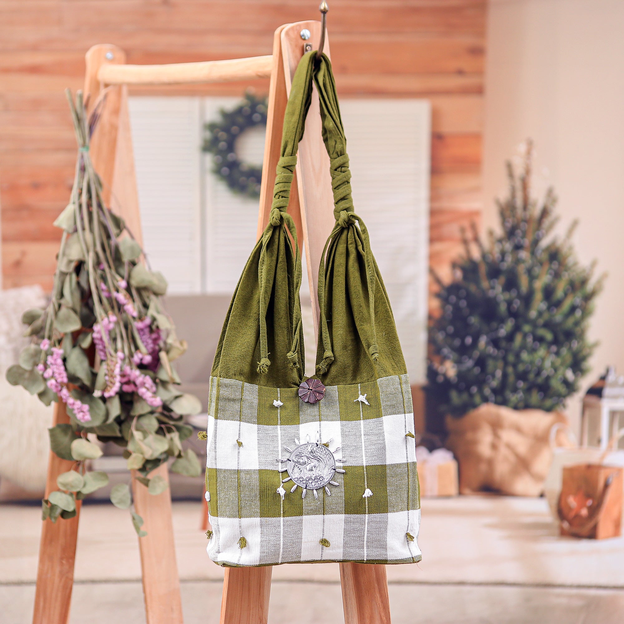 Working in green plaid cotton, Jiap Rojjana designs a generous sling tote shoulder bag. A cheerful elephant symbolizes Thailand, depicted in a repoussé medallion. The purse closes with a coconut shell button while an inner pocket with zipper keeps small items handy.